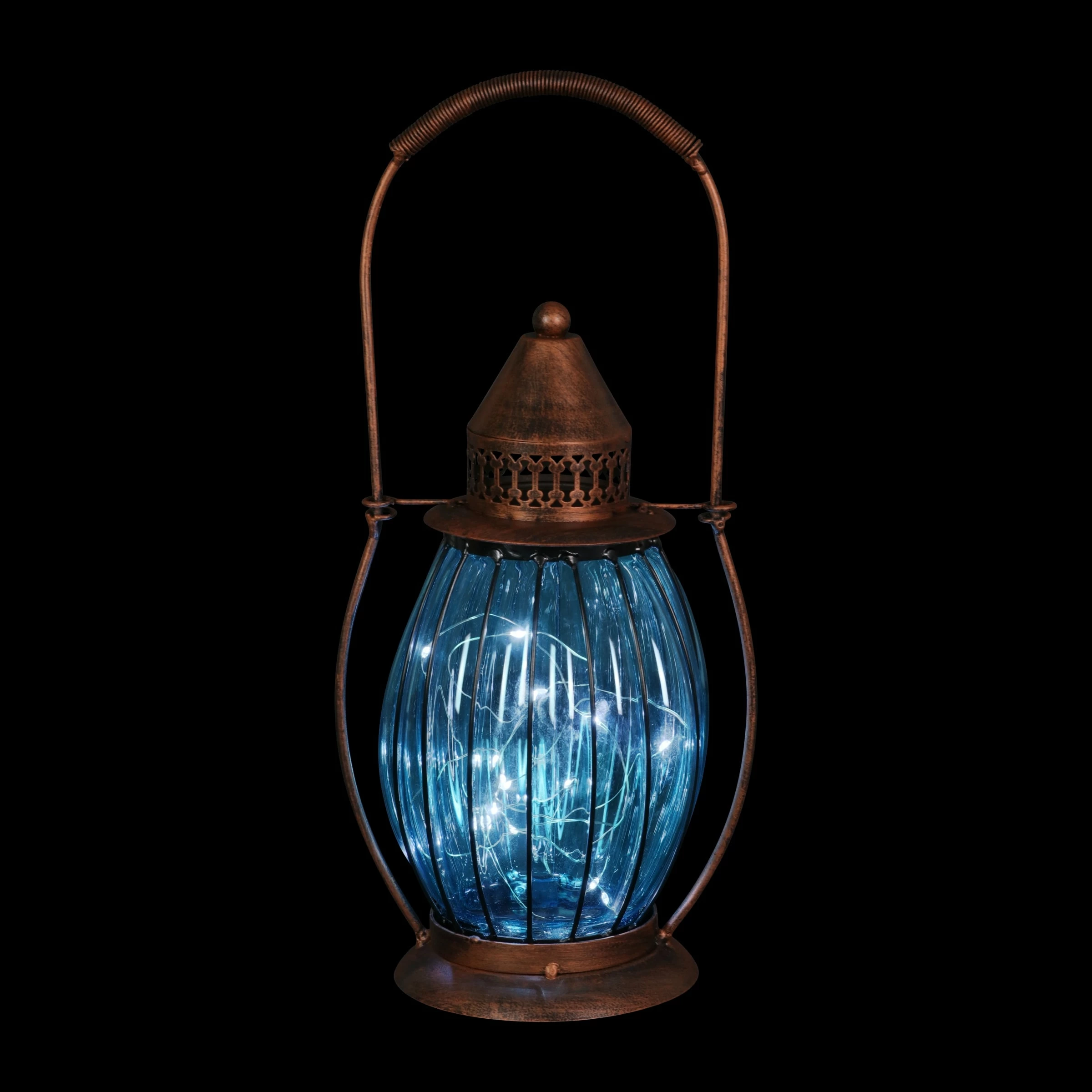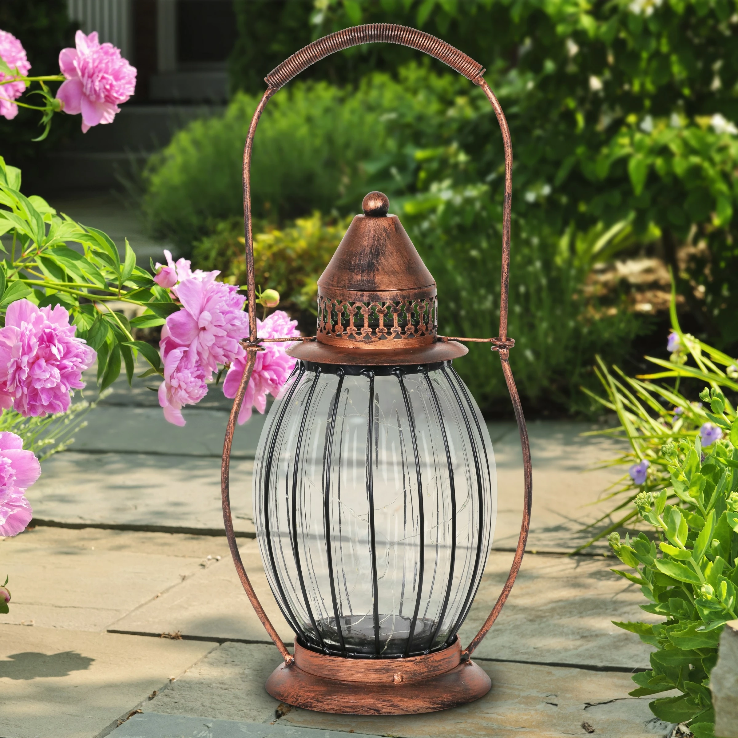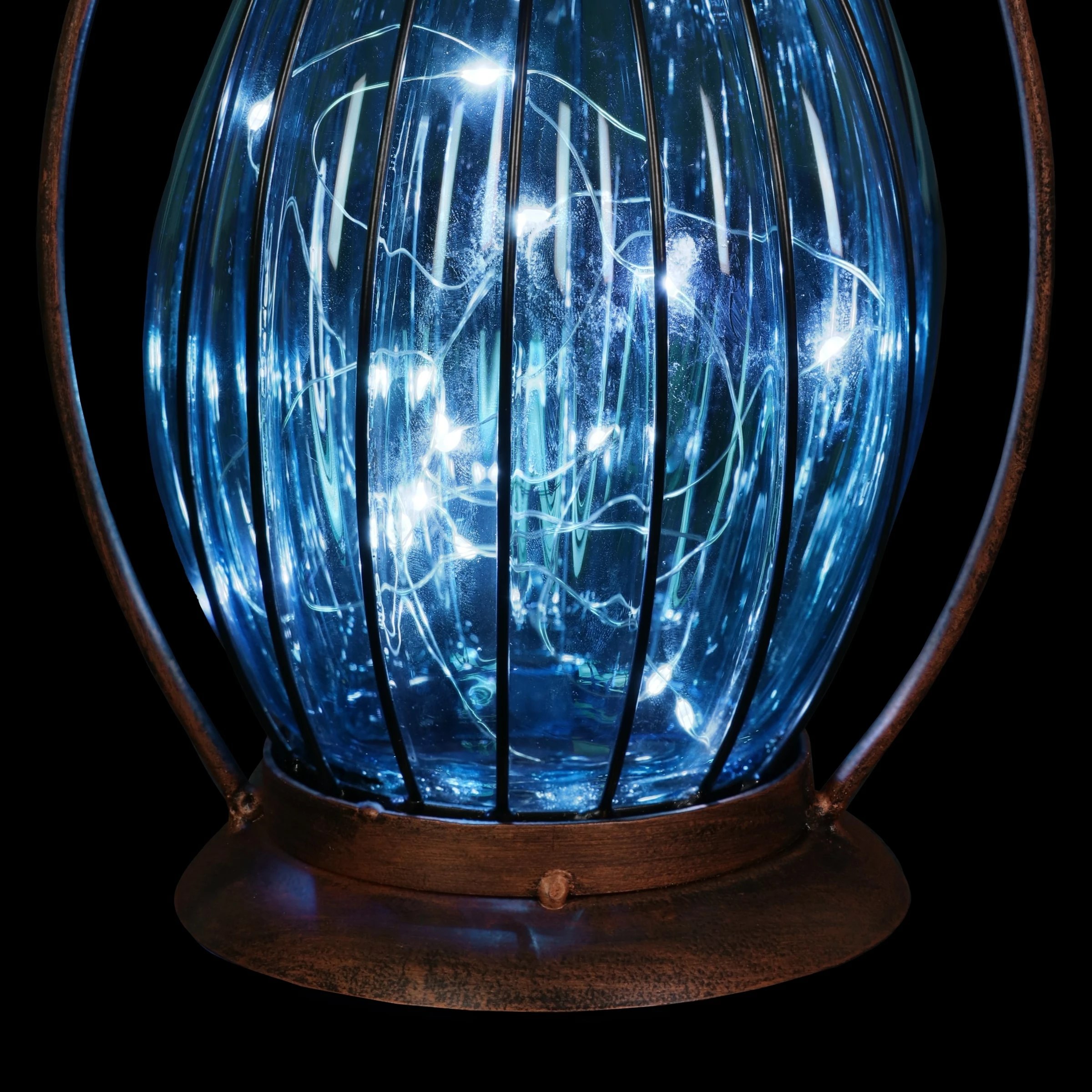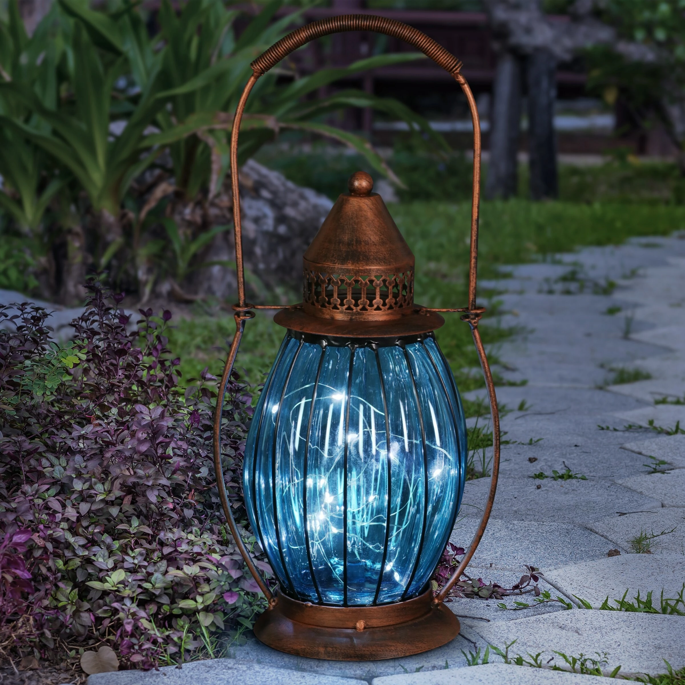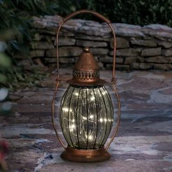 Add a charming touch to any outdoor space with this solar antique metal and glass lantern. Fifteen firefly LED lights will automatically illuminate at dusk adding a magical glow to your garden! Framed by a classic metal design with a handle, this beautiful piece makes an enchanting decorative light.