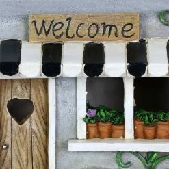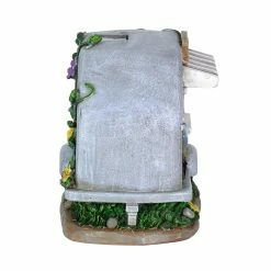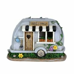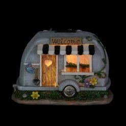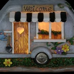 You are always welcome in this charming hand painted solar Camper Garden Statue! With its flowery vine, wooden front door and black and white awning, this statue brings a sense of fun and nostalgic charm to your garden! The solar powered light will automatically illuminate at dusk from within the camper, adding even more fun in the evenings. Makes a wonderful addition to any garden and a fantastic gift idea.