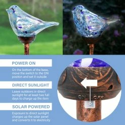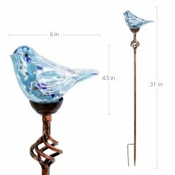 Let the sun shine through with this exquisite solar pearlized glass bird stake by day and enjoy its beautiful solar glow by night! While the gorgeous bird adds color and life to your garden, the spiraling metal finial adds an extra touch of elegance. Makes a thoughtful gift and a wonderful addition to any landscape. Exhart hand-blown glass pieces are one-of-a-kind and present with slight color variations.