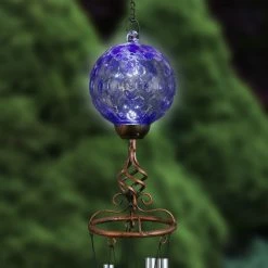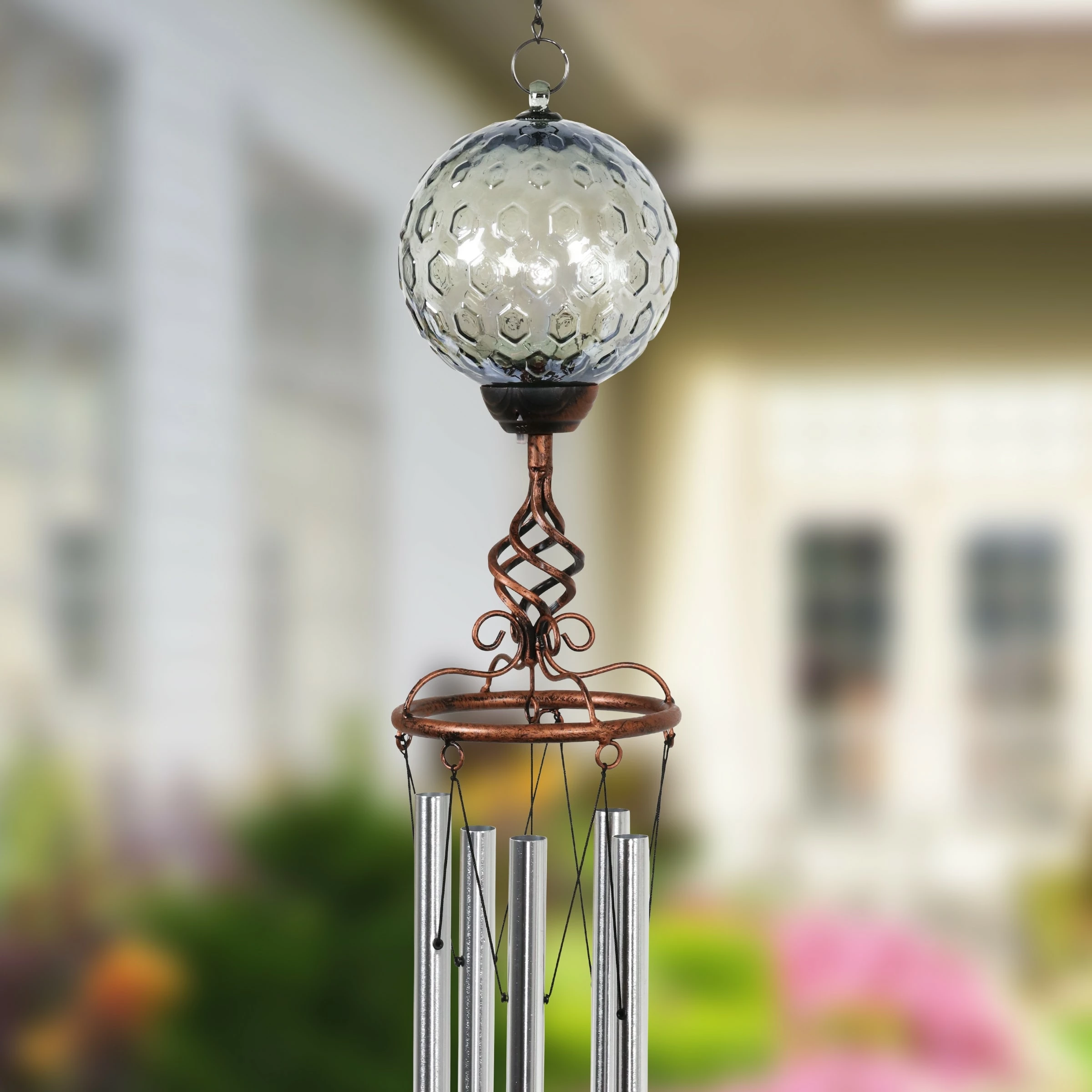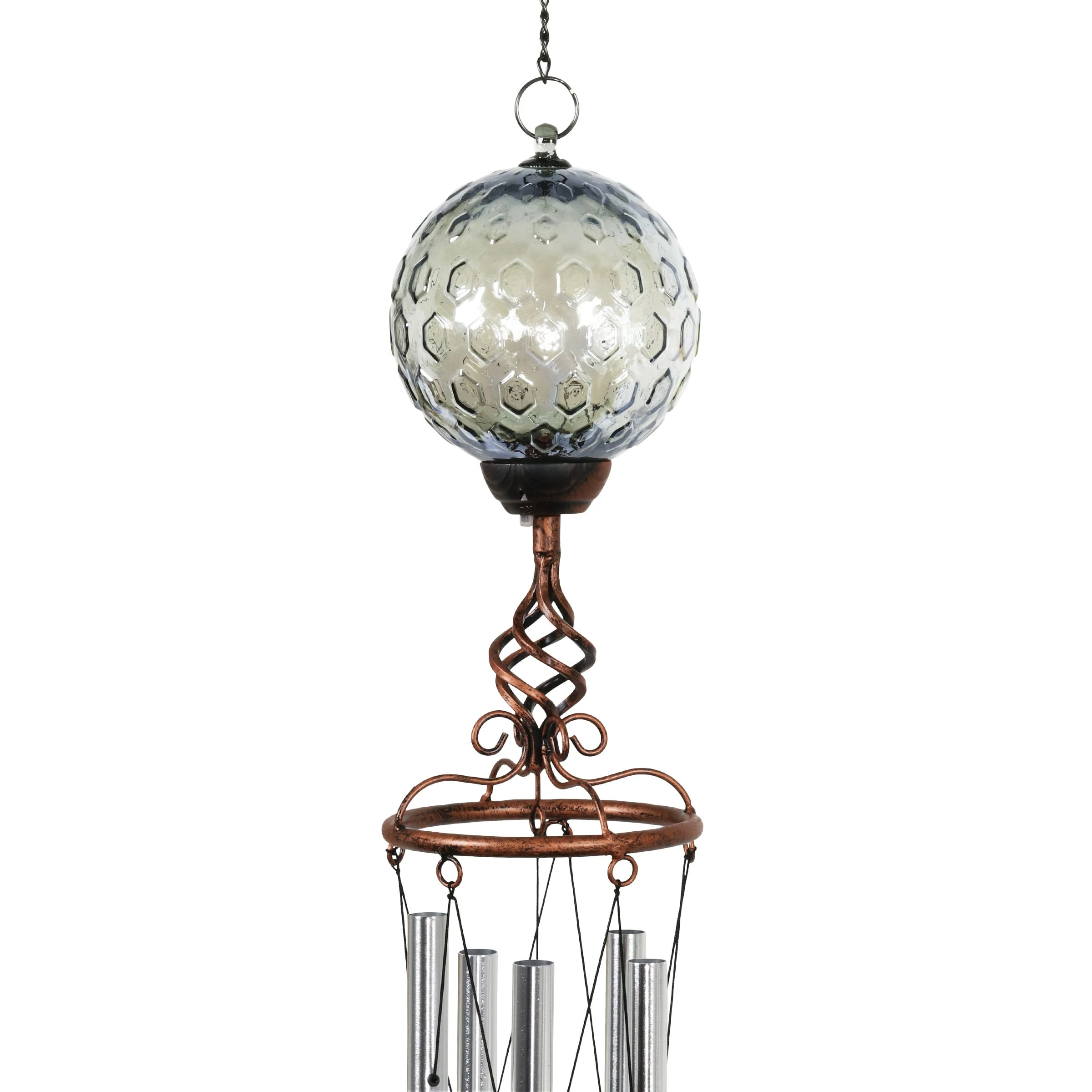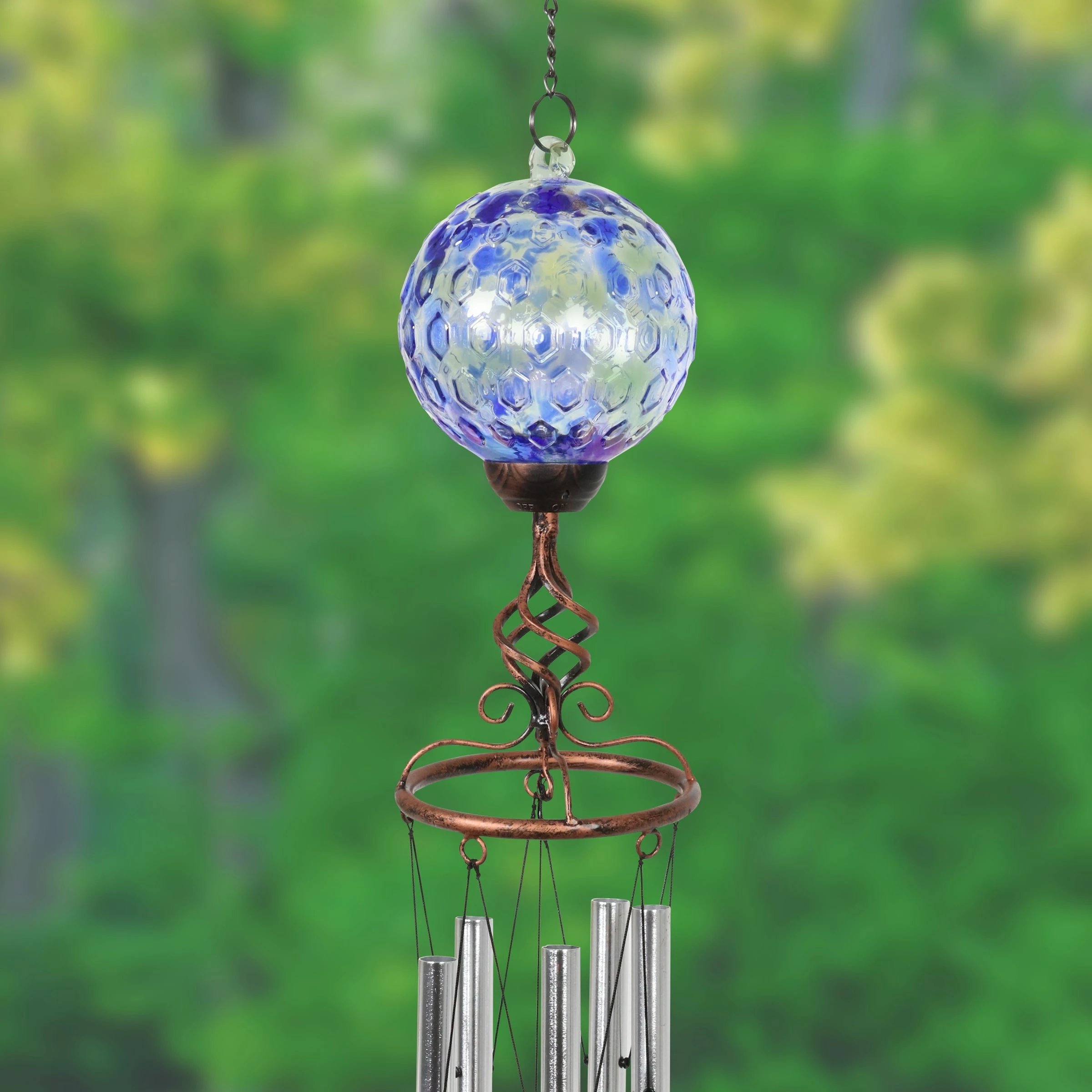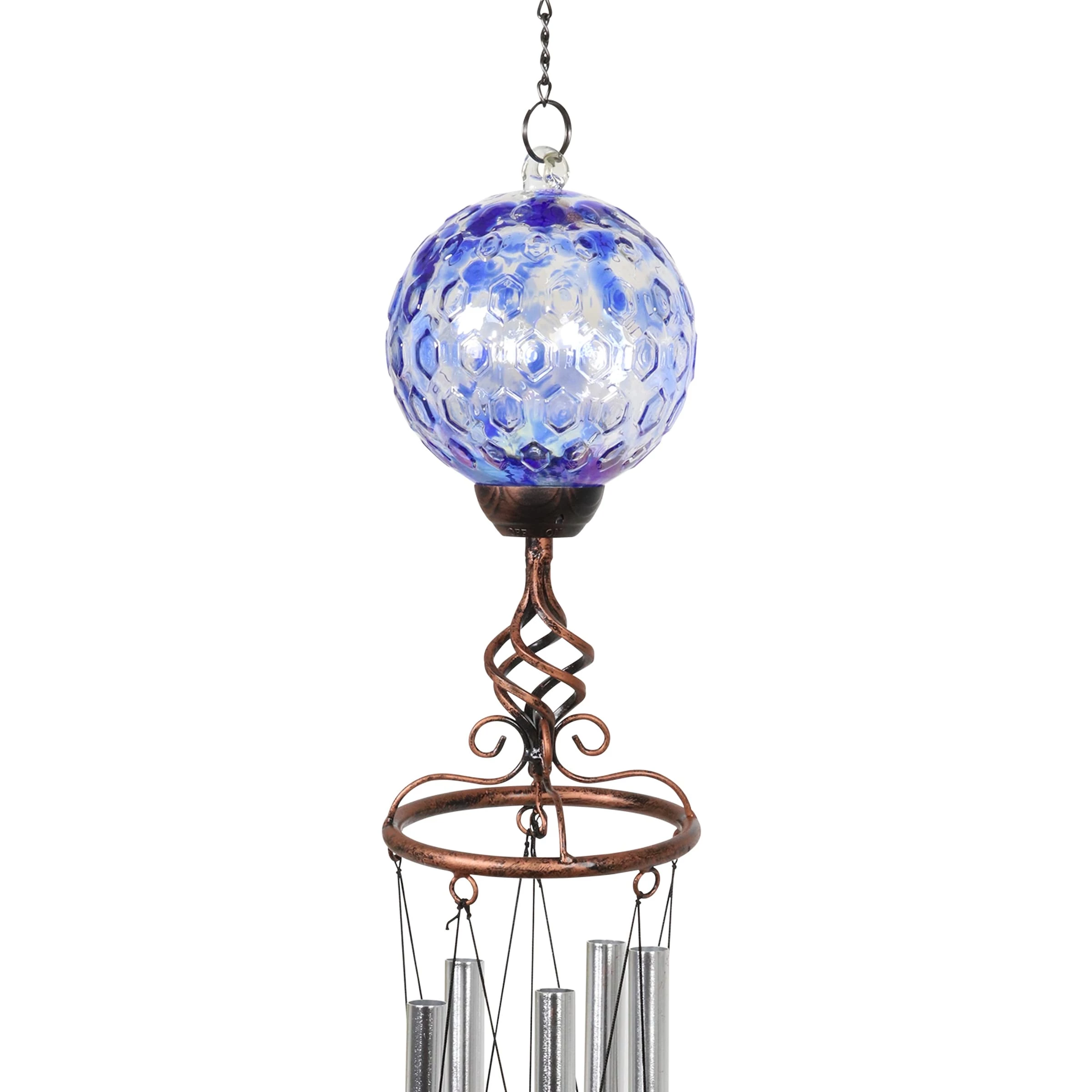 A gentle breeze sets off the relaxing sounds of this illuminating Solar Pearlized Honeycomb Glass Wind Chime. A delight for the senses, this elegant wind chime is stunning. The spiraling metal finial adds and extra touch of elegance. The solar light will automatically illuminate at dusk, adding a warm glow to your garden! Exhart hand blown glass pieces are one-of-a-kind and present with slight color variations.