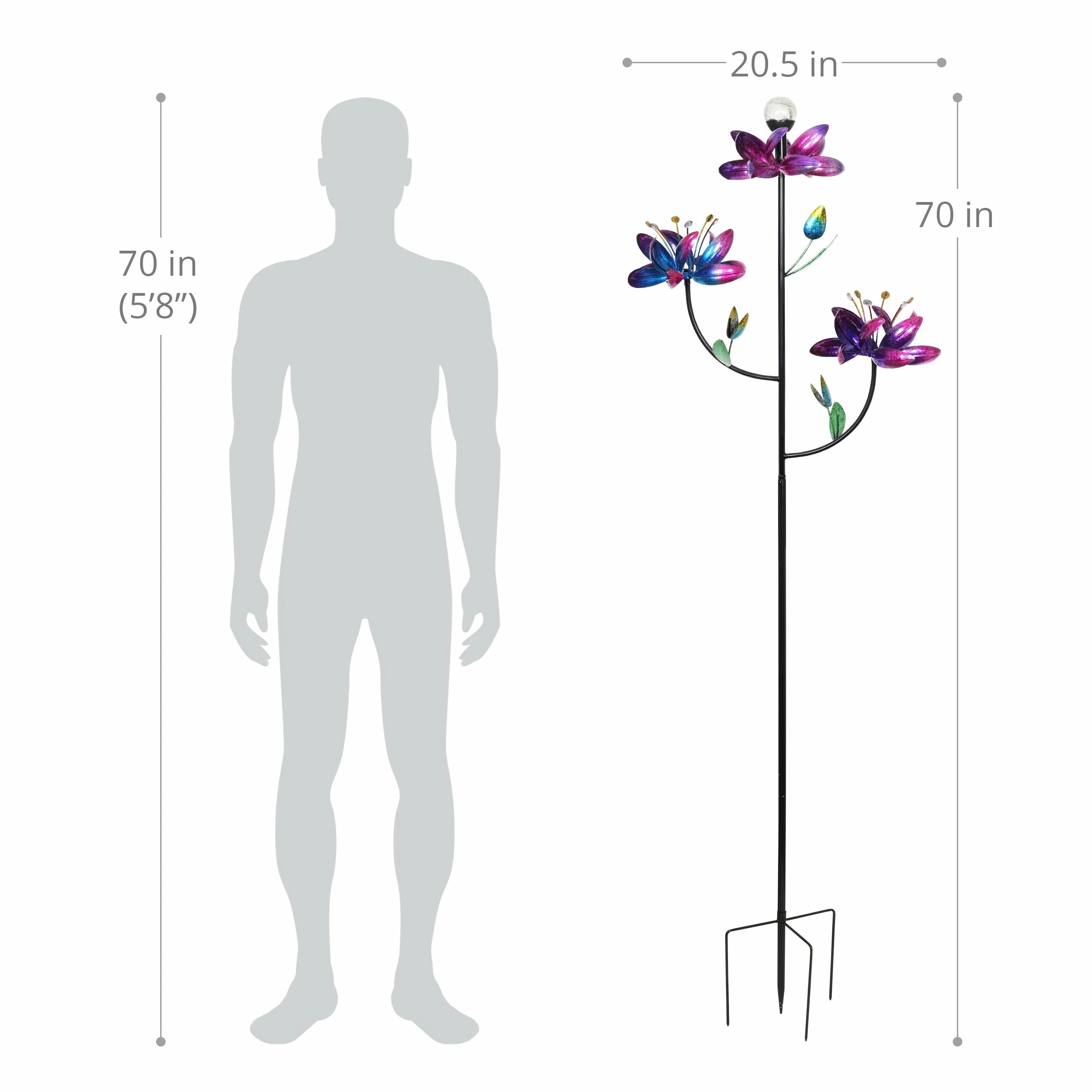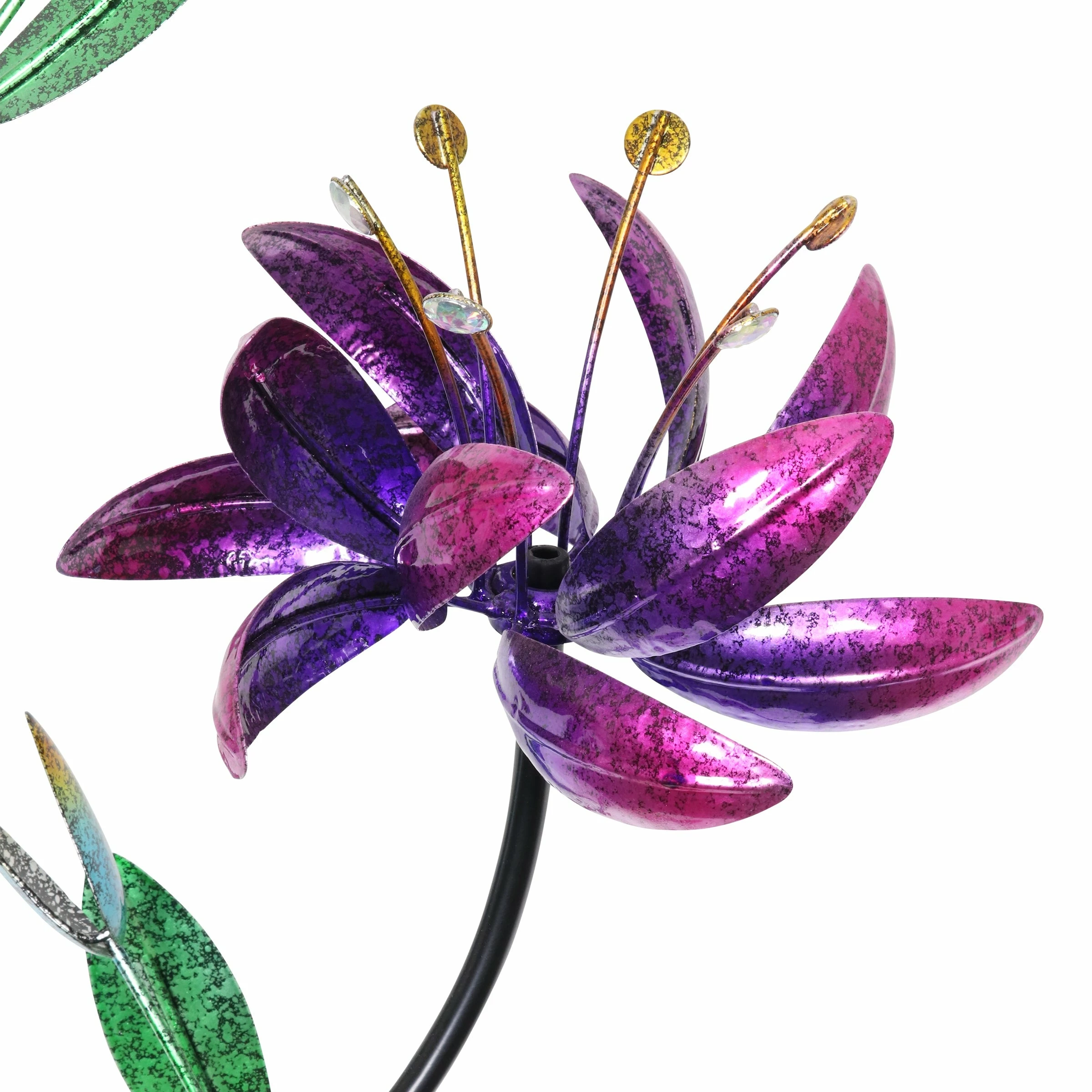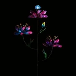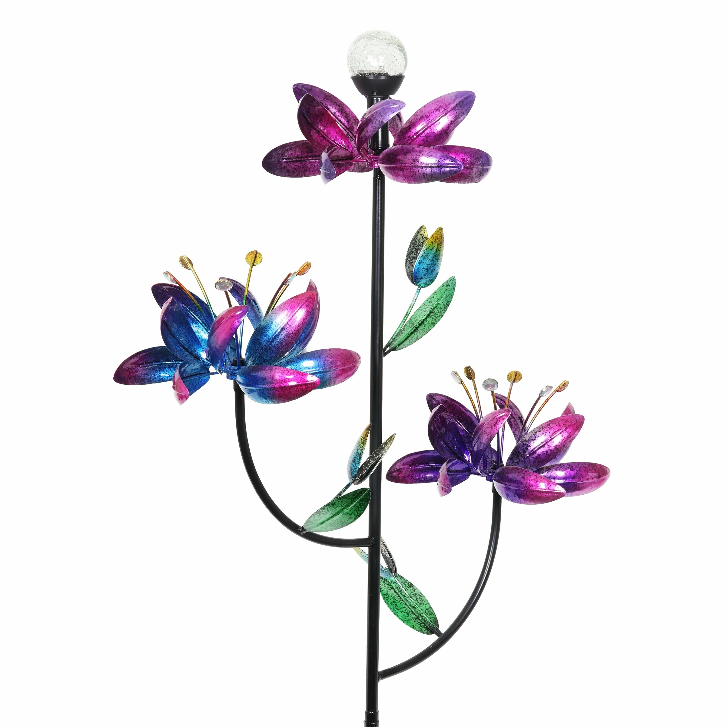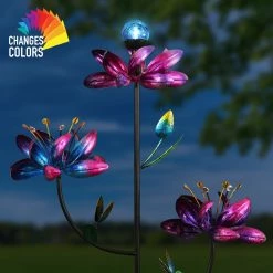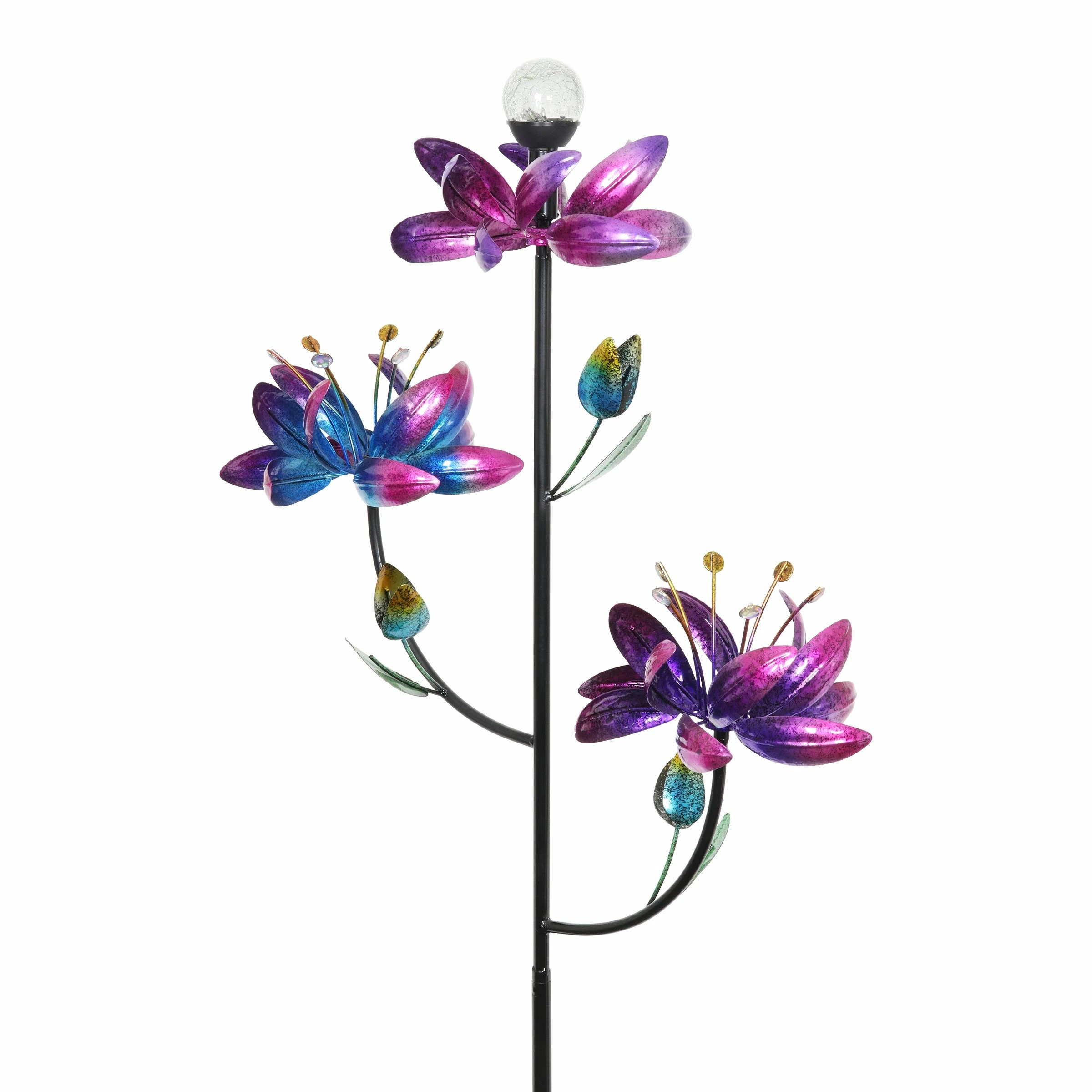 Swirling with color and light, this triple kinetic flower spinner breathes beauty and life into any garden! Adorned with a solar crackle ball, this piece of art will automatically illuminate at dusk for hours of color-changing fun. Beautifully hand-painted and hand crafted, this spinner will become a centerpiece of your yard or garden.