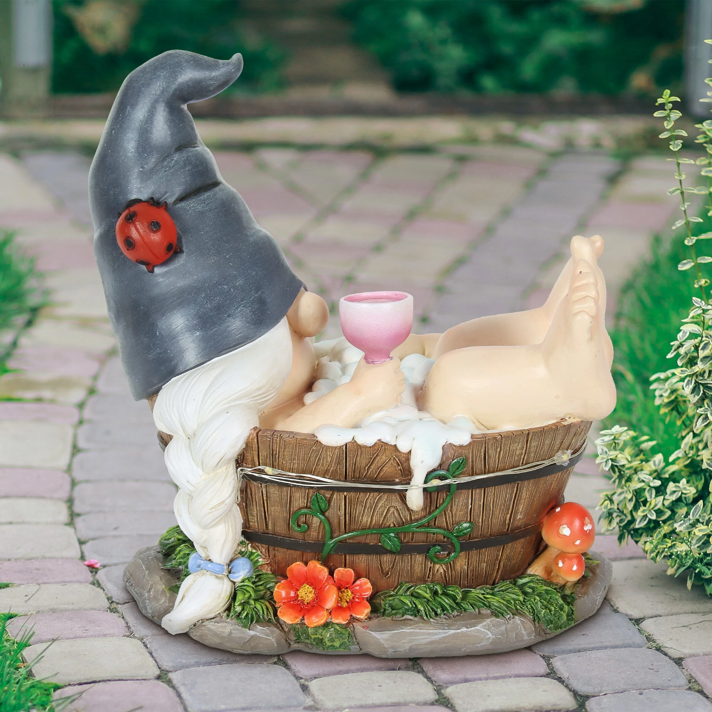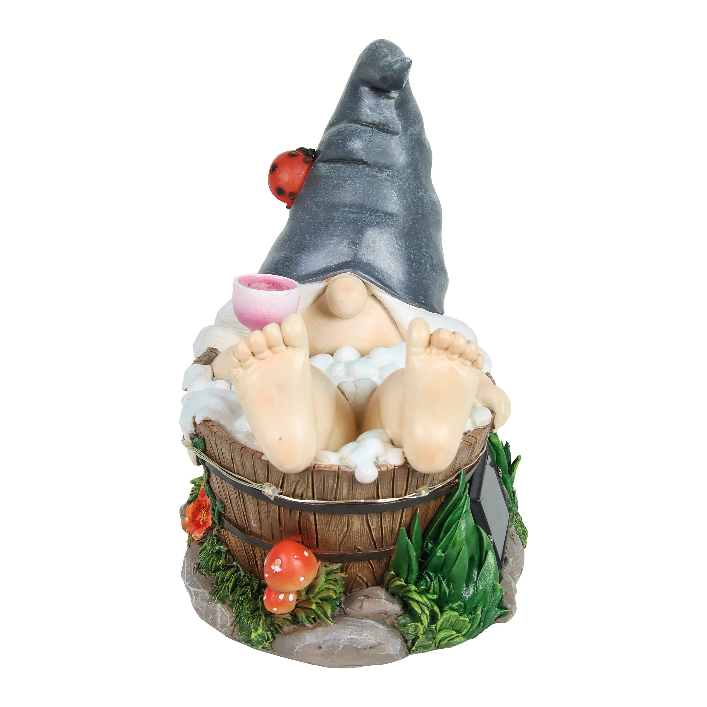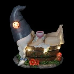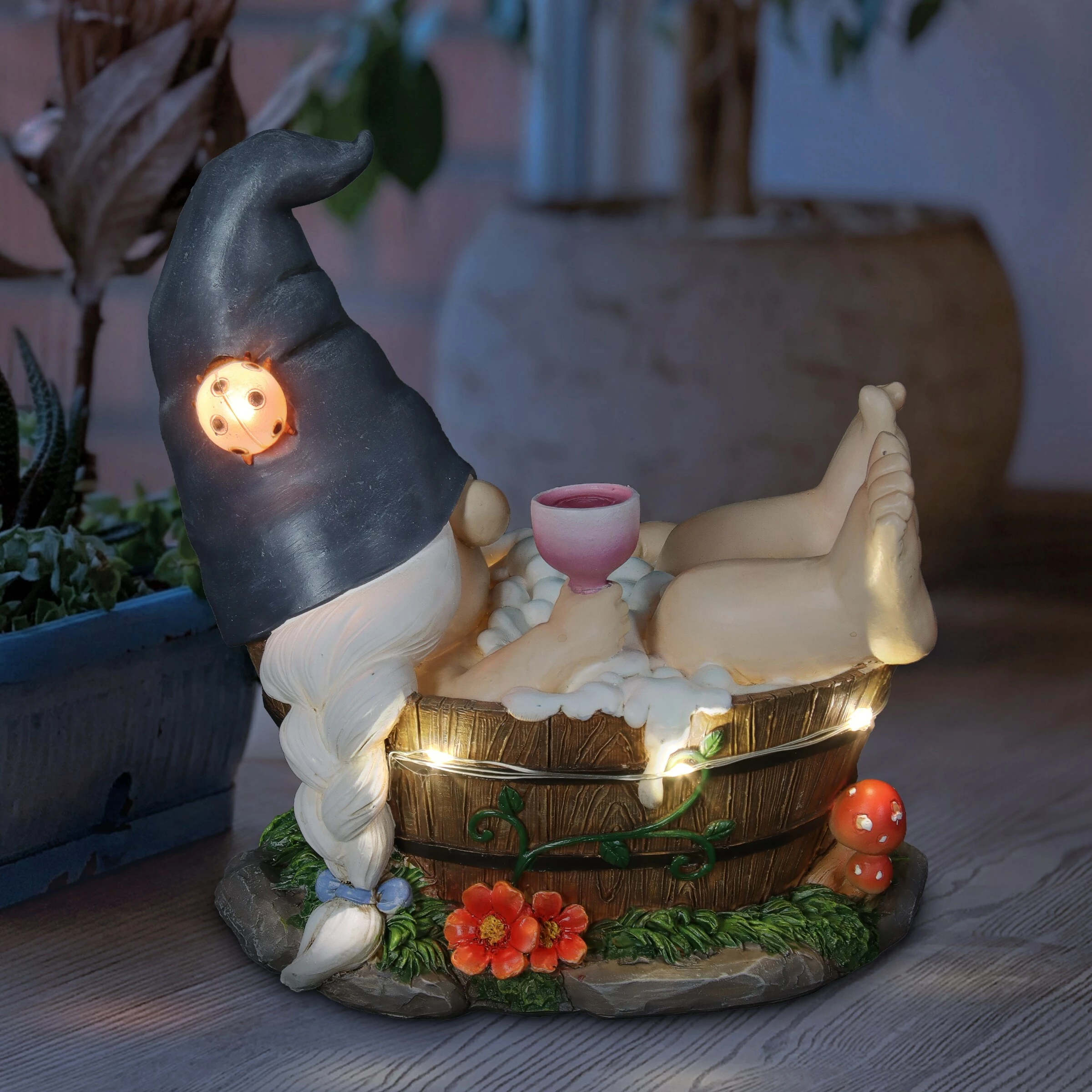 - LED light illuminates around the gnome’s bath and lady bug