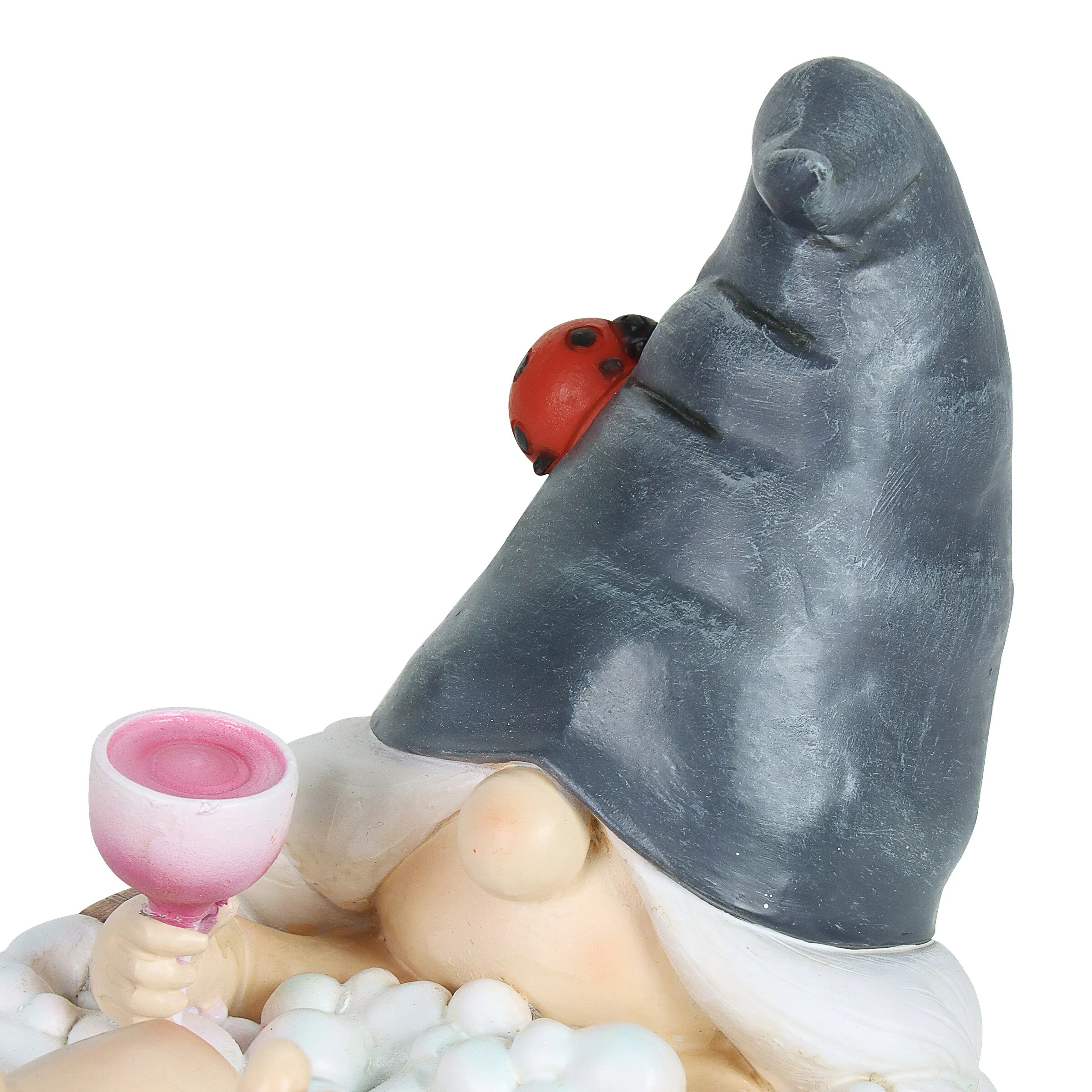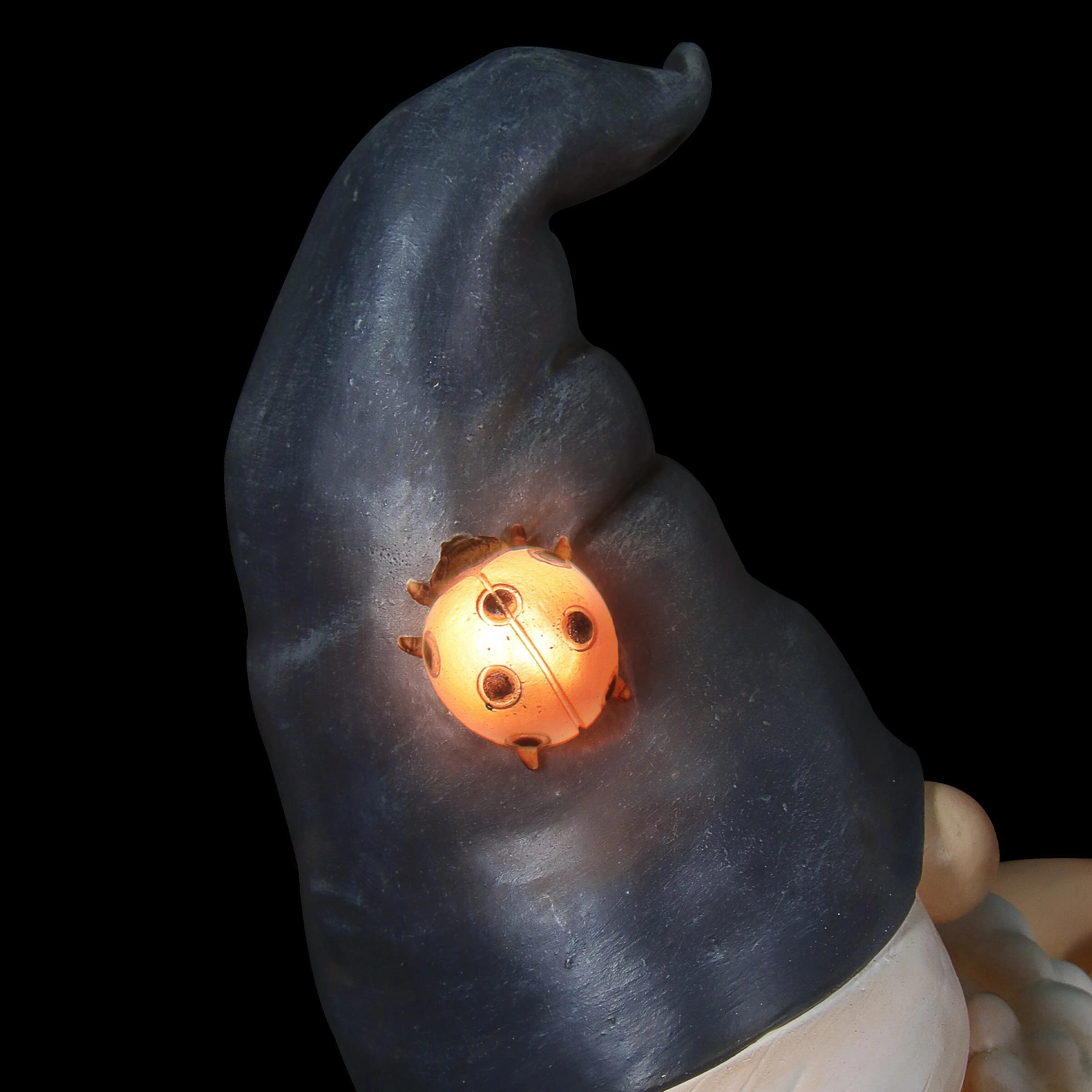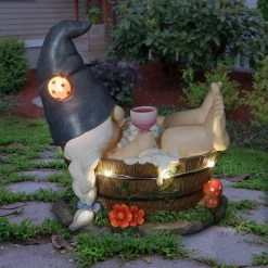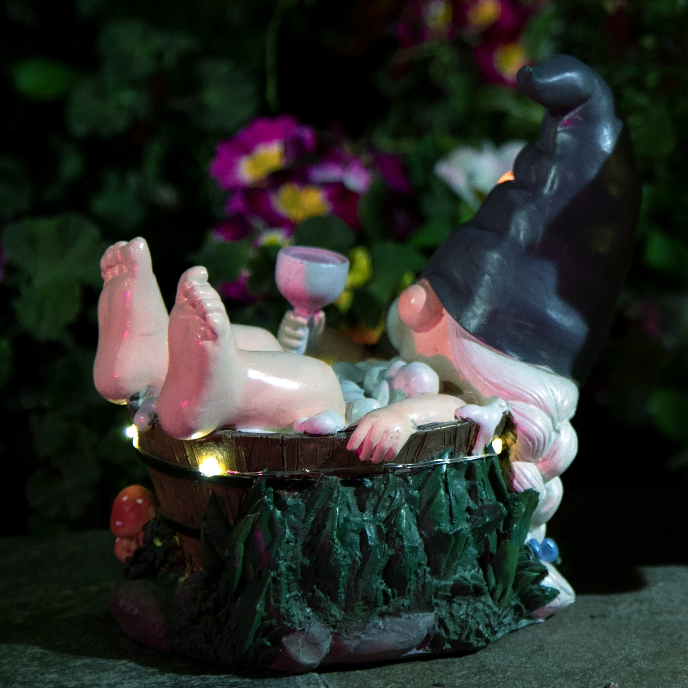 - LED light illuminates around the gnome’s bath and lady bug