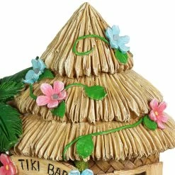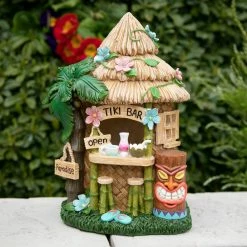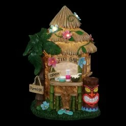 This solar powered Tropical Tiki Bar is open for business day or night! Featuring hand painted details like palm tree, tiki statue, roped signs, a thatched roof and LED flowers, this garden statue is guaranteed to add that vacation vibe to your home. The solar powered LED flowers on the roof will automatically illuminate at dusk, adding extra charm. Beautifully hand painted garden statuary makes a perfect addition to your home or garden and is guaranteed to put a smile on your face!