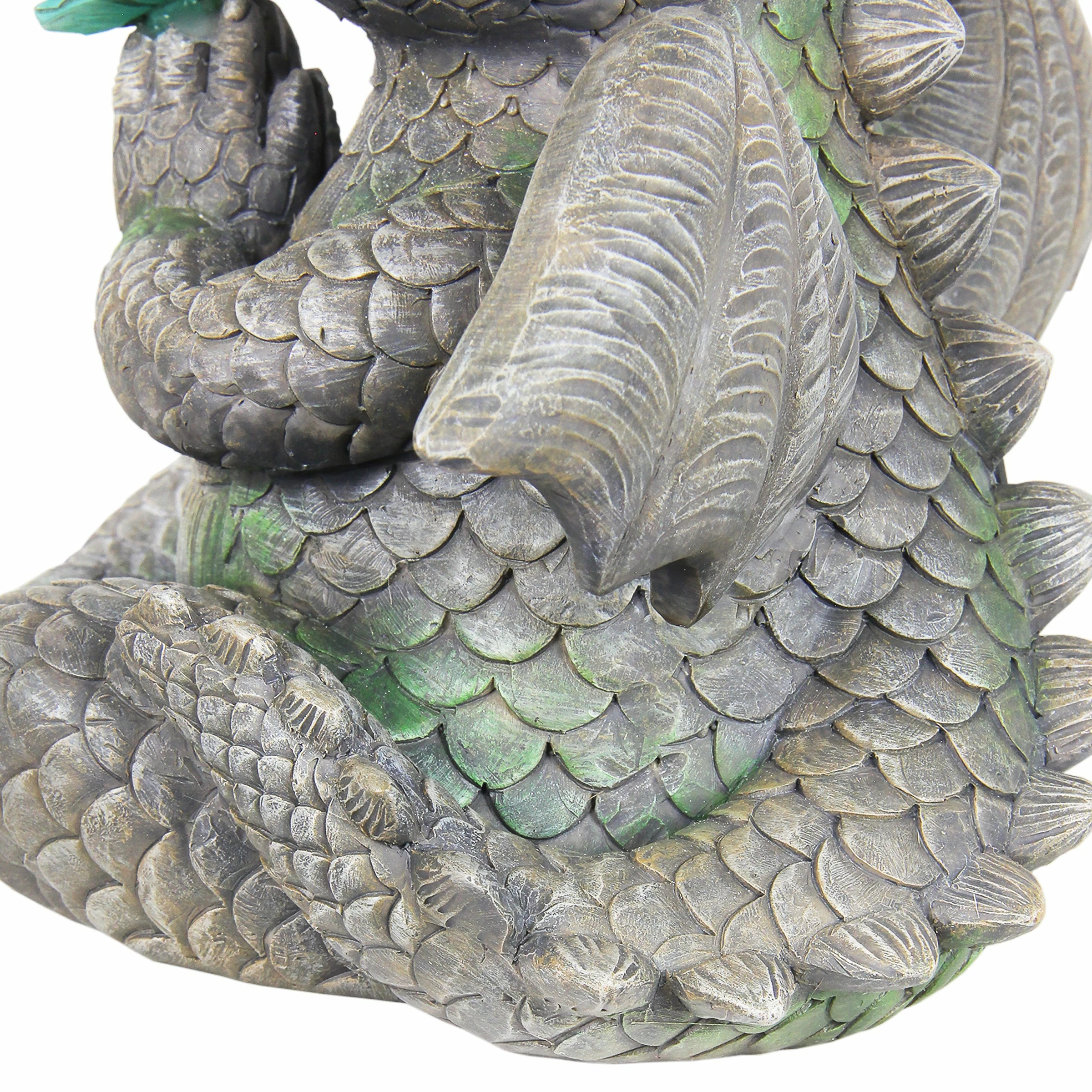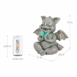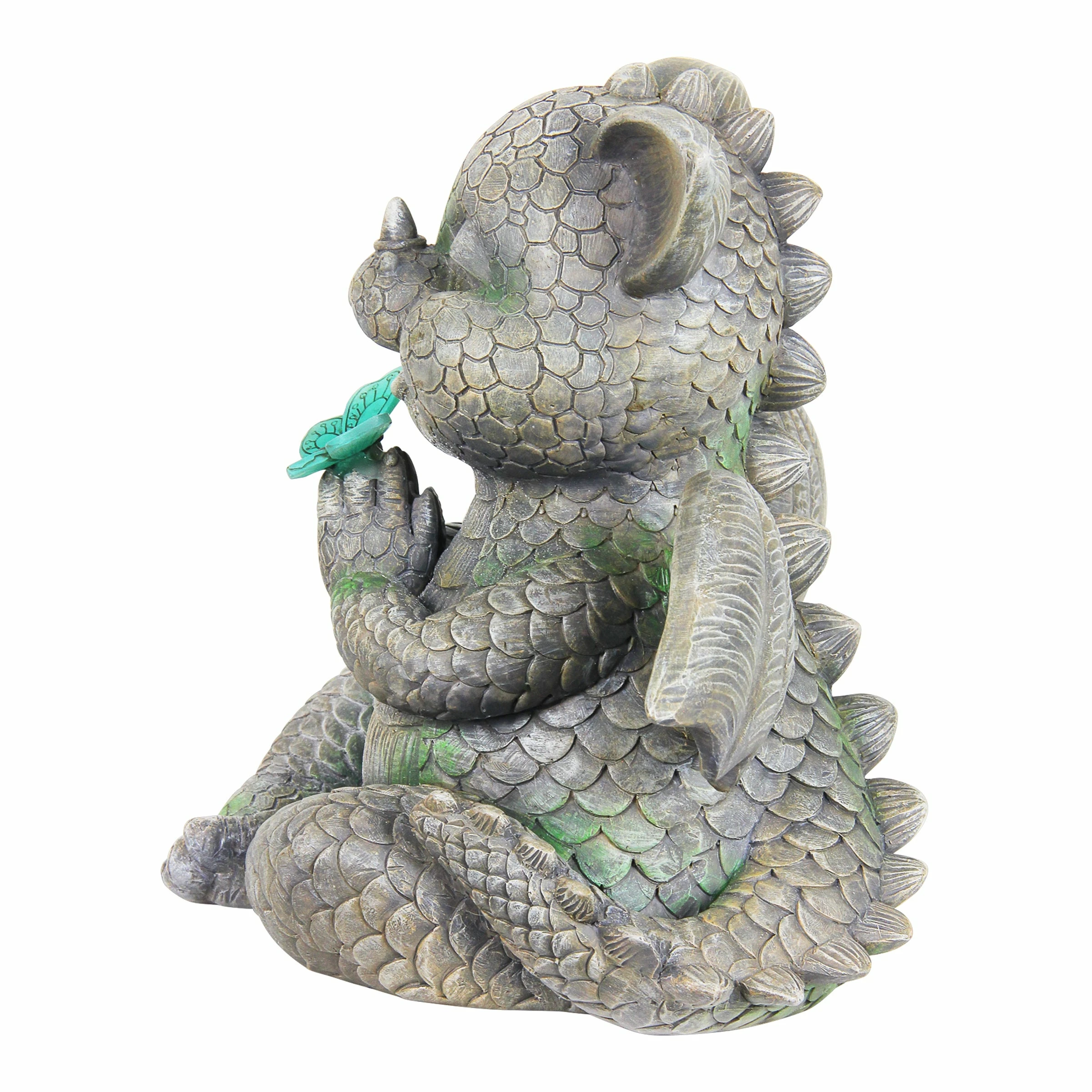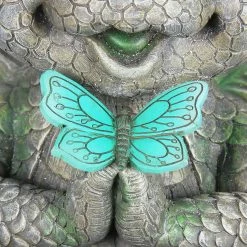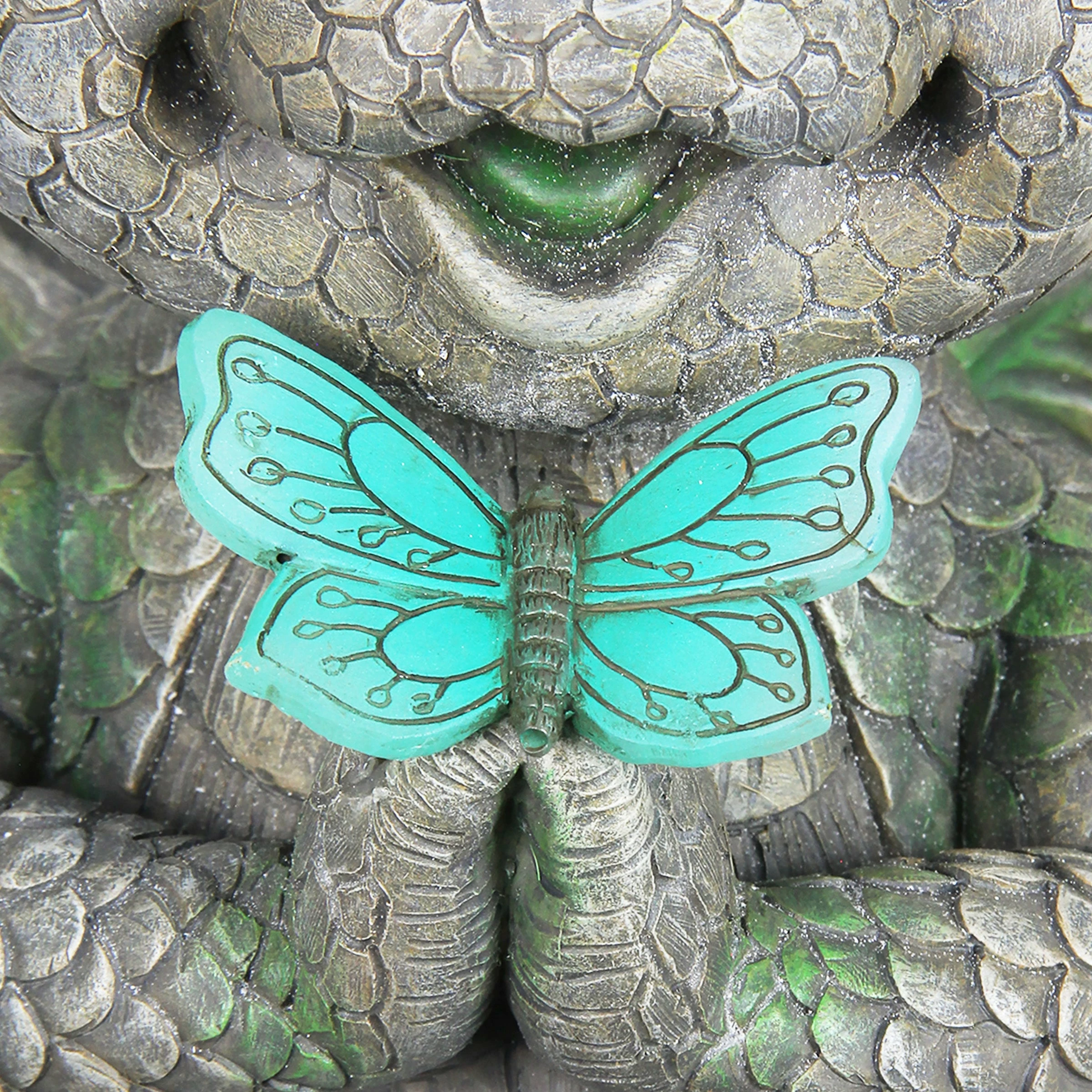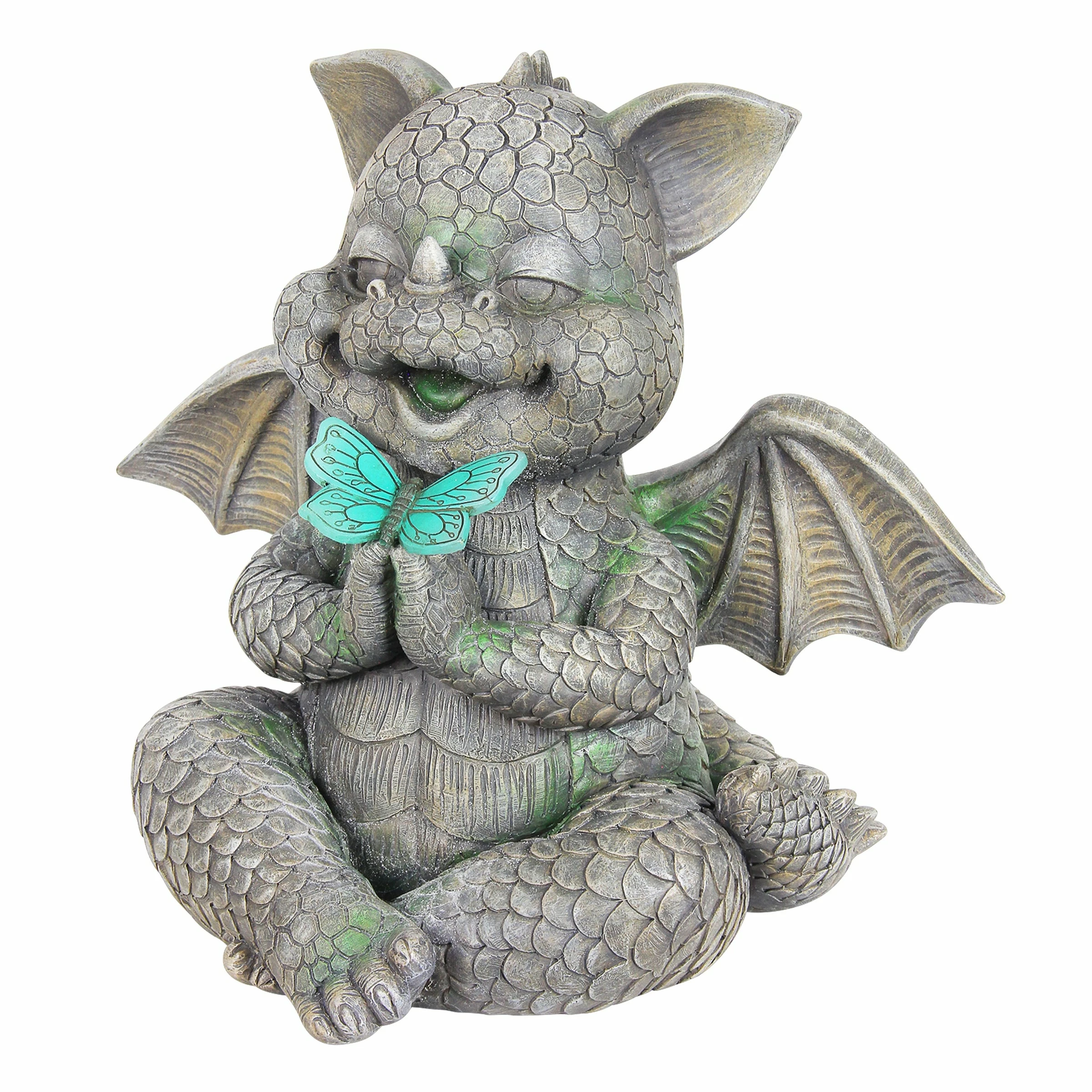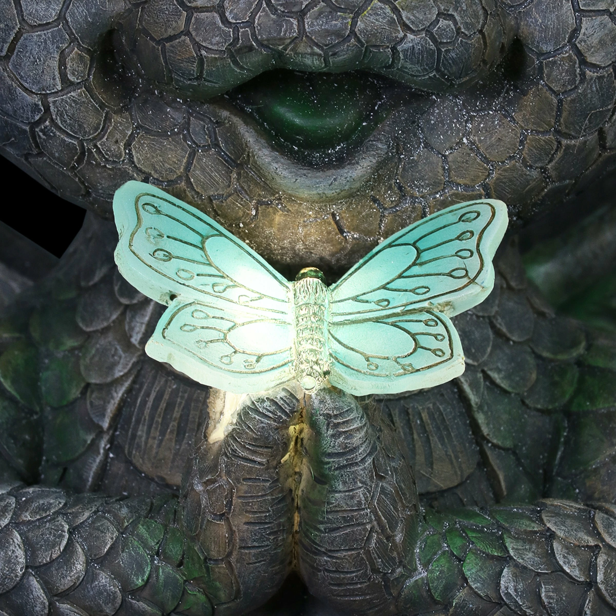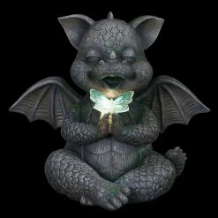 An illuminating butterfly has landed on an adorable dragon while she performs her daily prayers! This beautifully designed solar dragon statue adds magical charm to any garden. The solar powered LED light in the butterfly will automatically glow at dusk with the prefect touch of light to bring this gorgeous art to life. Constructed from durable resin and painted to look like heavy stone, this statue makes a wonderful addition to any yard and a fabulous gift idea too.