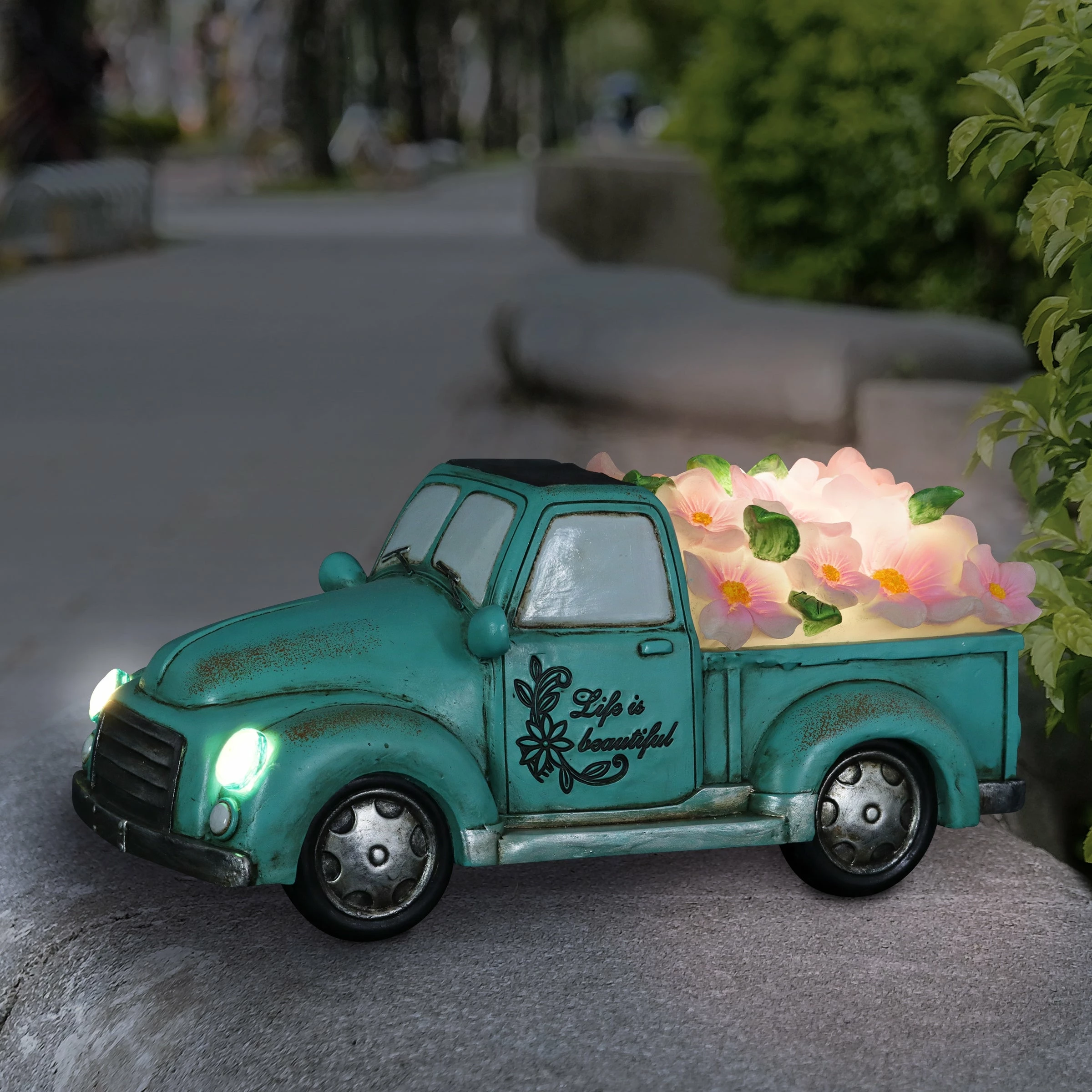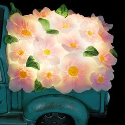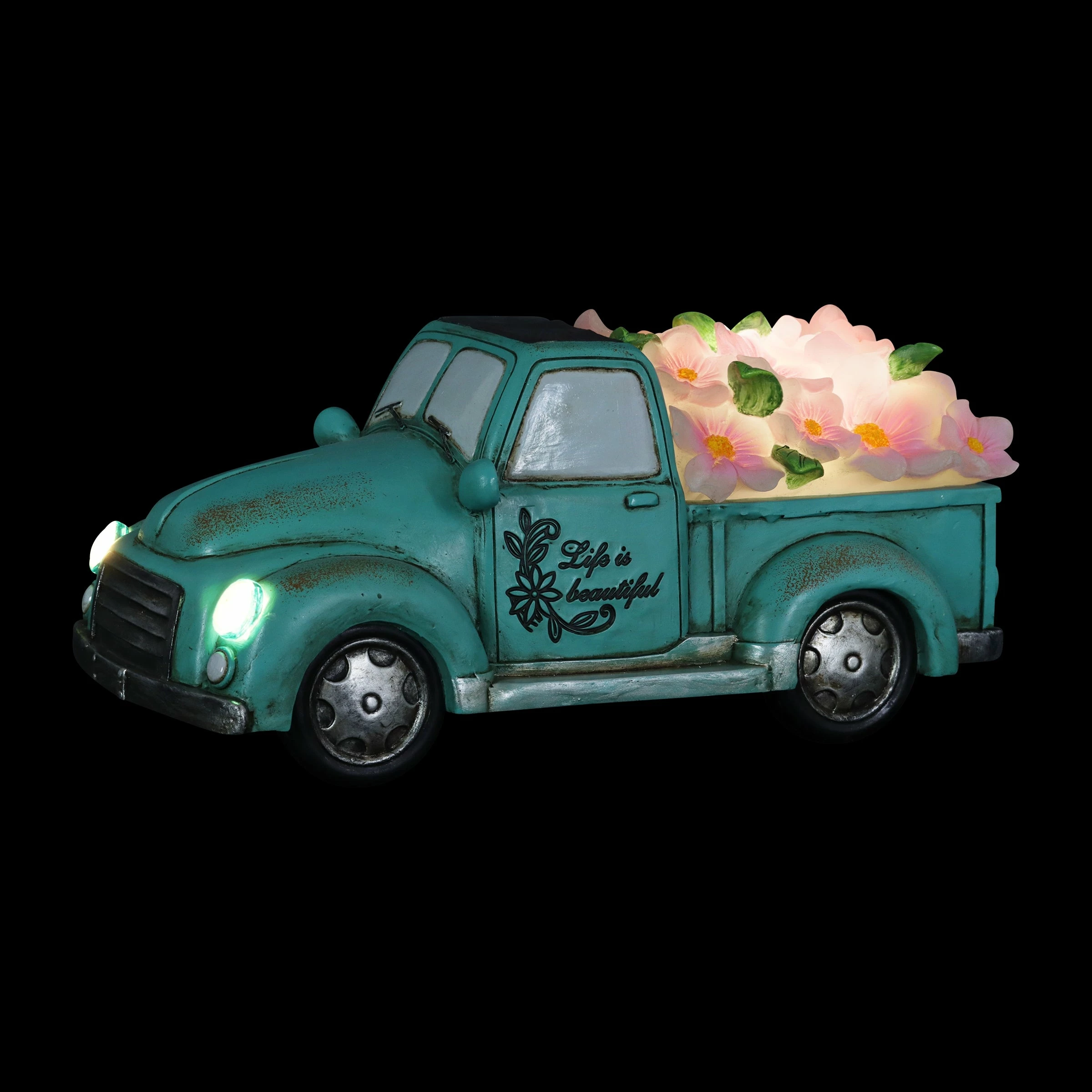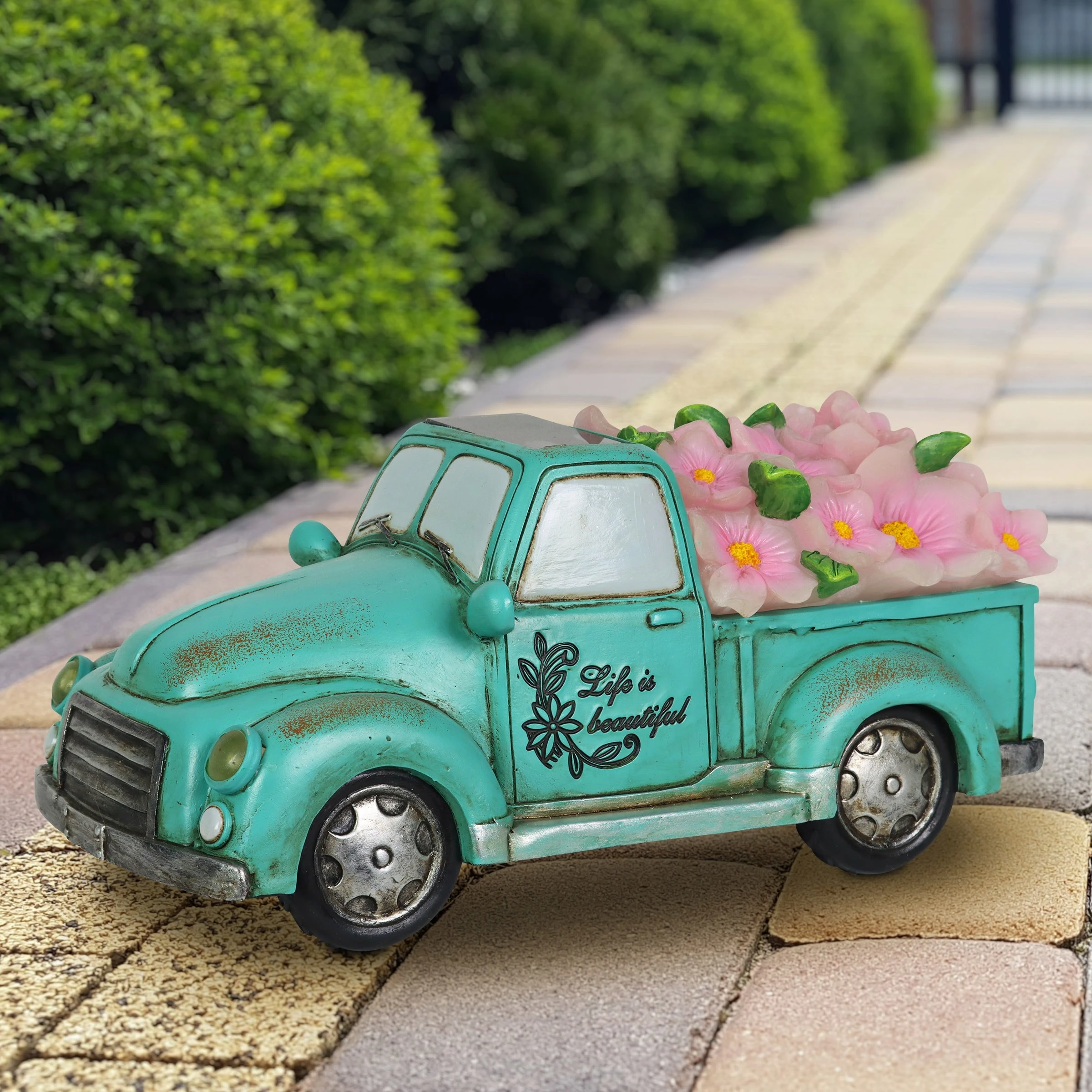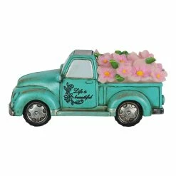 Cruise down memory lane in this charming vintage Blue Solar Truck Statue! With its illuminating headlights and overflowing bed with pink flowers, this solar garden statue brings a sense of fun and nostalgic charm to your garden! The “Life is Beautiful” inscription adds and extra detail making this a beautifully crafted piece of garden art you will enjoy day and night!