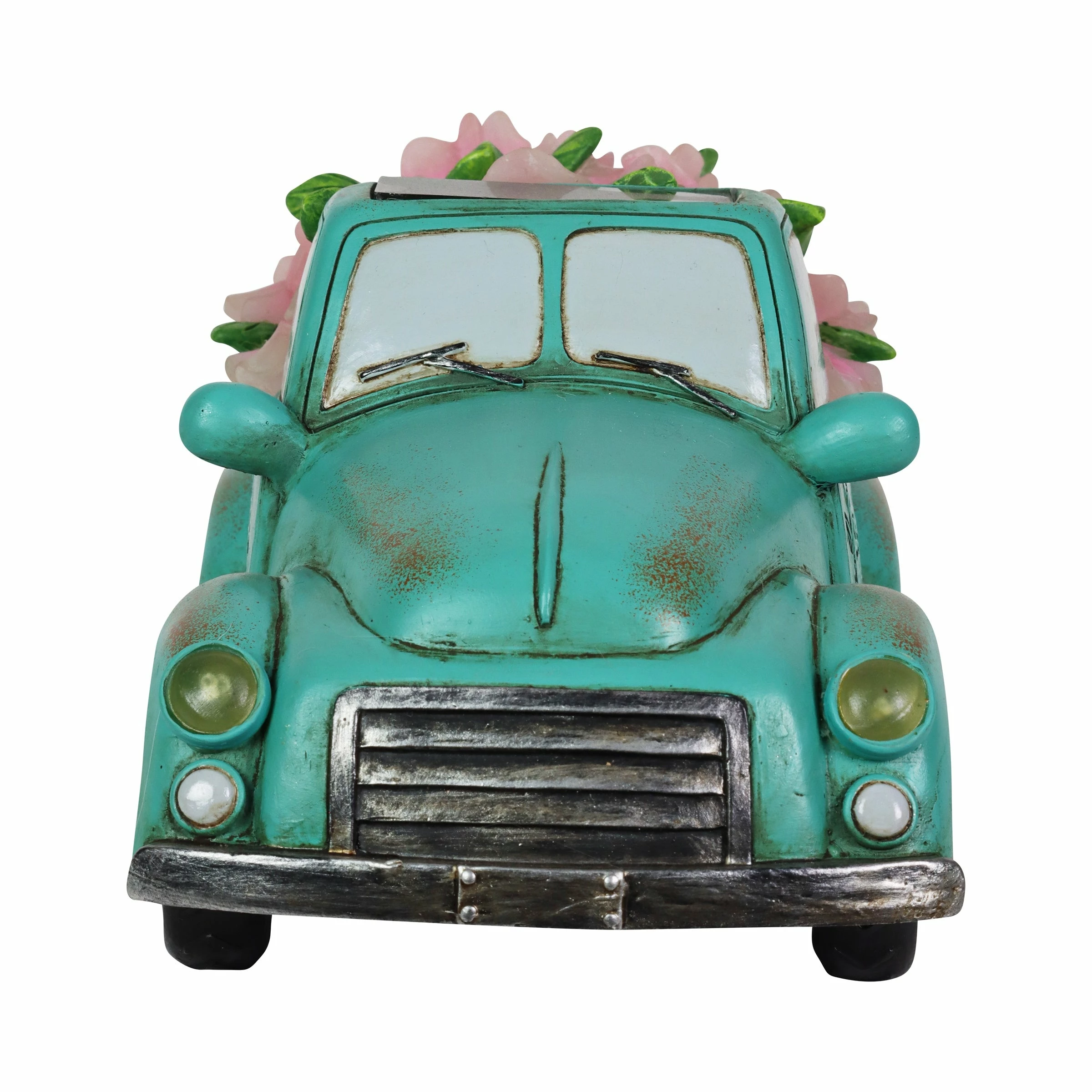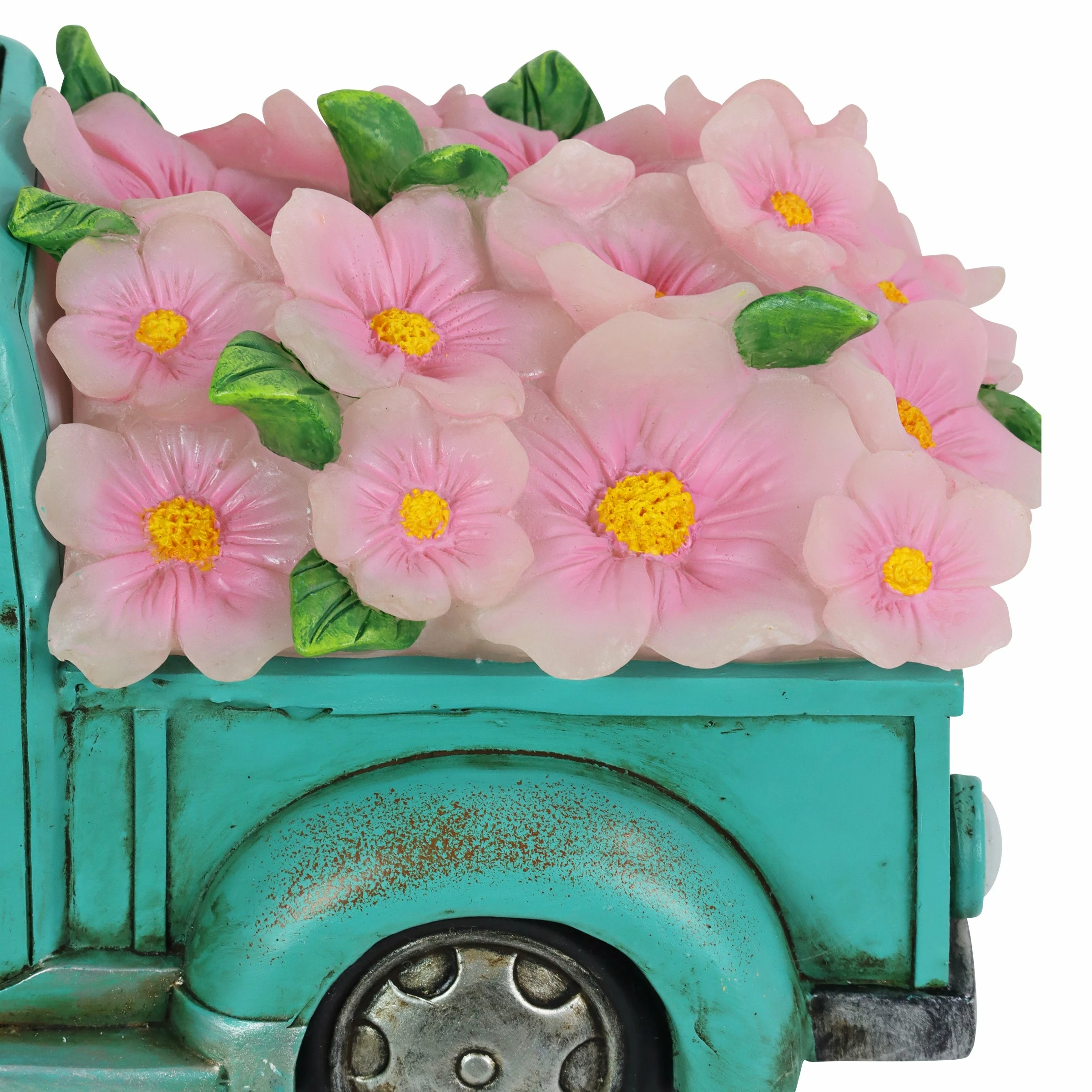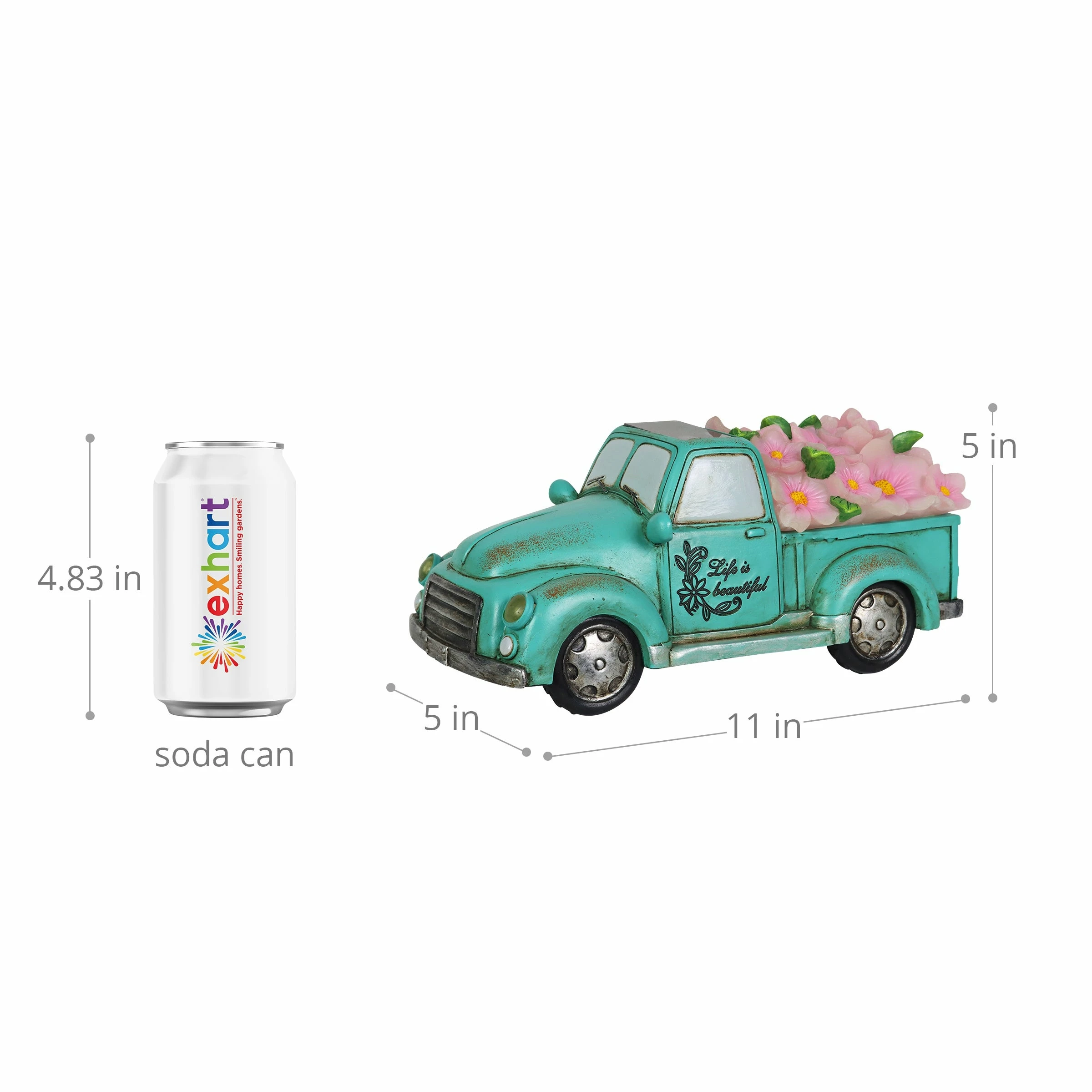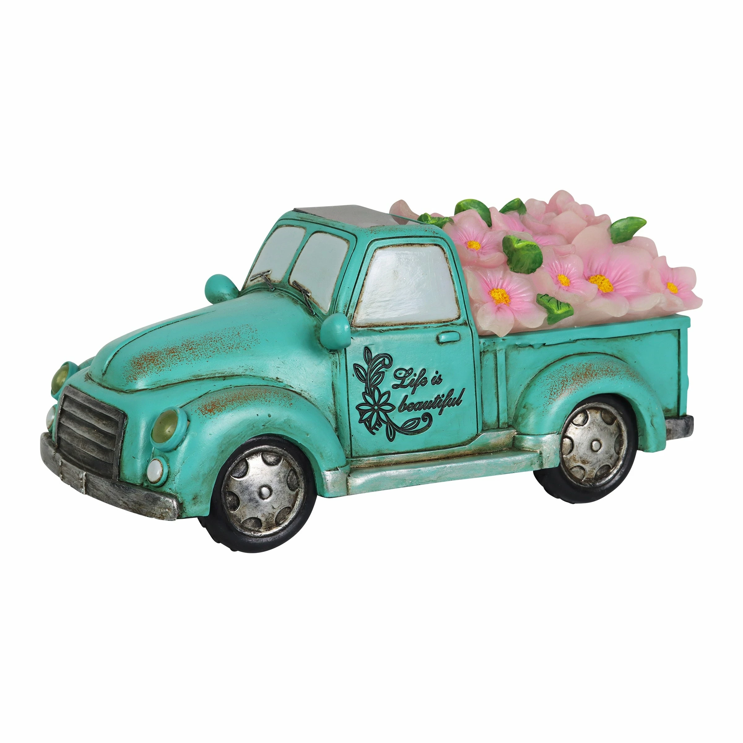 Cruise down memory lane in this charming vintage Blue Solar Truck Statue! With its illuminating headlights and overflowing bed with pink flowers, this solar garden statue brings a sense of fun and nostalgic charm to your garden! The “Life is Beautiful” inscription adds and extra detail making this a beautifully crafted piece of garden art you will enjoy day and night!