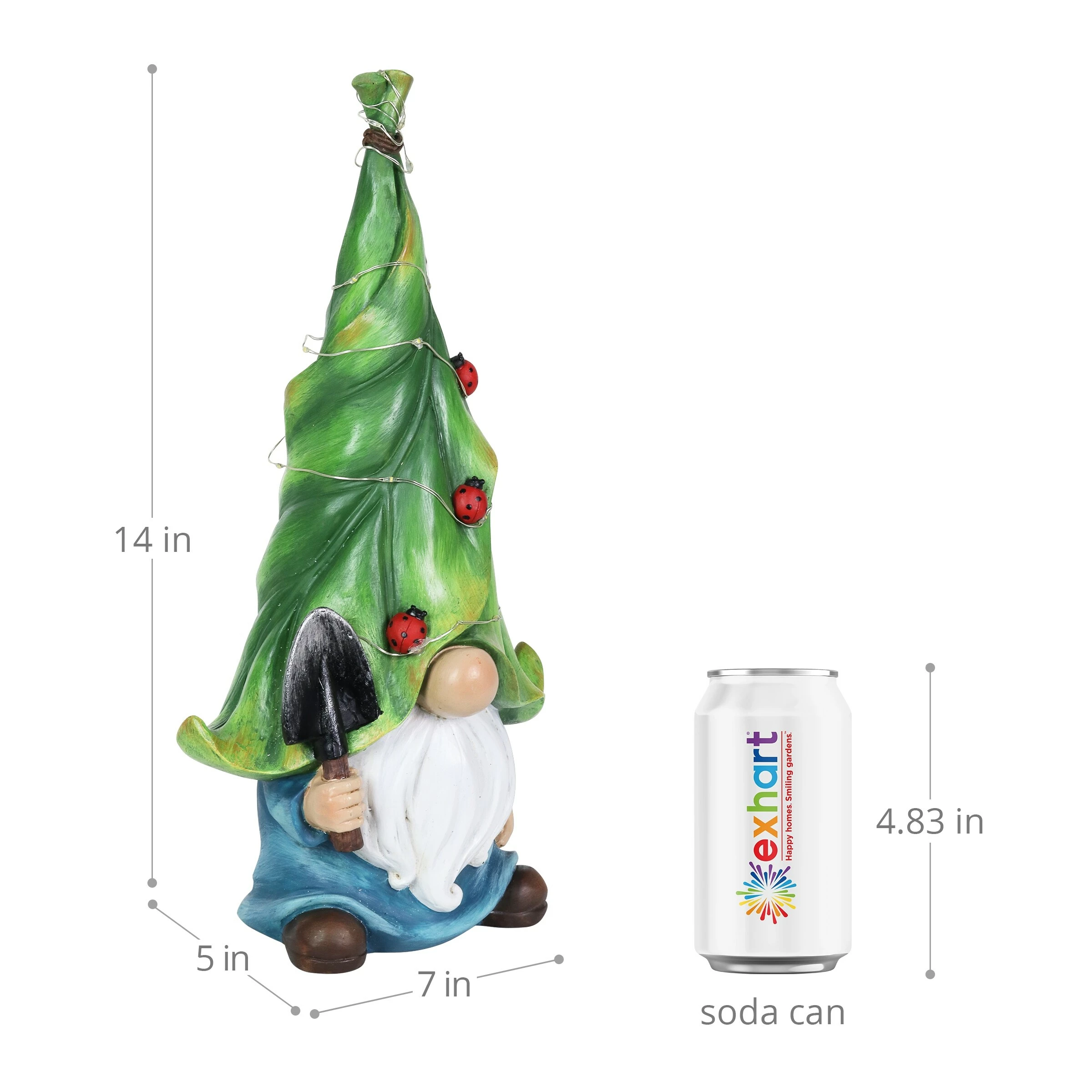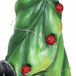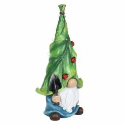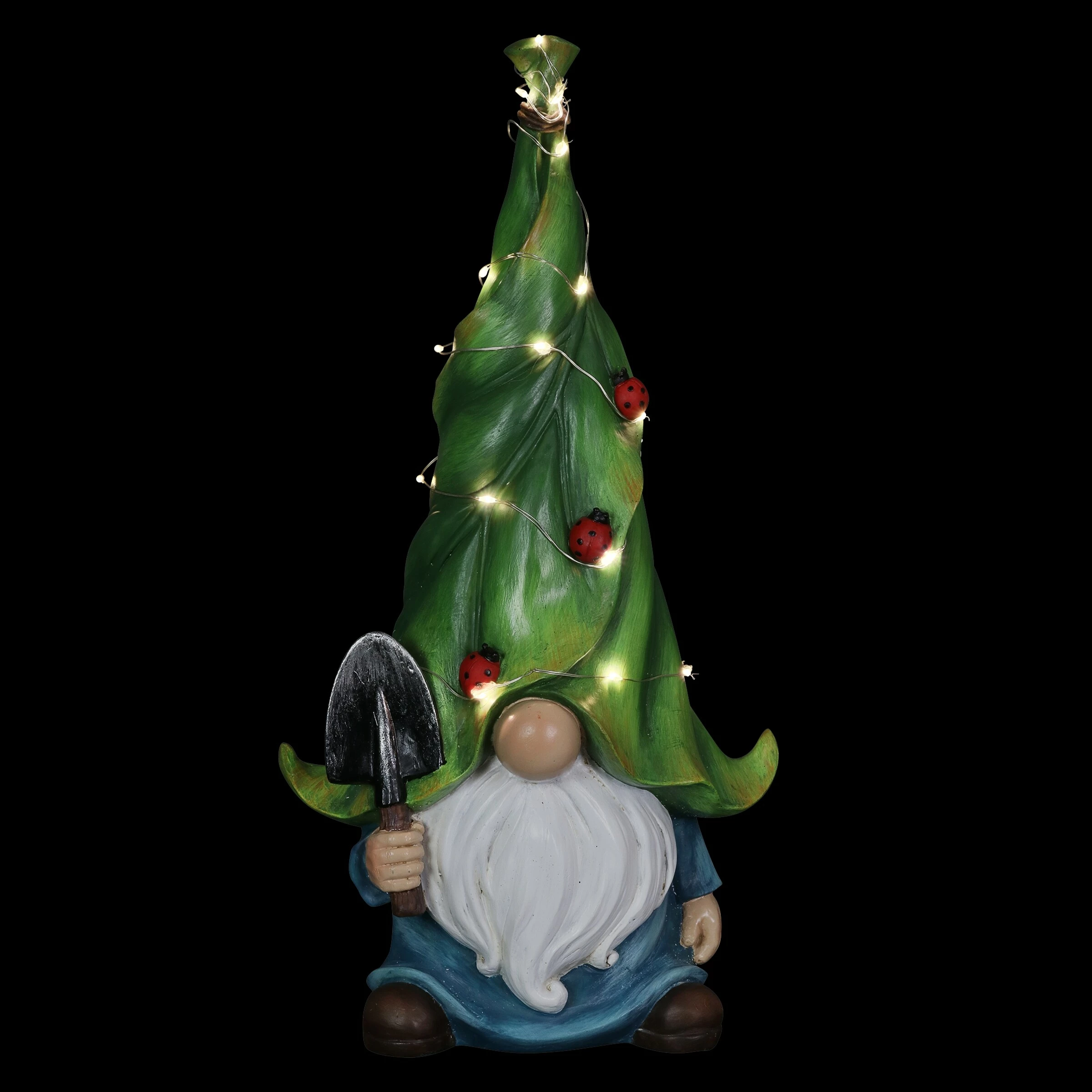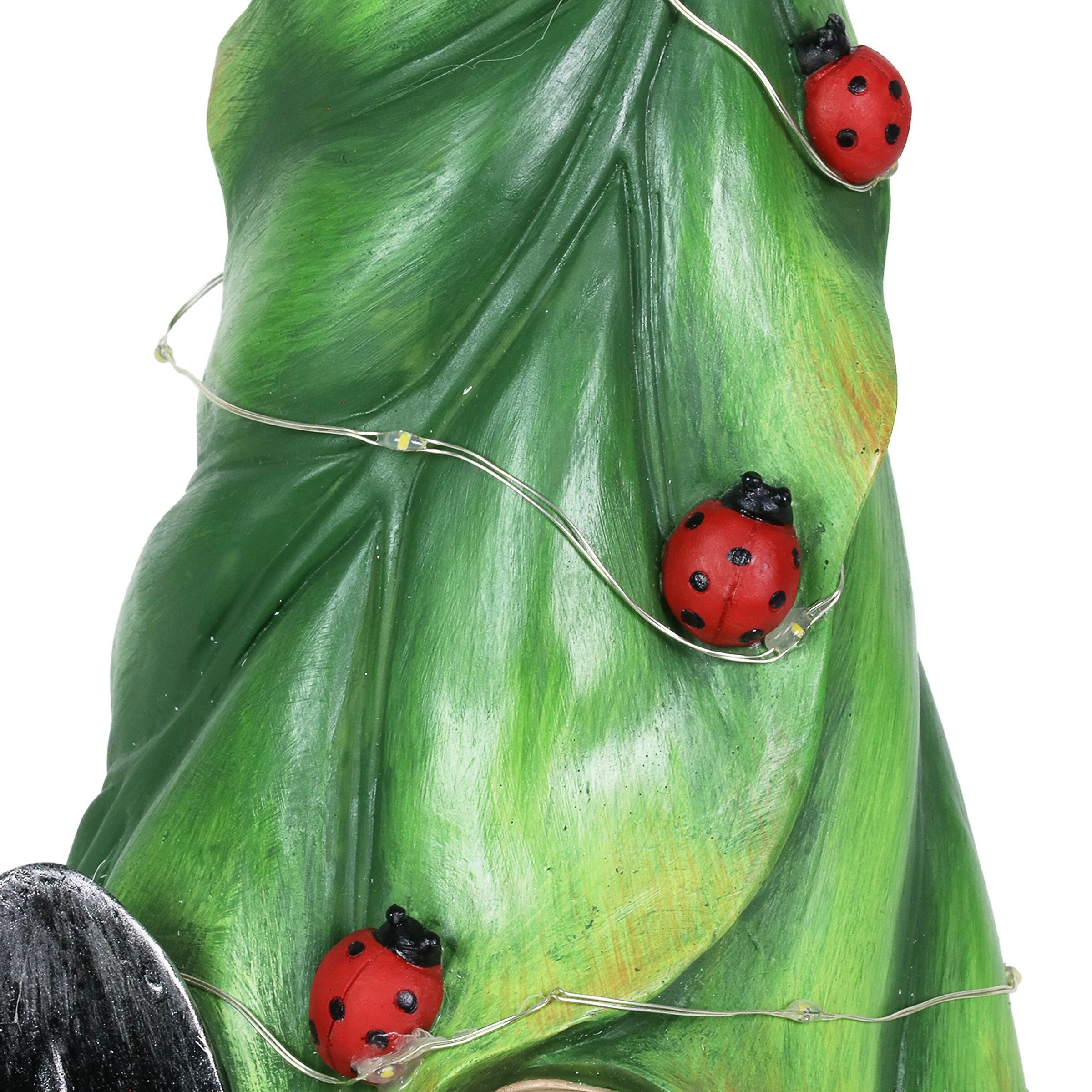 A string of solar powered LED lights illuminate this adorable hand painted gnome’s green hat! Little red ladybugs adorn the leafy hat as well. The gnome carries a trowel, as is customary because gnomes are known for being magical little helpers in the garden. This beautifully hand painted piece of garden art by the Exhart family makes a charming addition to any home!