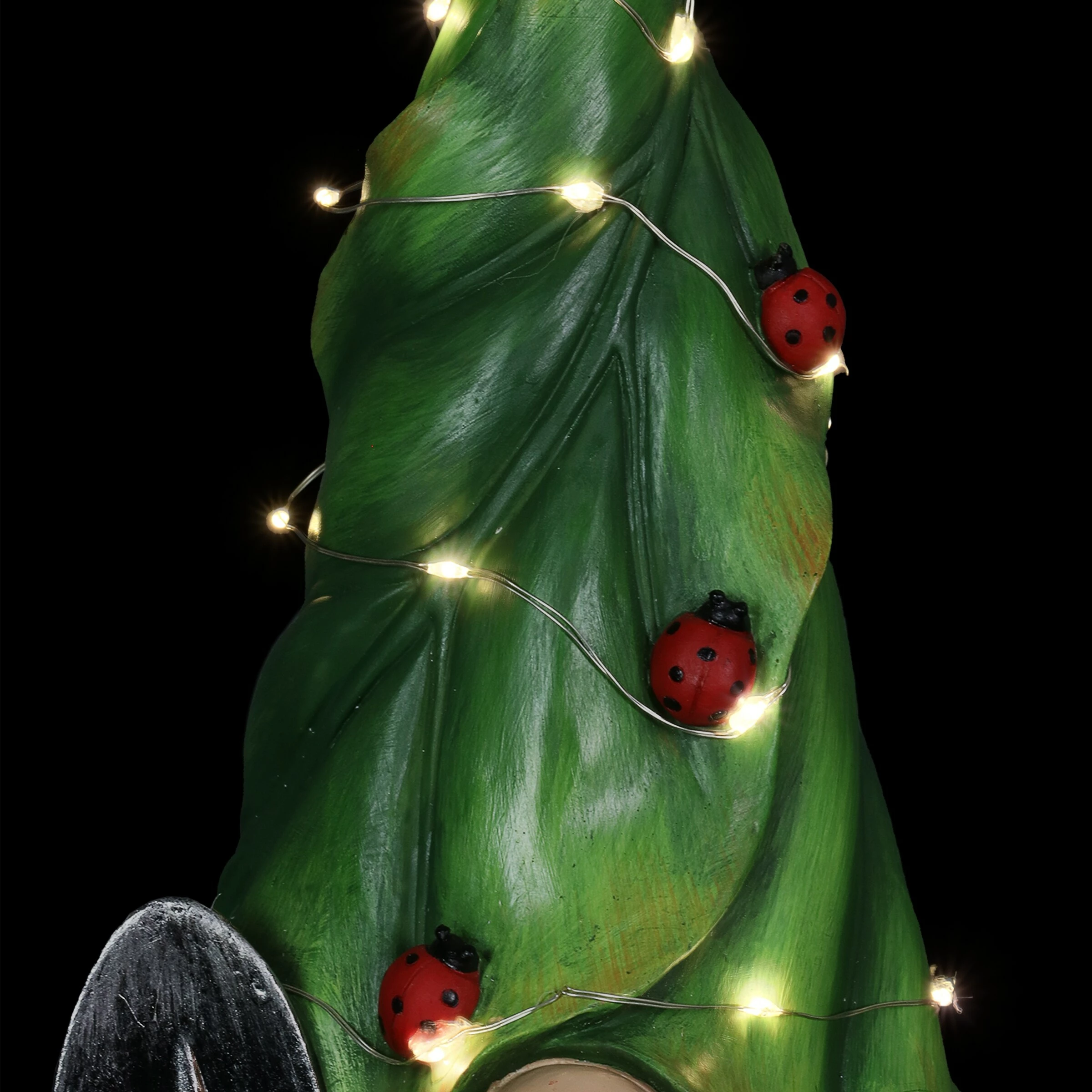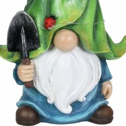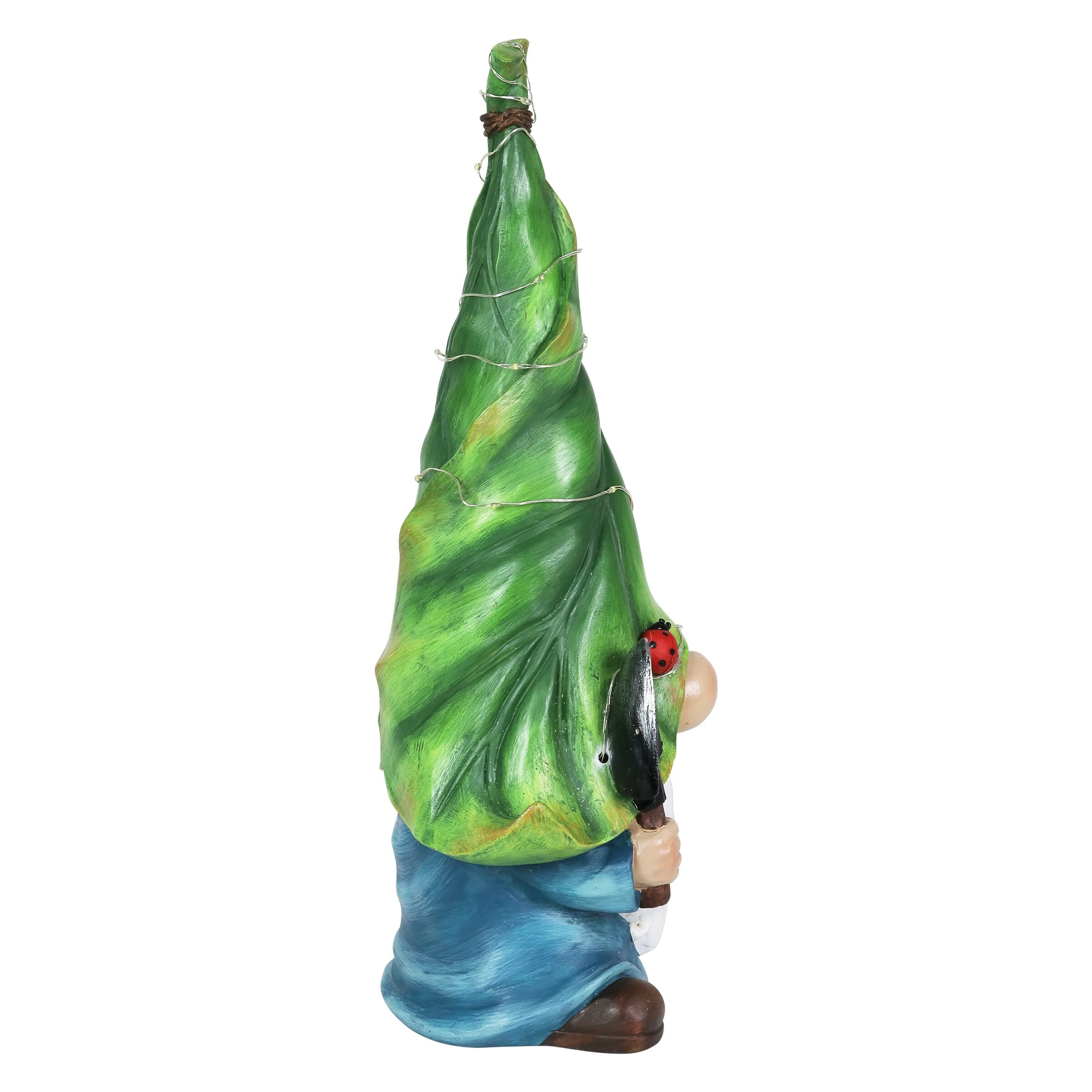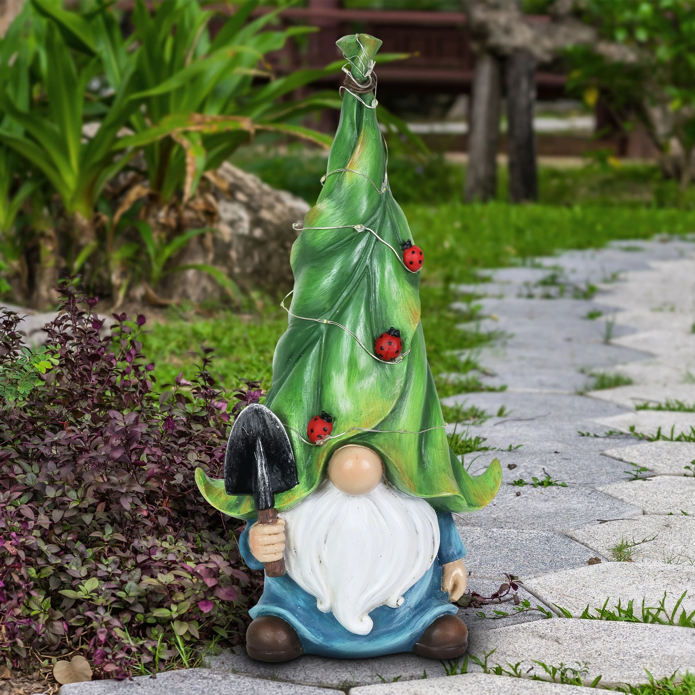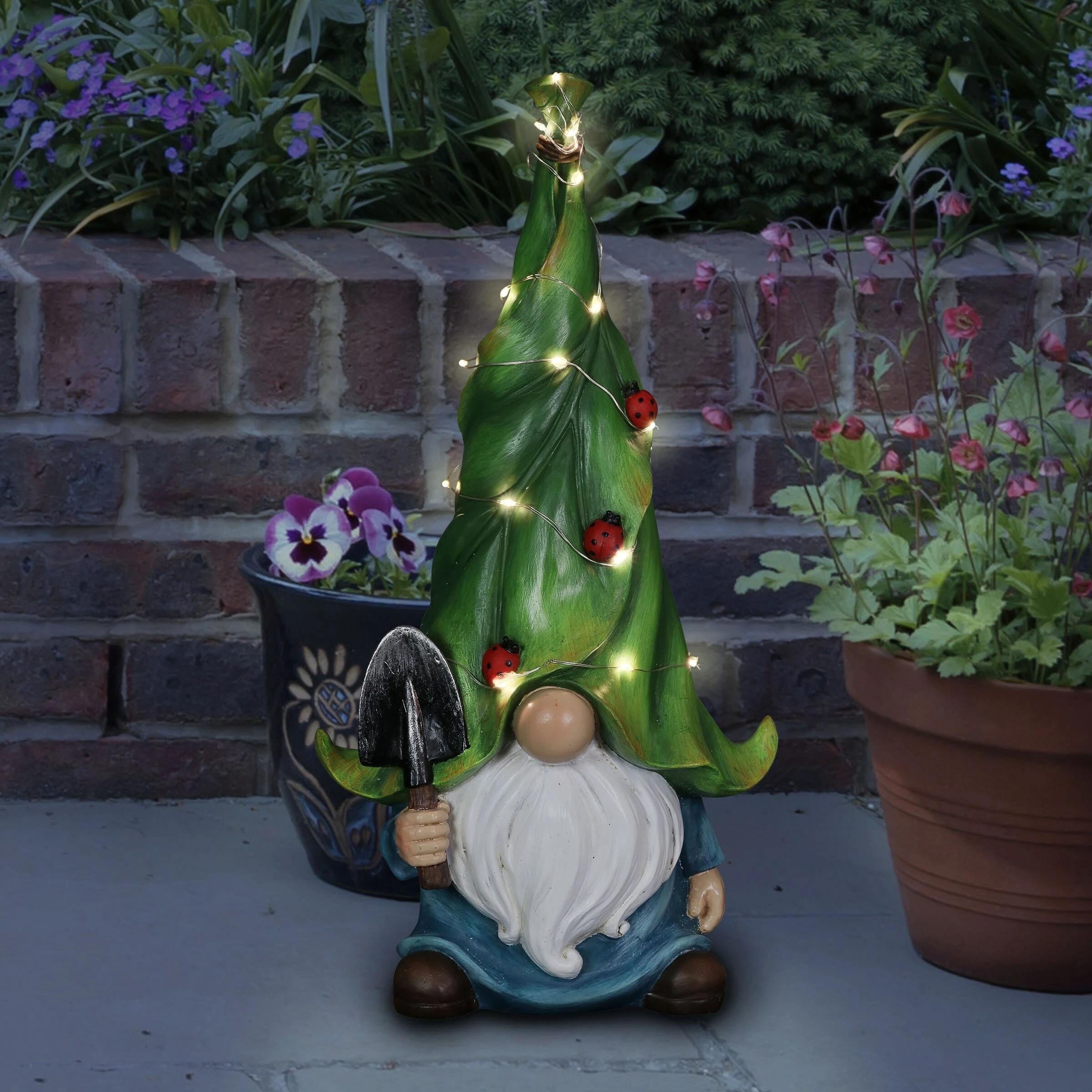A string of solar powered LED lights illuminate this adorable hand painted gnome’s green hat! Little red ladybugs adorn the leafy hat as well. The gnome carries a trowel, as is customary because gnomes are known for being magical little helpers in the garden. This beautifully hand painted piece of garden art by the Exhart family makes a charming addition to any home!
