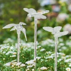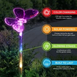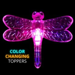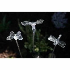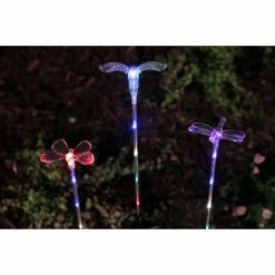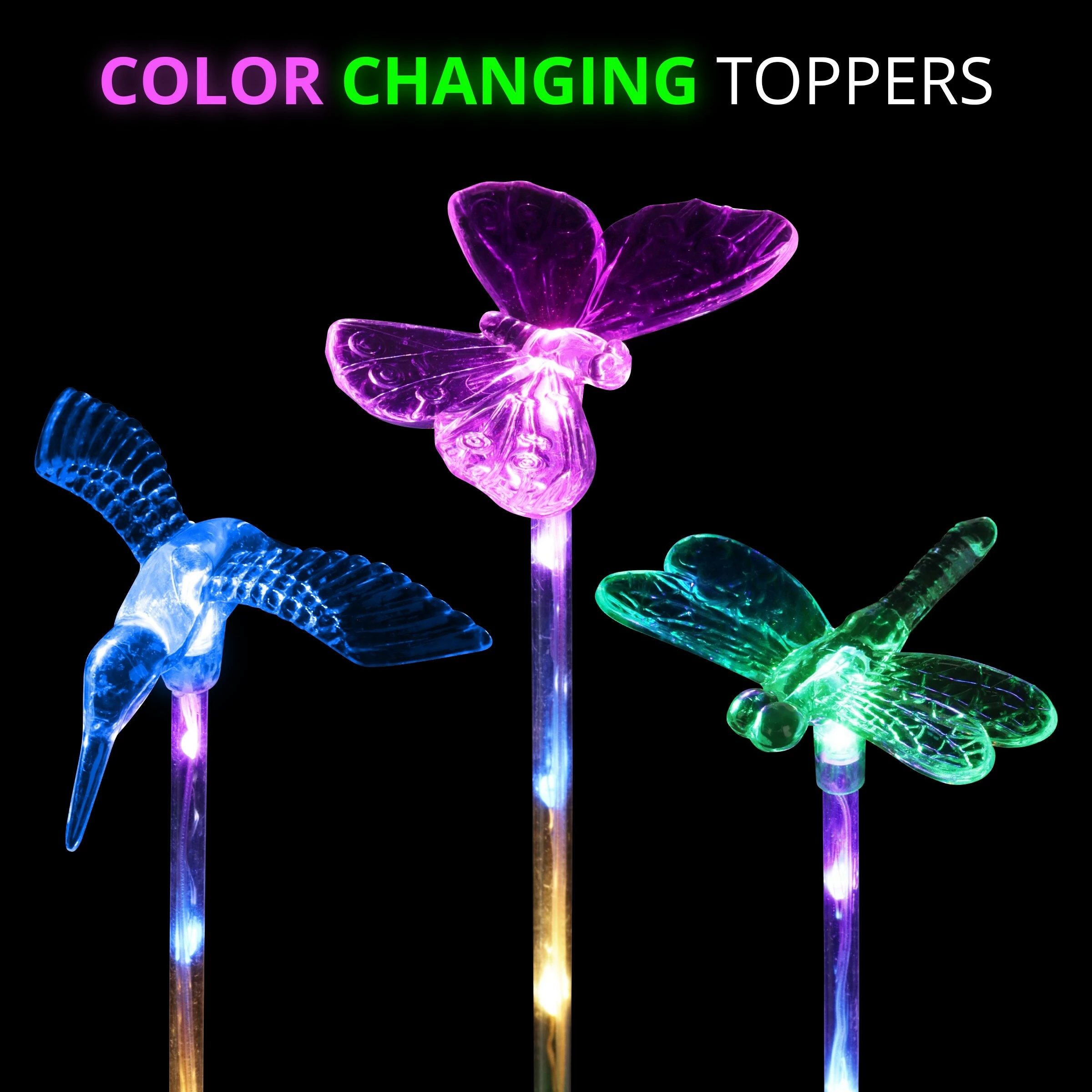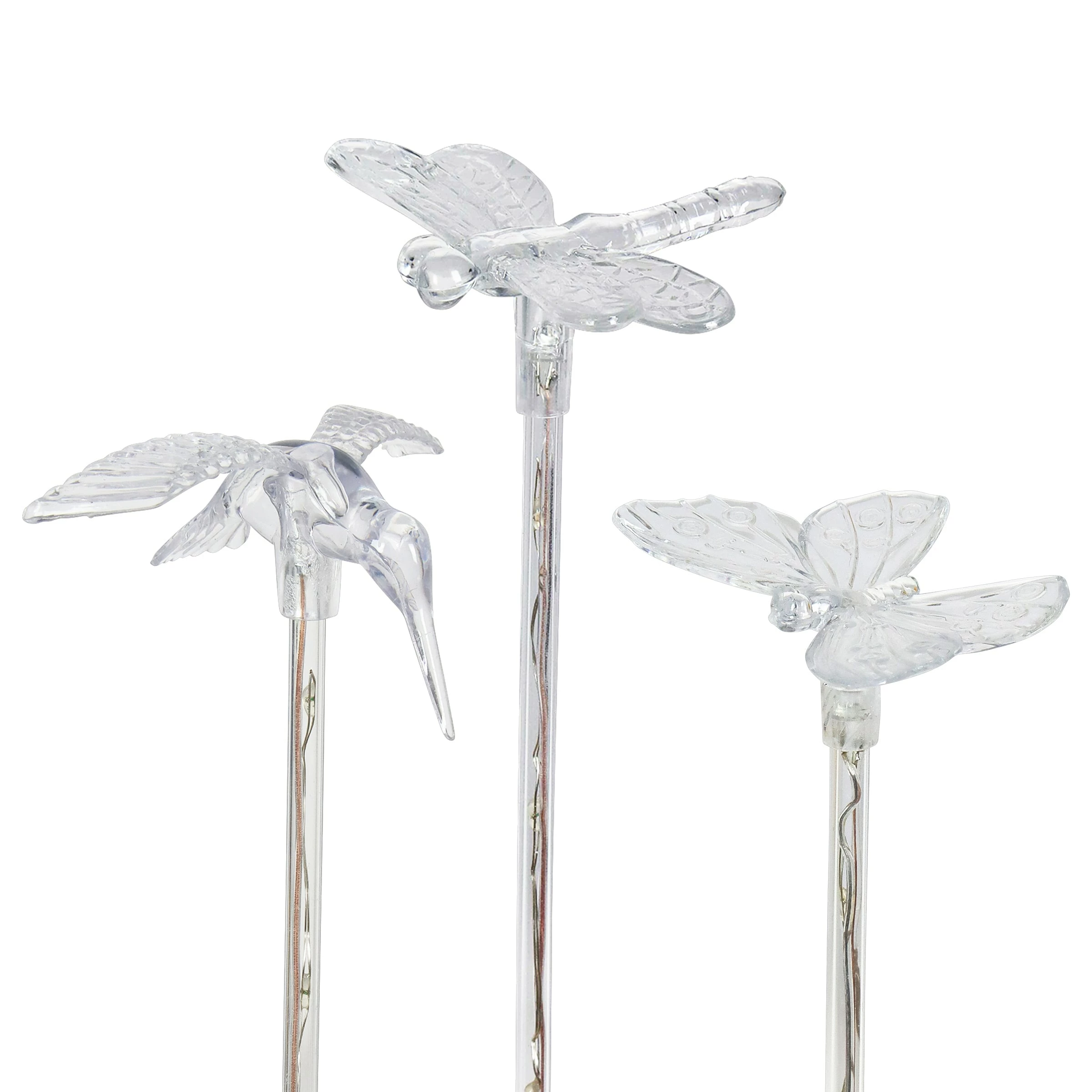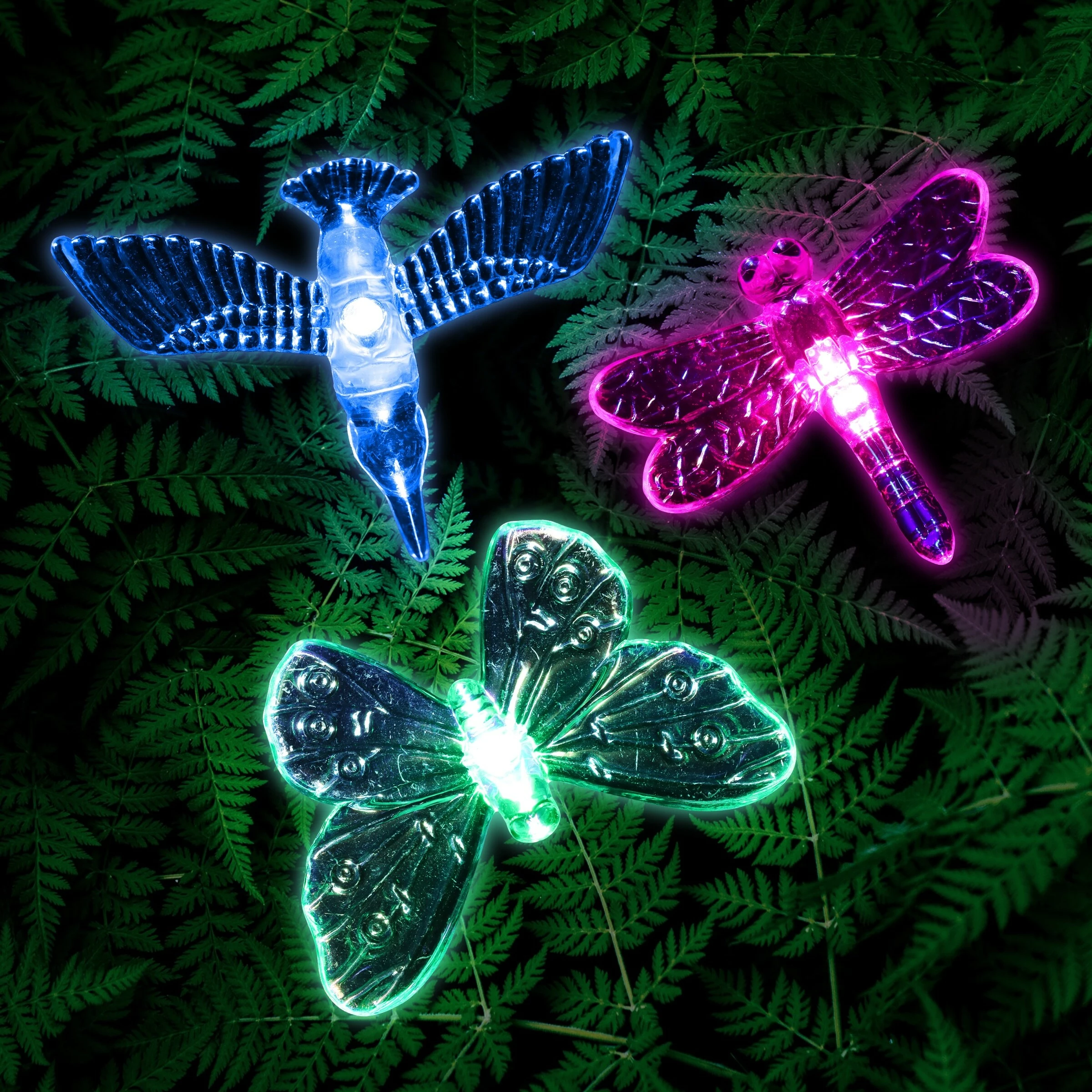 These beautiful winged creatures and their stakes illuminate in your garden with Solar powered LED lights! Set of 3 comes with one of each design: a charming butterfly, dragonfly and hummingbird. Each topper has a color changing LED and the stake glows with 5 multi-color LEDs. Sure to add the perfect touch of magical whimsy to your outdoor space!