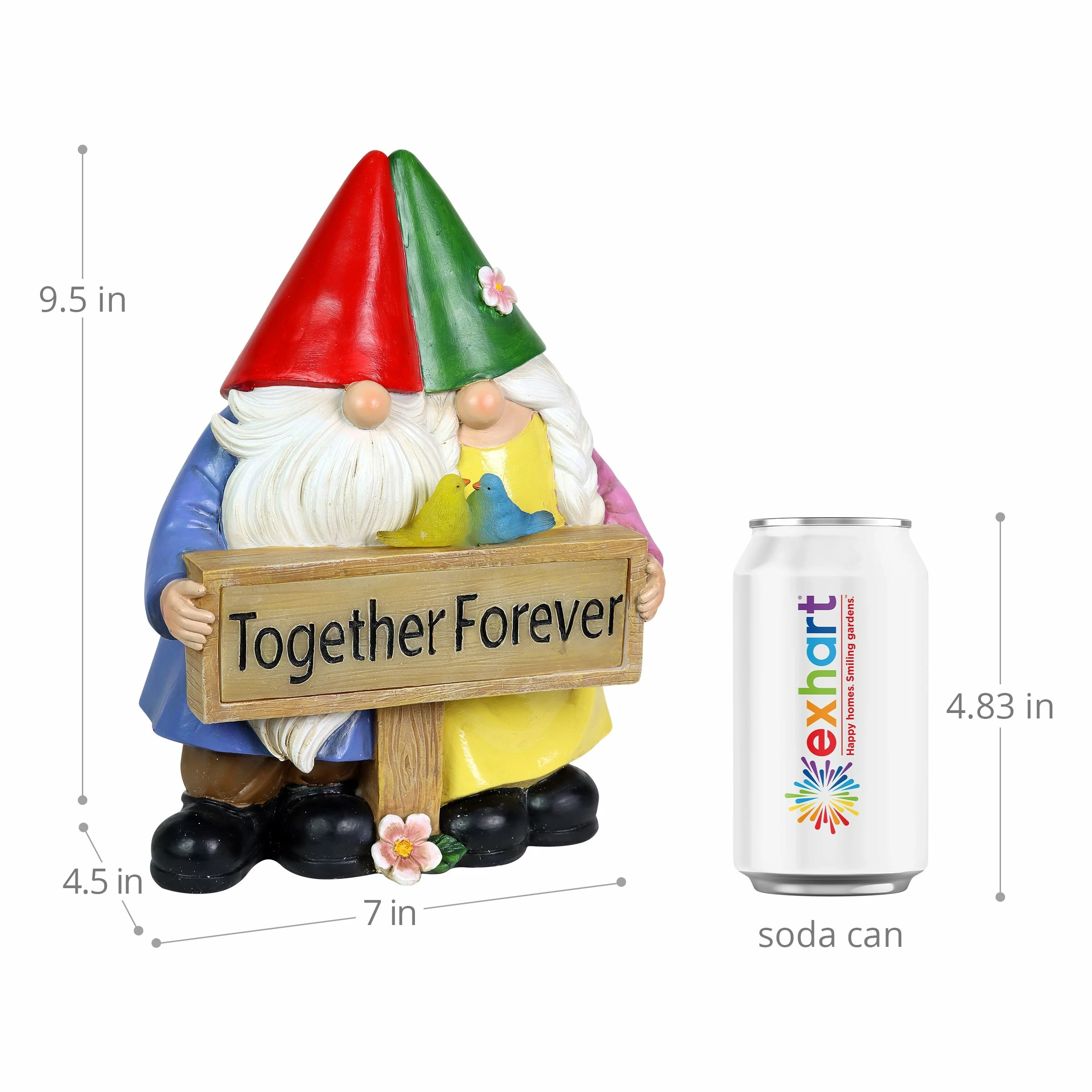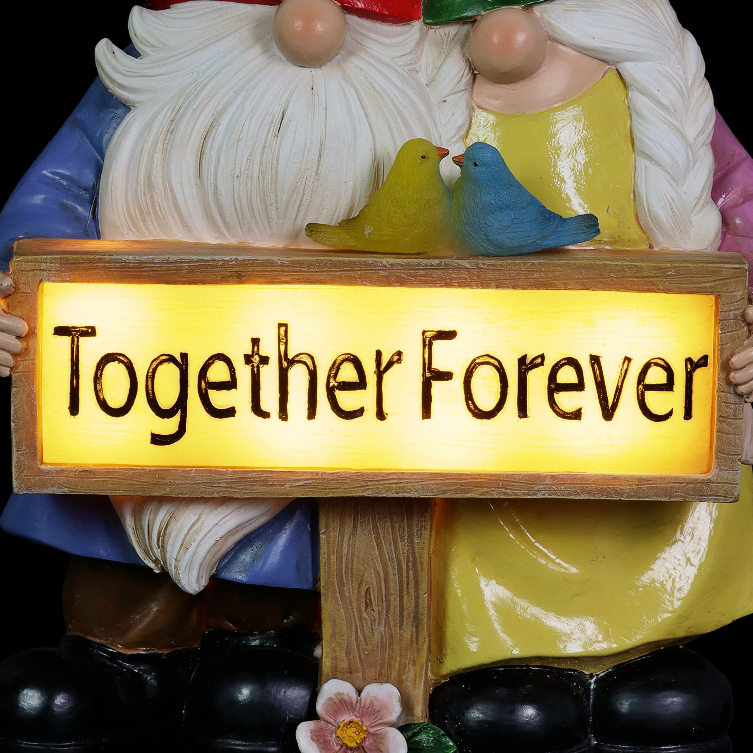 Sweet Gnome Couple Statue with their heads together hold a solar powered Together Forever sign. Instantly adds a touch of warmth and love to your space. The solar powered LED lights will charge during the day and illuminate automatically at night to remind you of the constant and lasting love you share. Beautifully hand painted and constructed from durable resin, this piece of garden art will endure the test of time, just like your love.