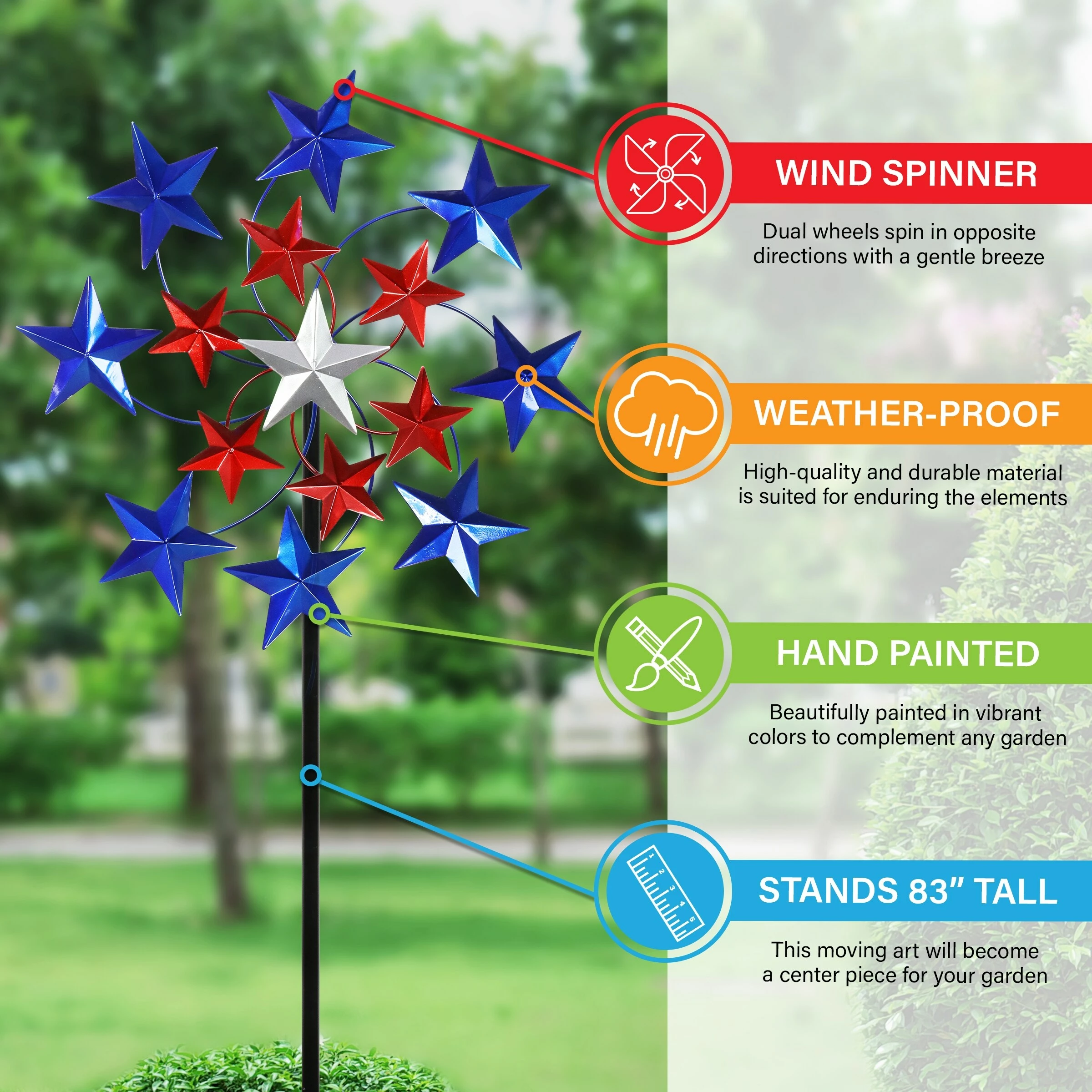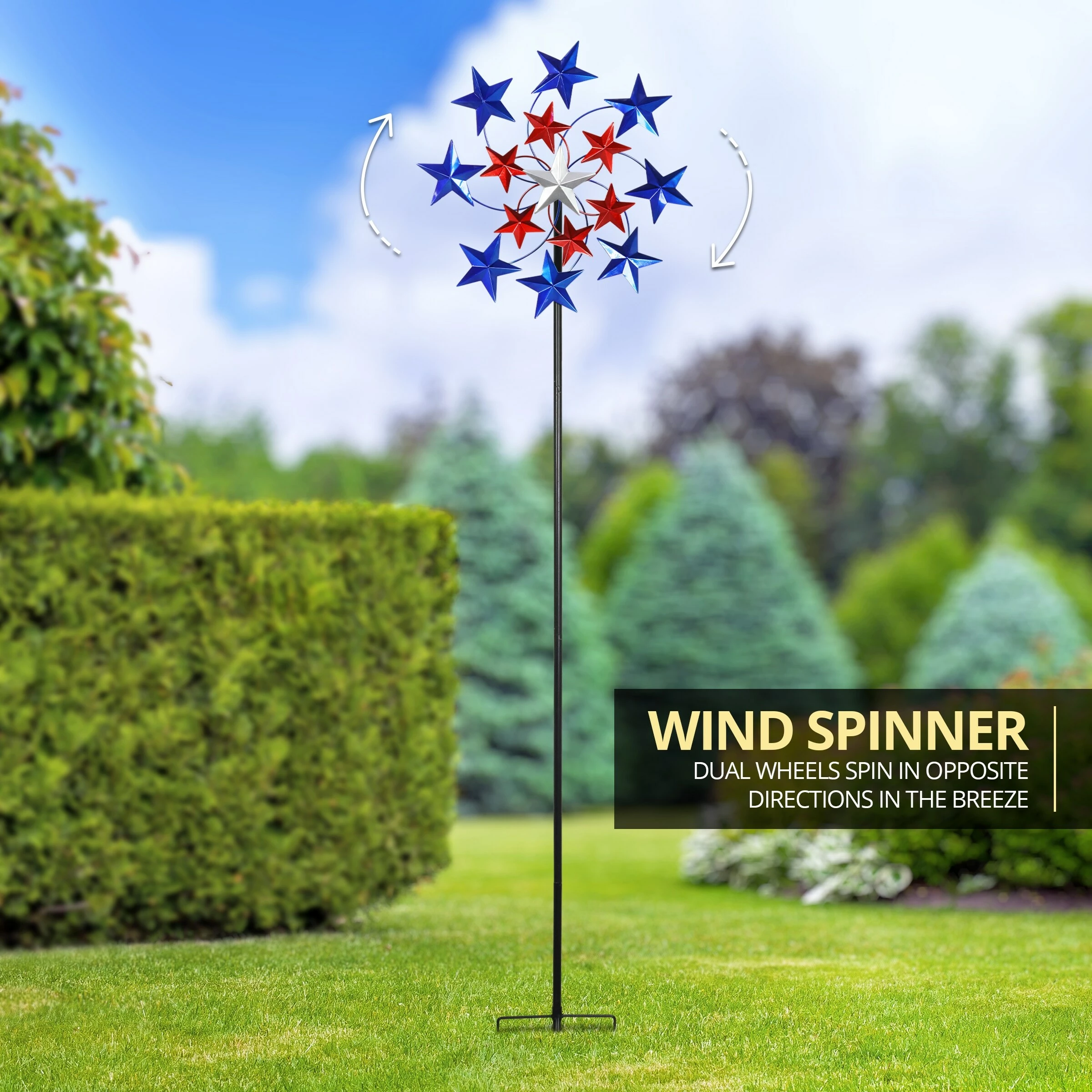 Share your patriotic pride with this stunning Star Spangled Spinner! Just a little breeze sets the spinner alive with motion. This piece of moving art imparts true American spirit!