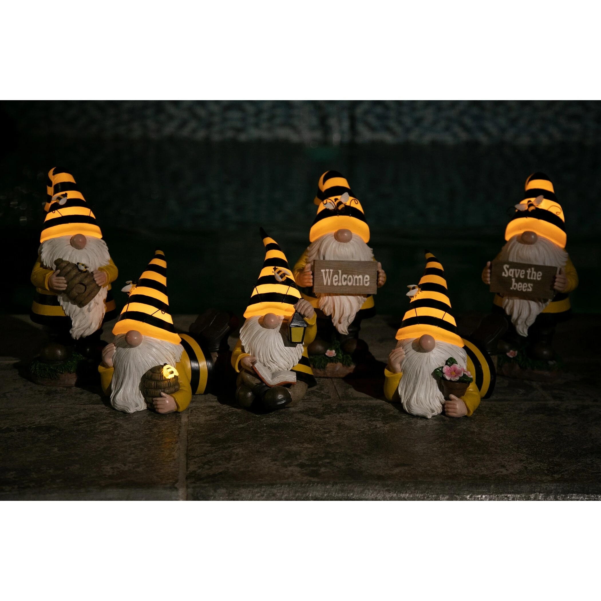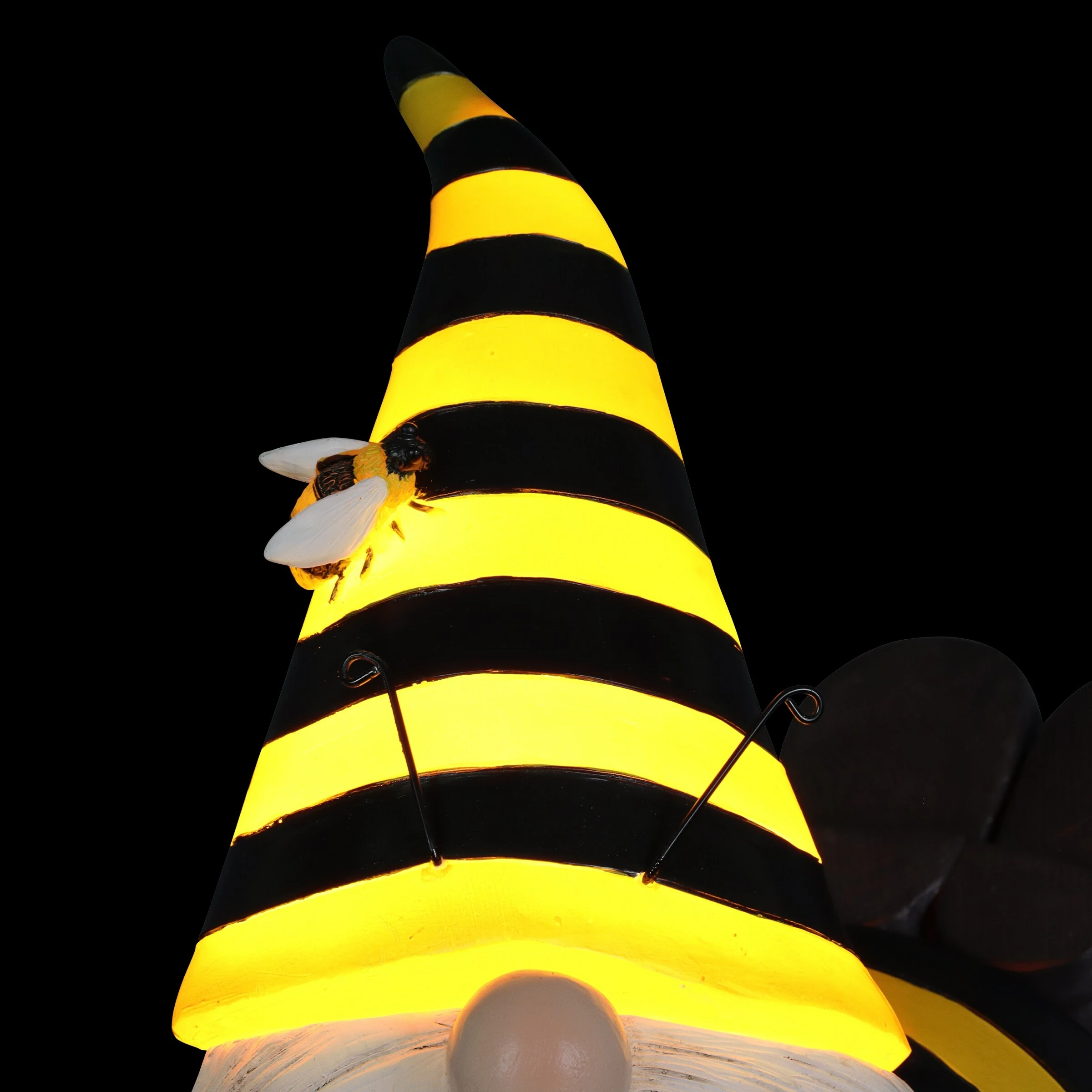 - Solar powered LED light automatically illuminates the gnome’s hat at dusk