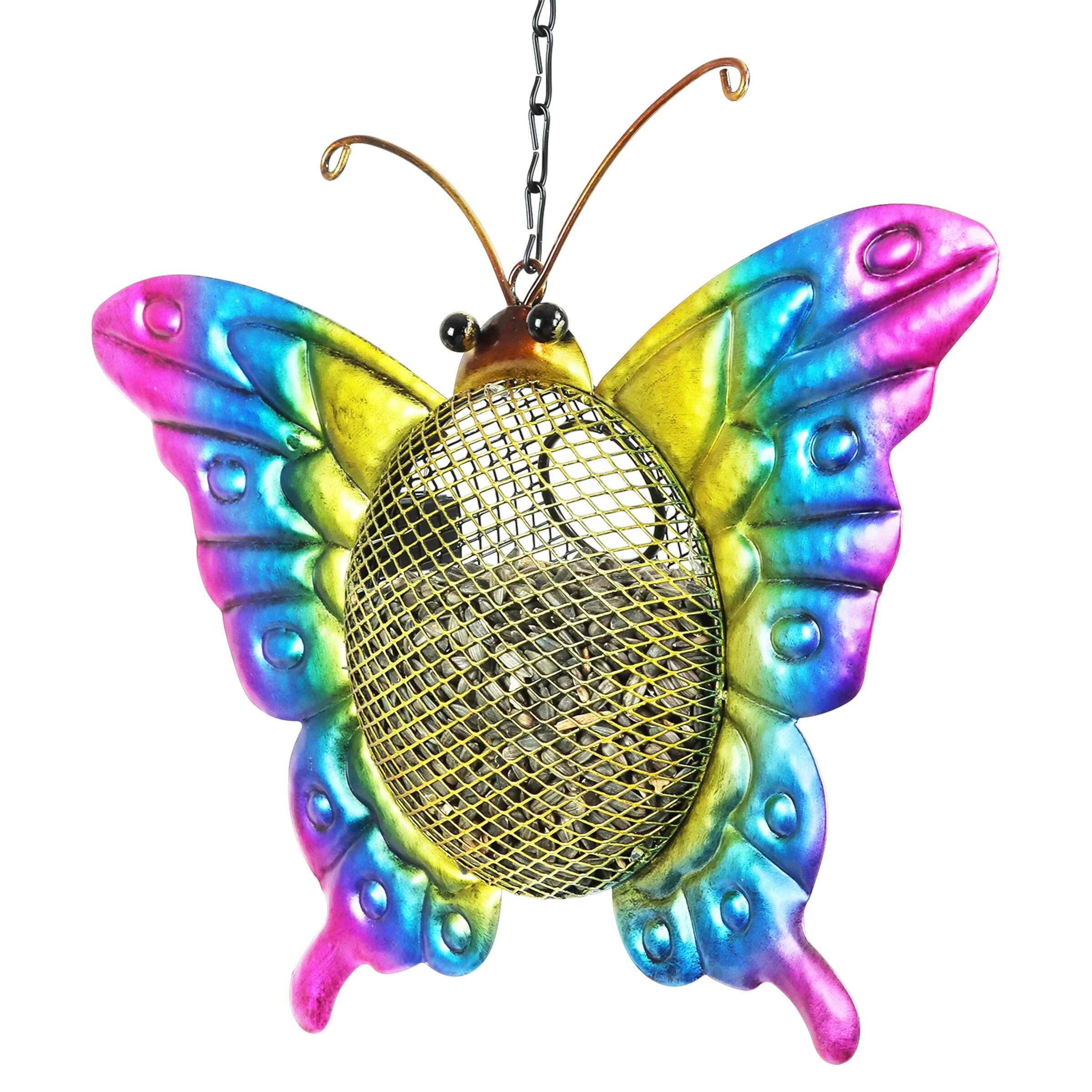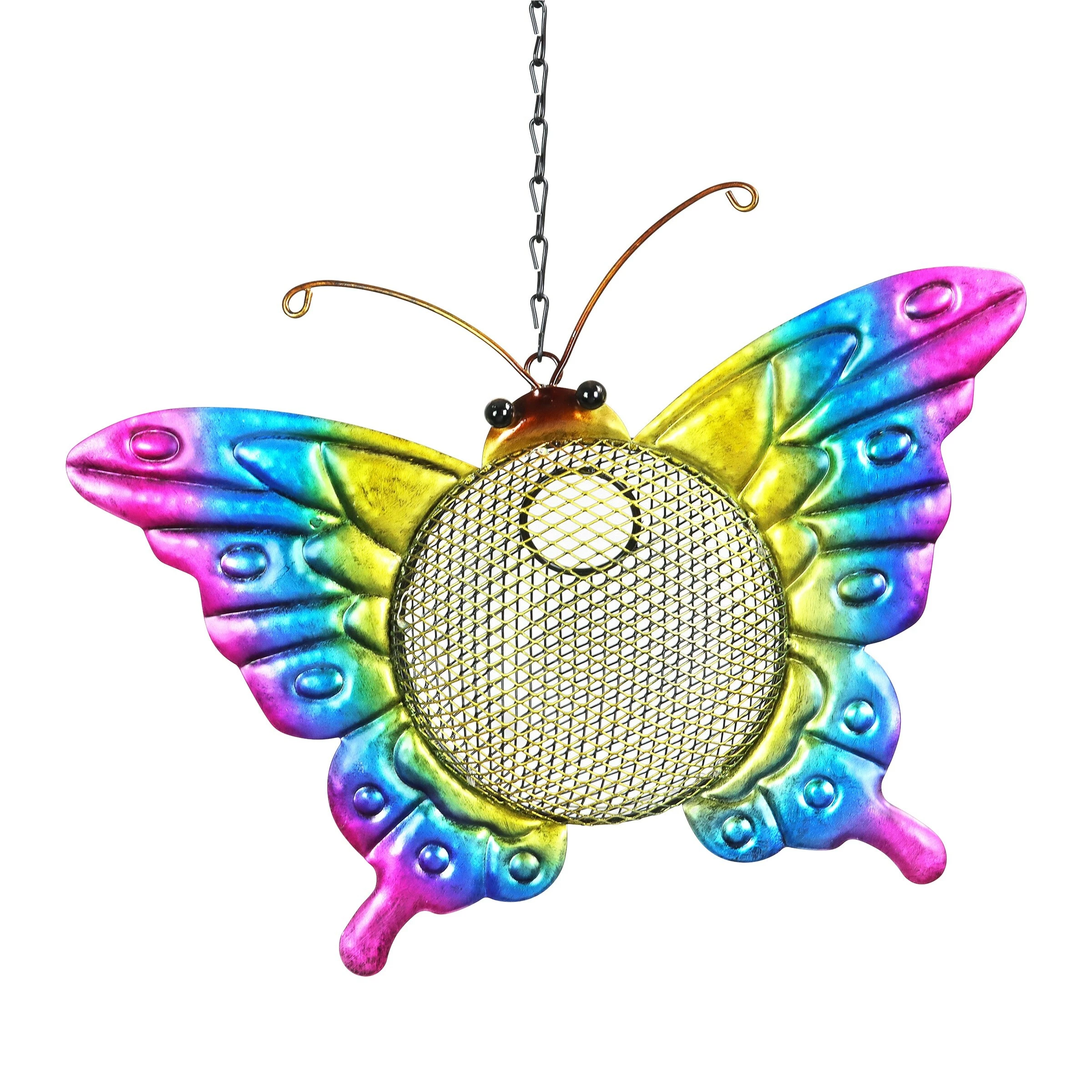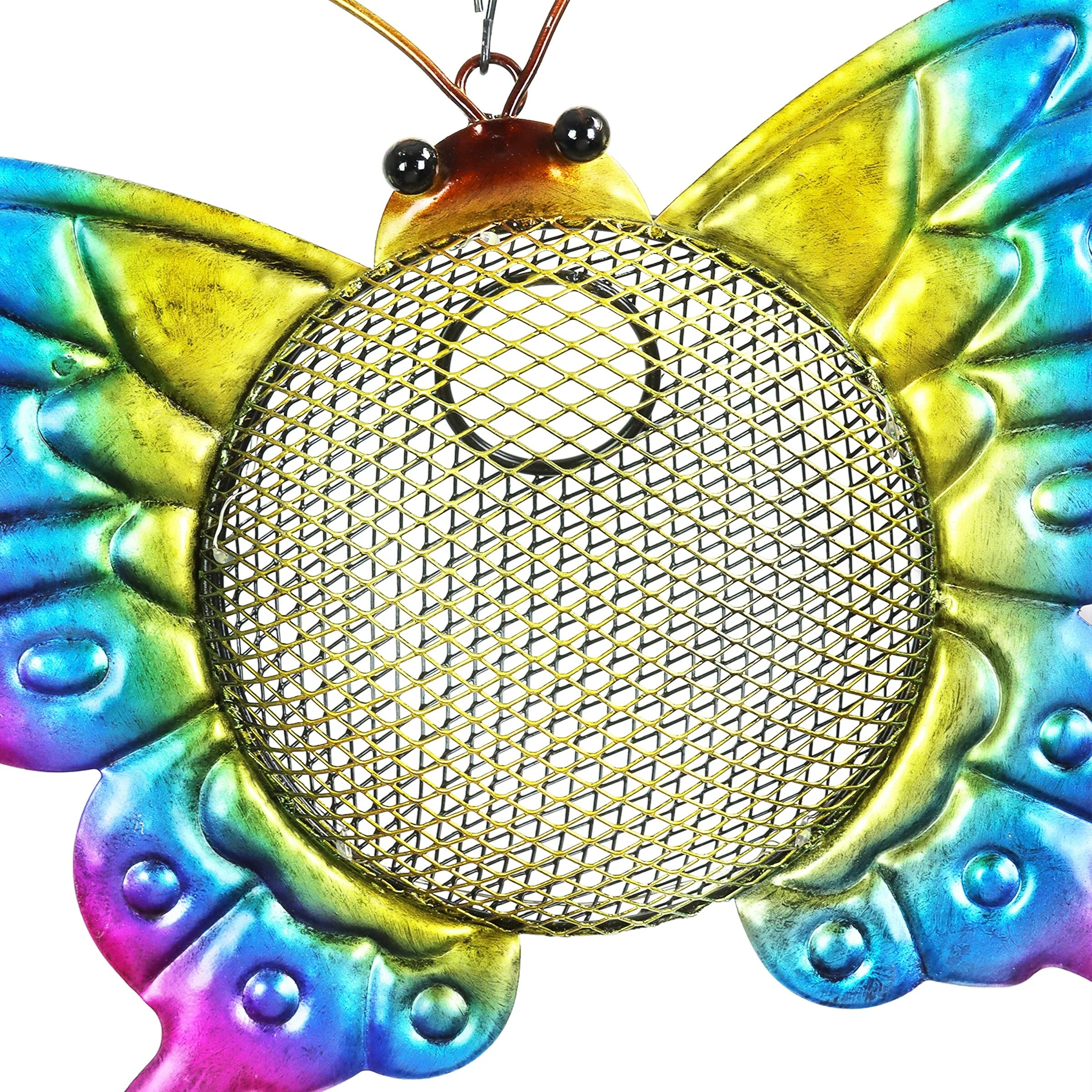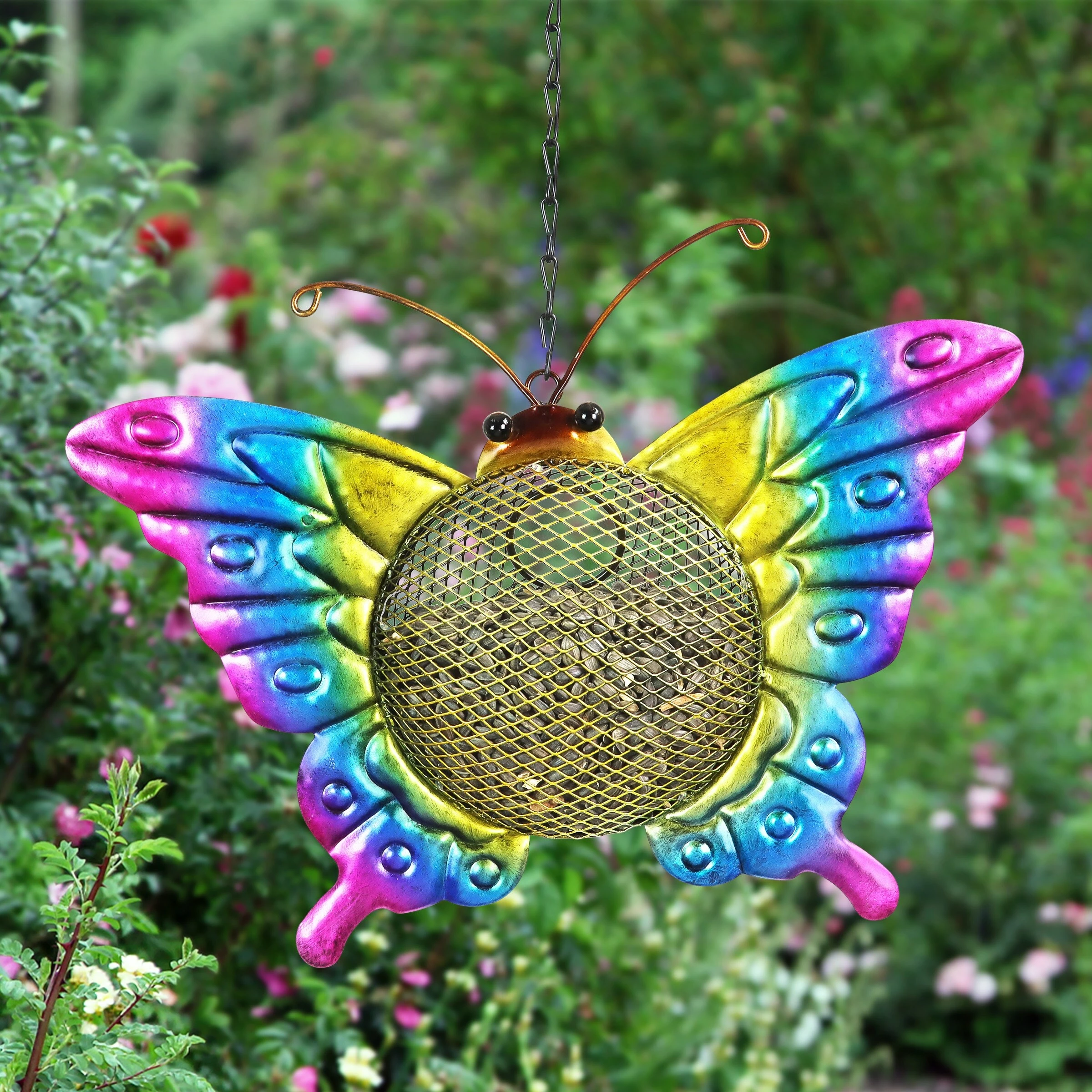 Call birds from near and far to feed from this beautifully hand painted Solar Butterfly Bird Feeder. Feeder illuminates at dusk, easily hangs anywhere and welcomes birds to eat from its convenient metal mesh basket. Adds instant charm to your garden and makes a wonderful gift for the bird watching enthusiast!