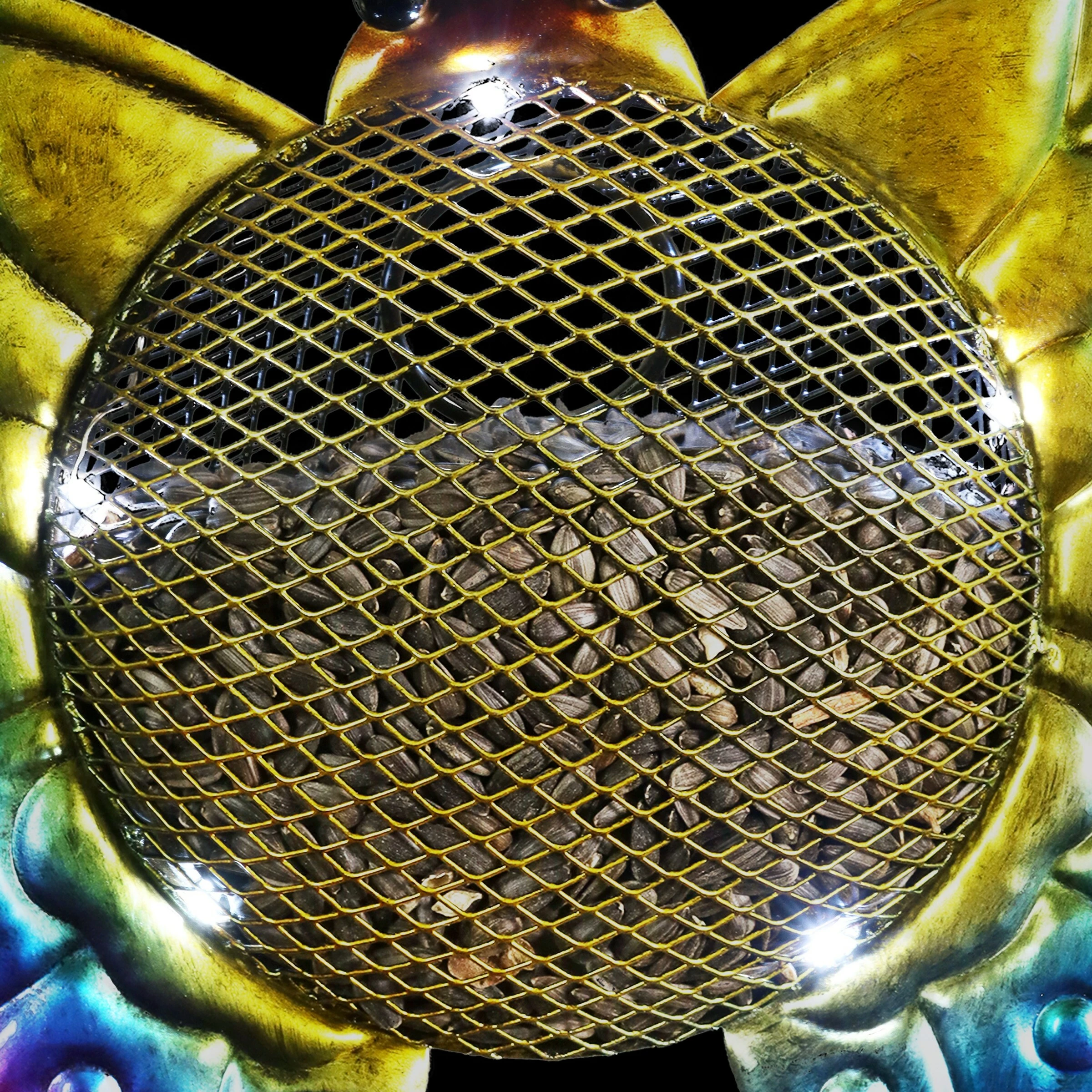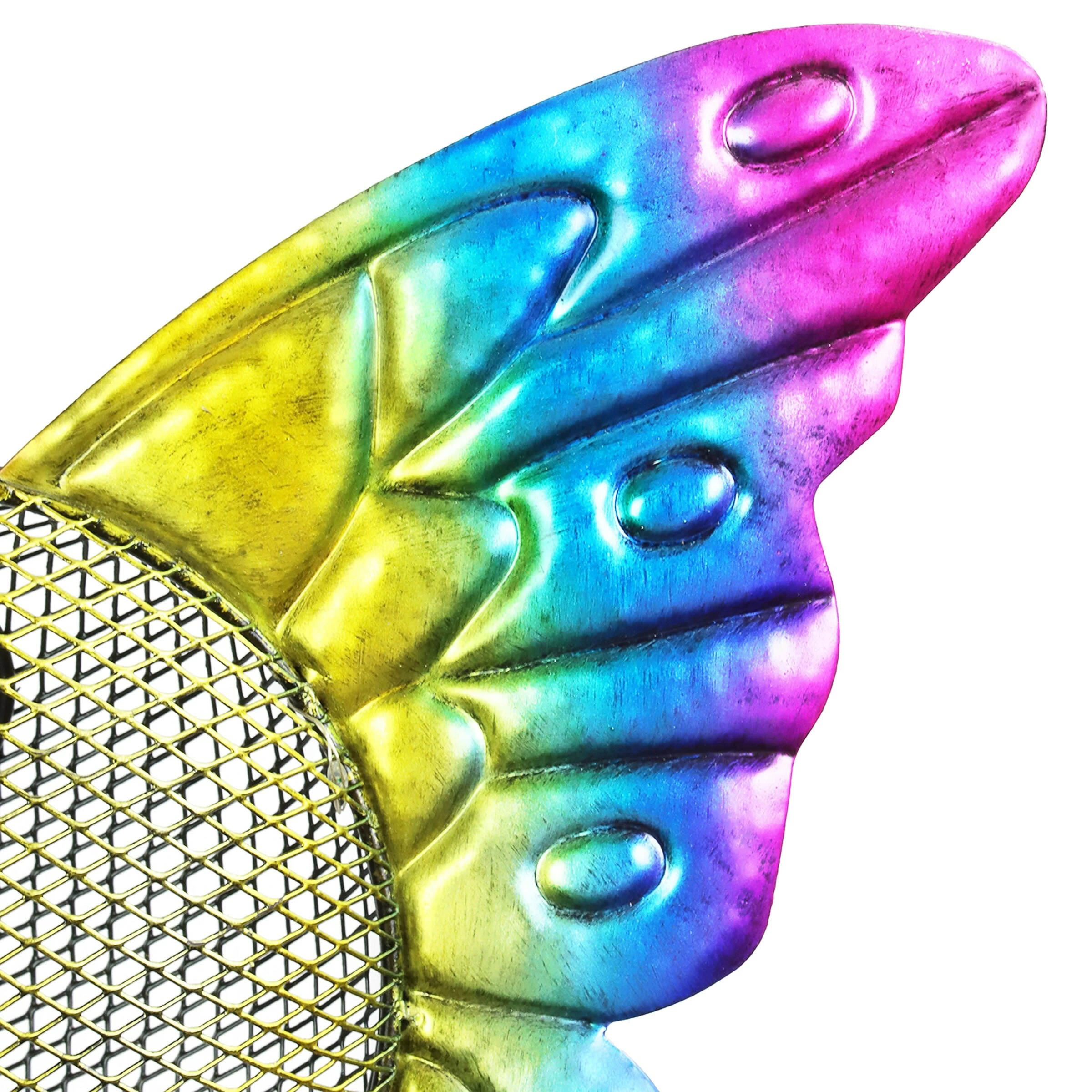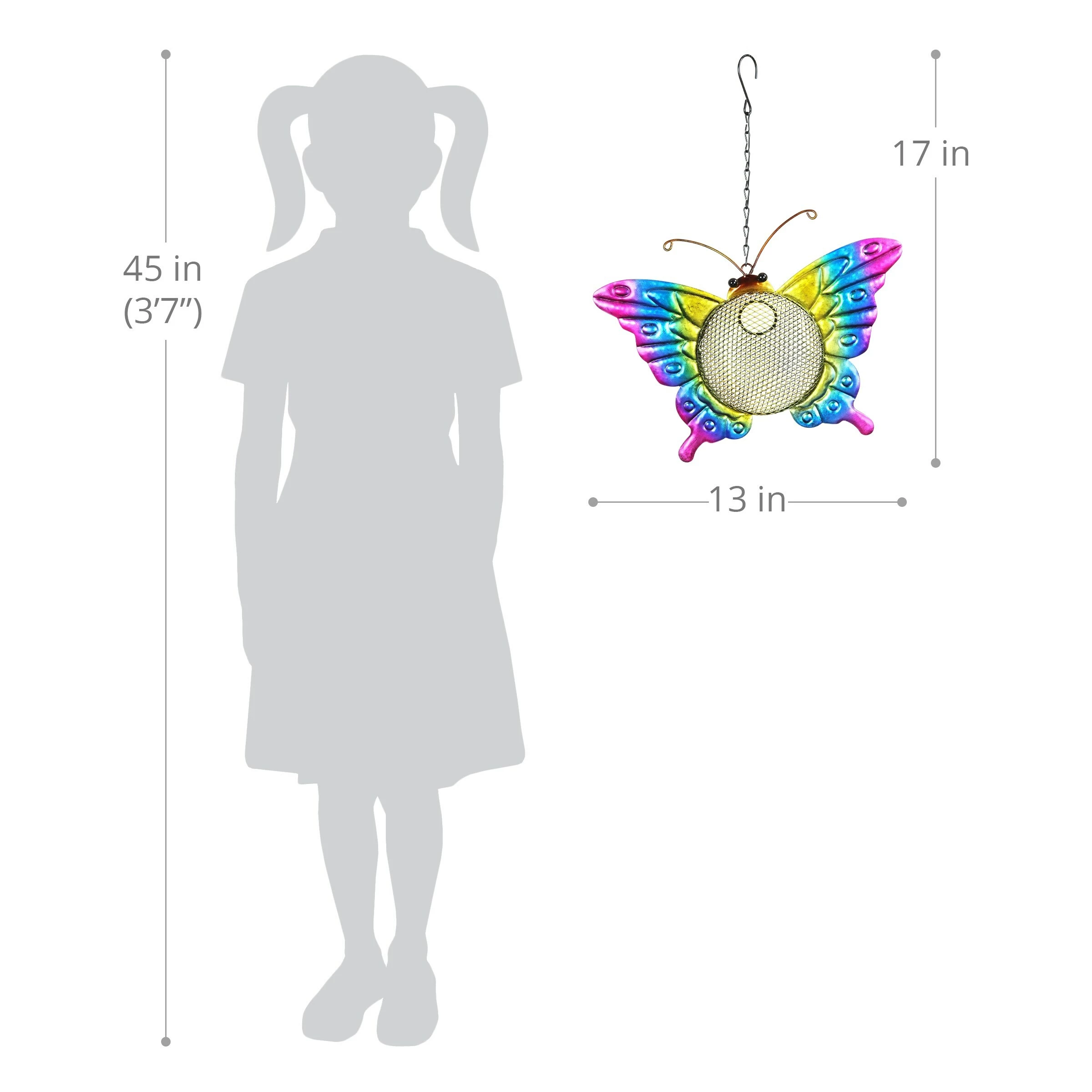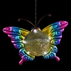 Call birds from near and far to feed from this beautifully hand painted Solar Butterfly Bird Feeder. Feeder illuminates at dusk, easily hangs anywhere and welcomes birds to eat from its convenient metal mesh basket. Adds instant charm to your garden and makes a wonderful gift for the bird watching enthusiast!