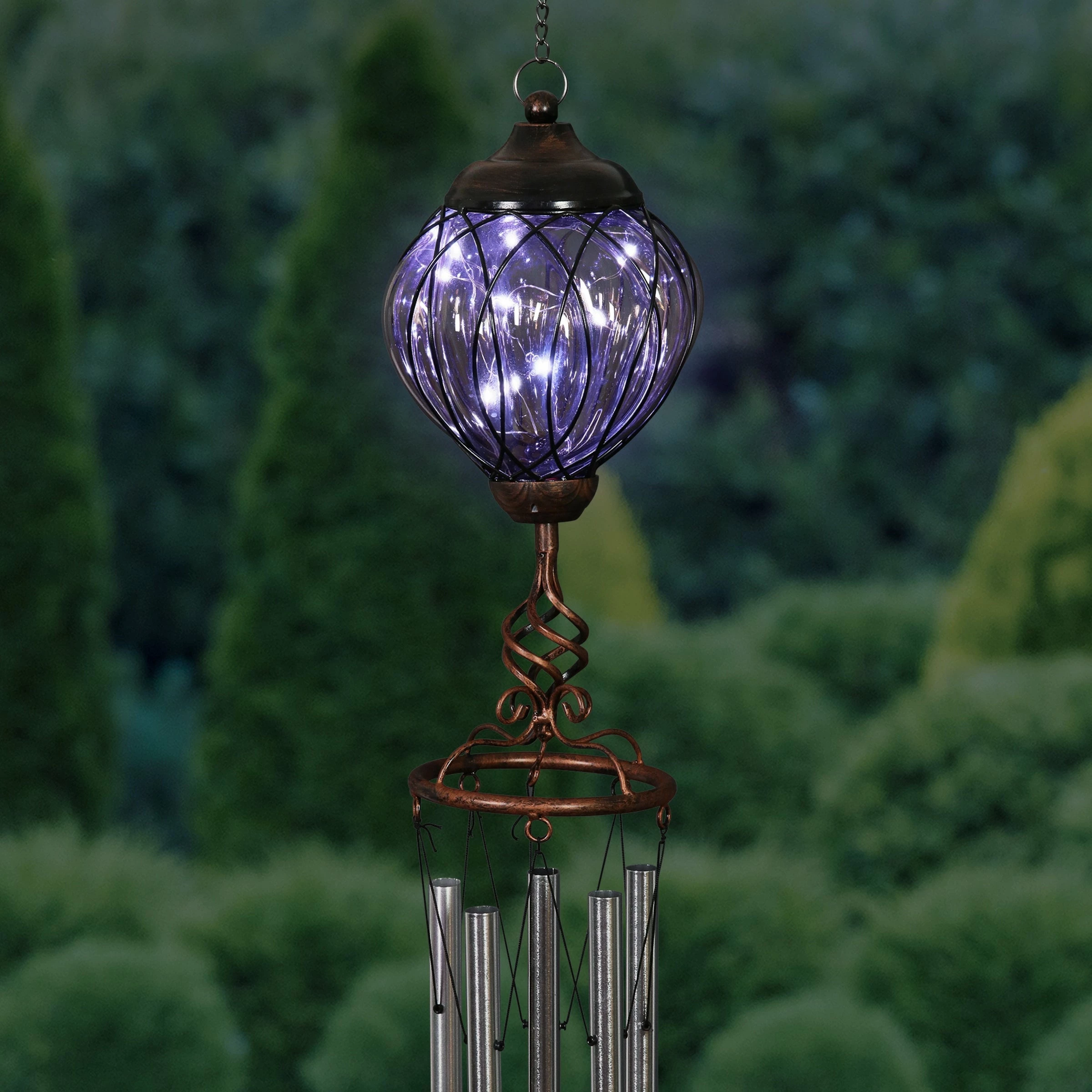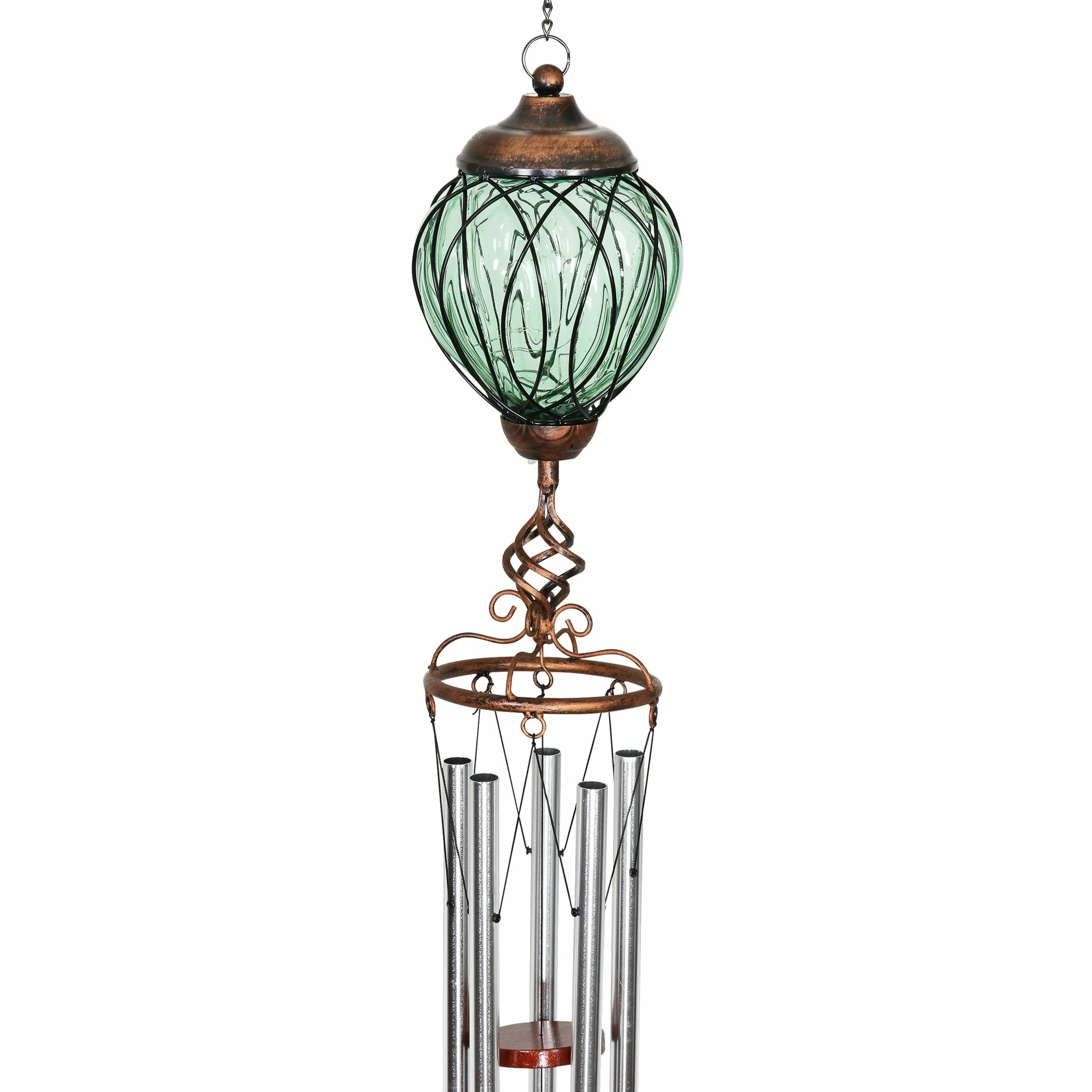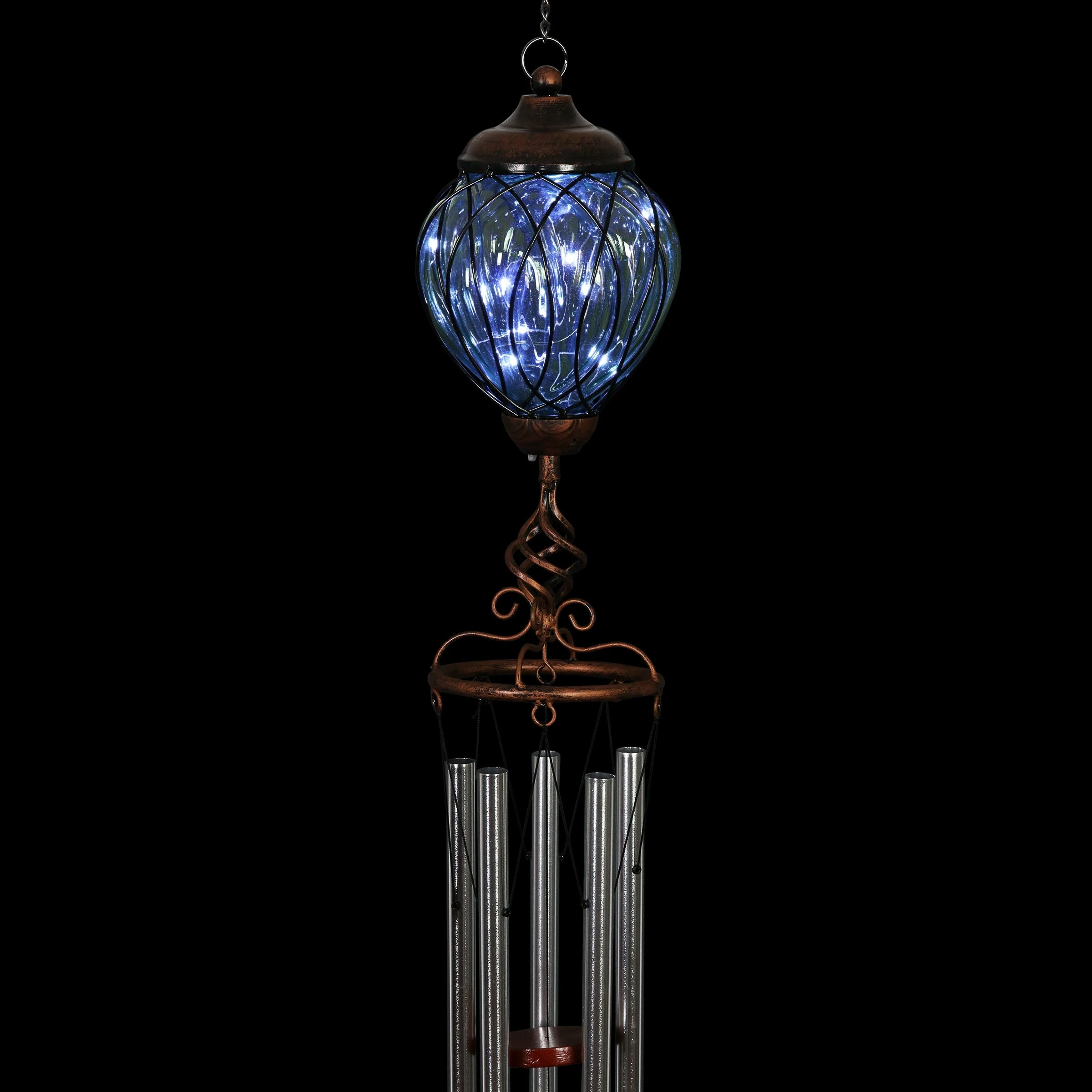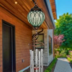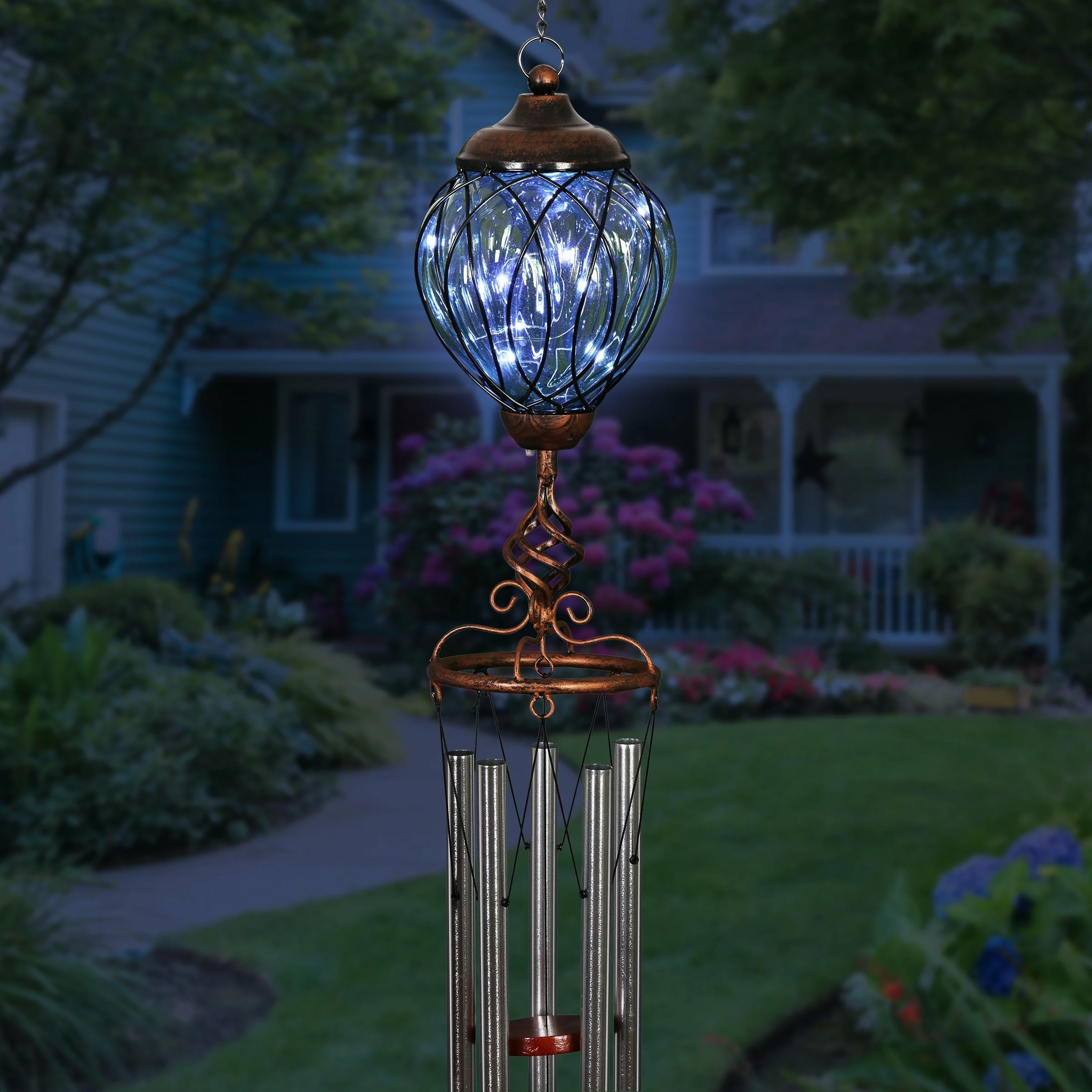 Enjoy the relaxing sounds of this illuminating Solar Glass and Metal wind chime. As the sun sets and dusk settles in, watch your beautiful Oval Chime automatically glow with a string of 9 LED firefly lights! The spiraling metal detail adds and extra touch of elegance. Makes a thoughtful gift and a wonderful addition to any home!