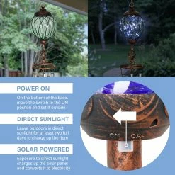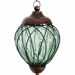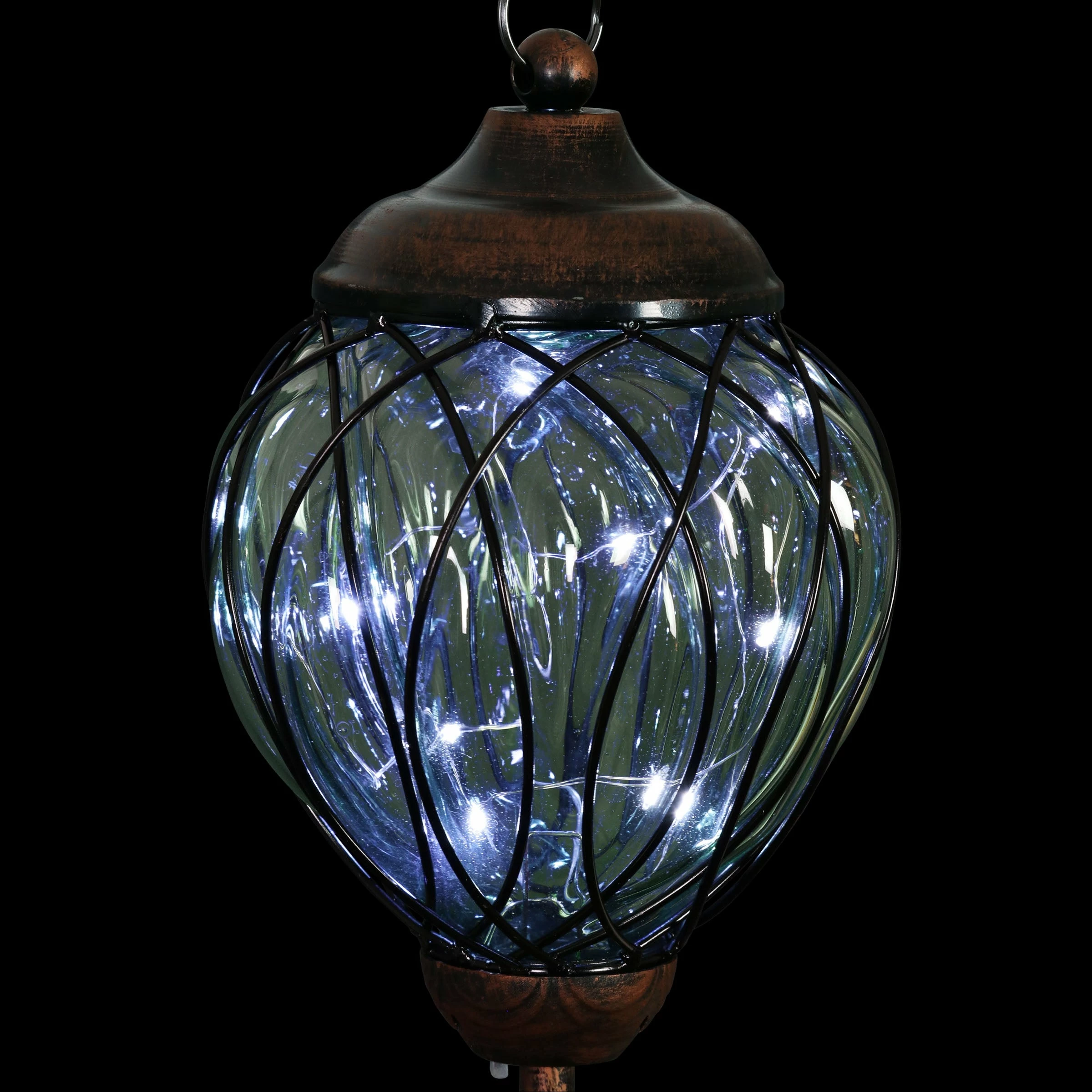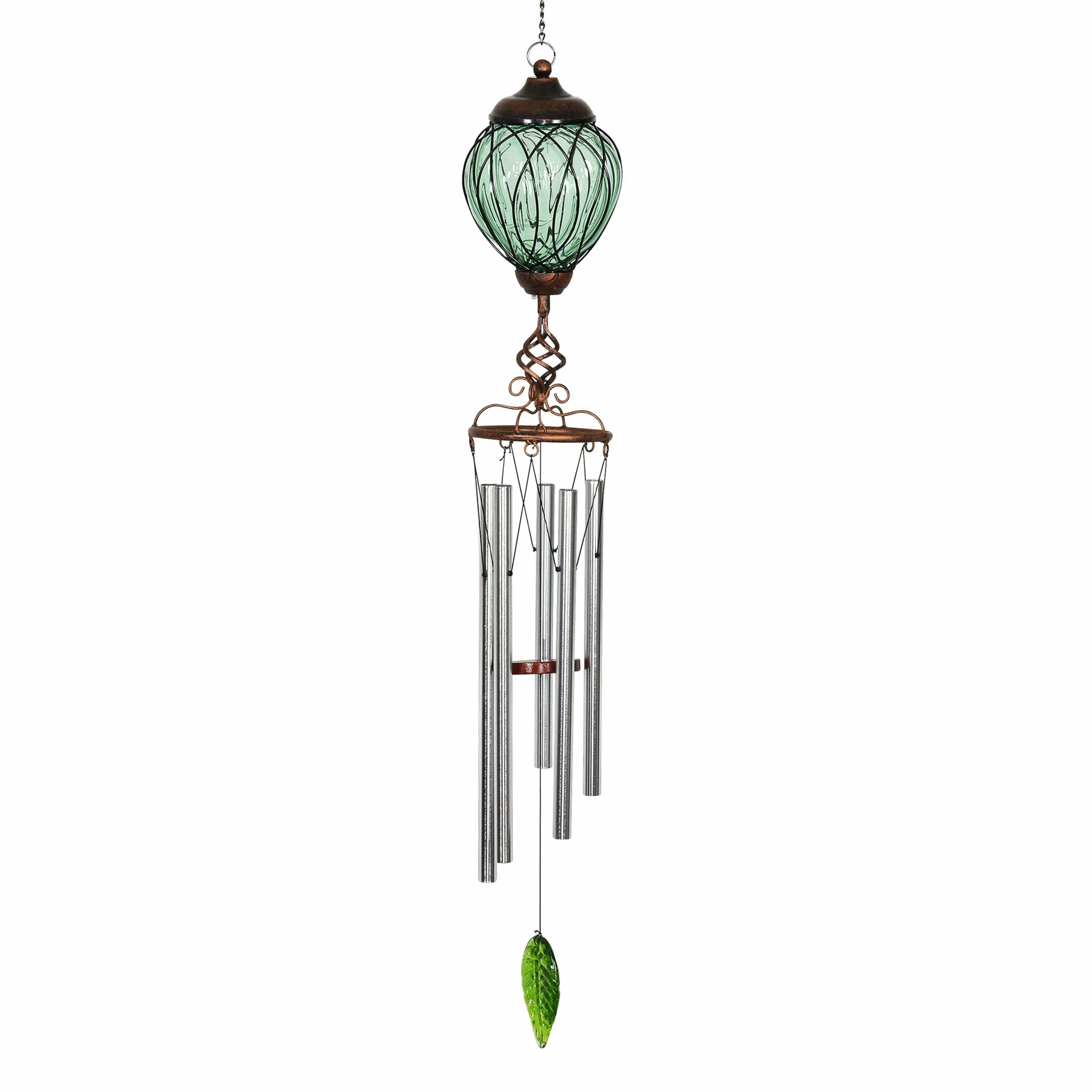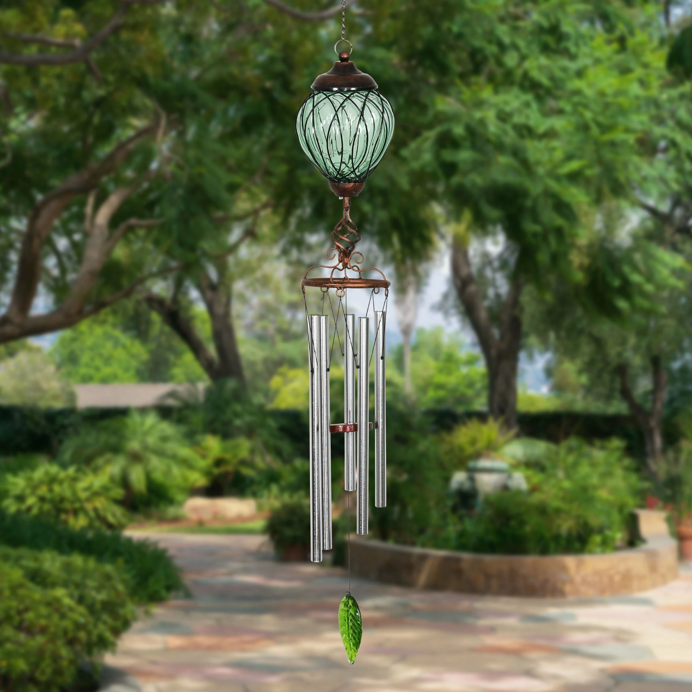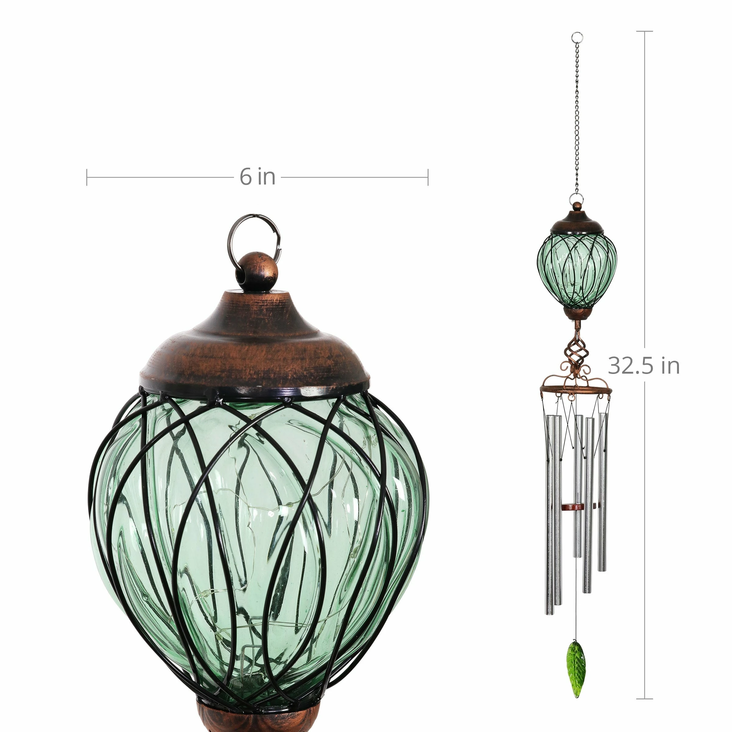 Enjoy the relaxing sounds of this illuminating Solar Glass and Metal wind chime. As the sun sets and dusk settles in, watch your beautiful Oval Chime automatically glow with a string of 9 LED firefly lights! The spiraling metal detail adds and extra touch of elegance. Makes a thoughtful gift and a wonderful addition to any home!
