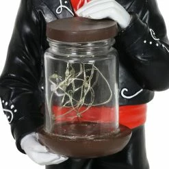 This Day of the Dead inspired statue joyfully honors the spirit of the deceased. The timer will turn the lights on at the same time each night! With his hand painted face, traditional garb and illuminating jar this statue adds a festive touch to your Halloween dΓ©cor.