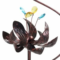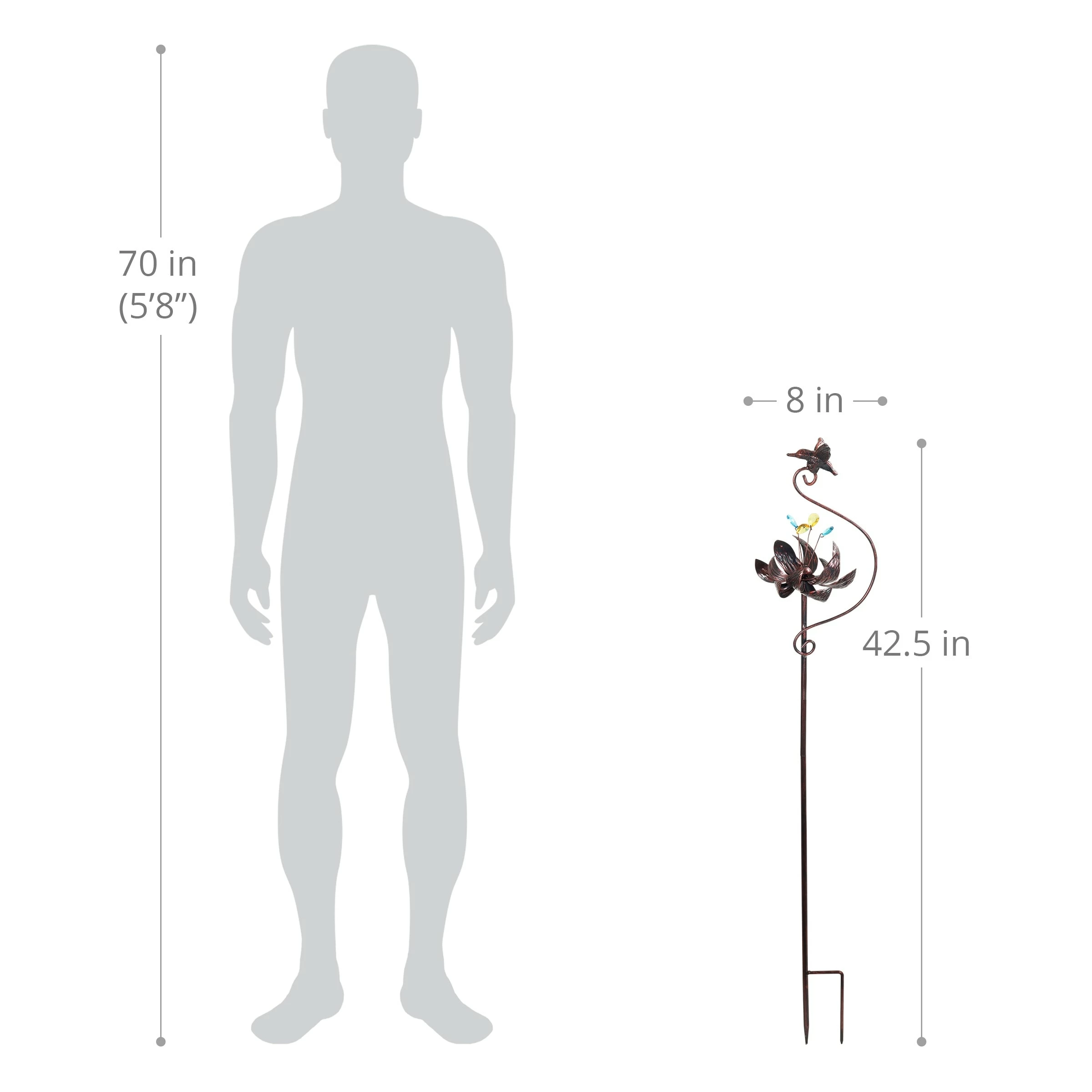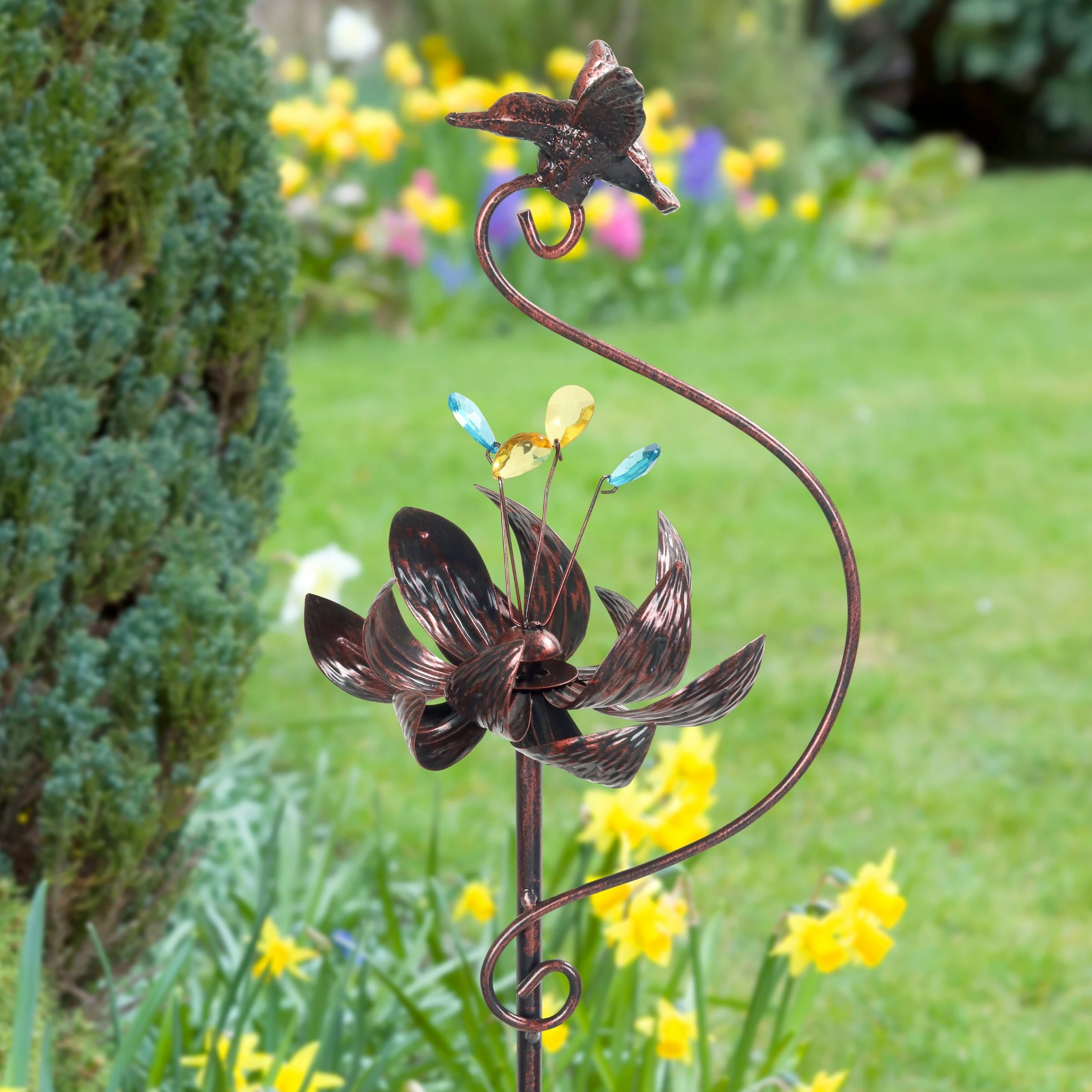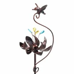 A beautiful spinning bronze lotus flower stake adds an artistic flair to your garden. The elegant metal hummingbird hovers gently above the flower itself ever hoping to land. The beaded details in the center of the flower add just a pop of color to this stunning piece of art. This metal garden stake makes absolutely charming addition to your home and a great gift idea.