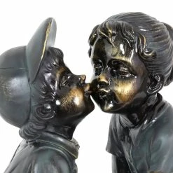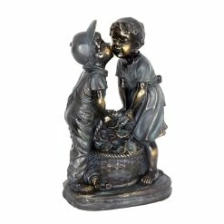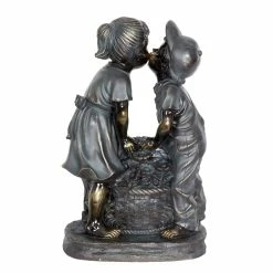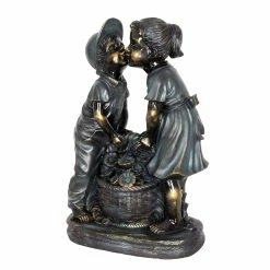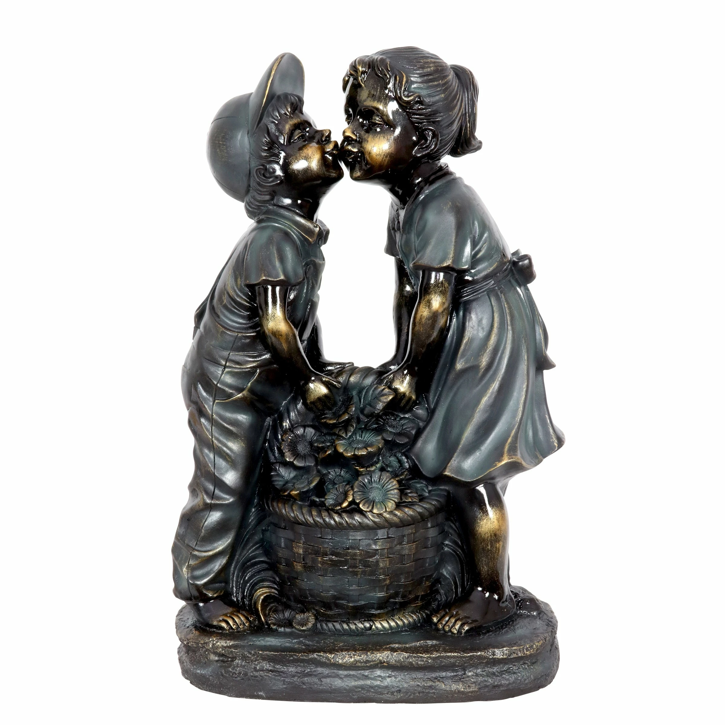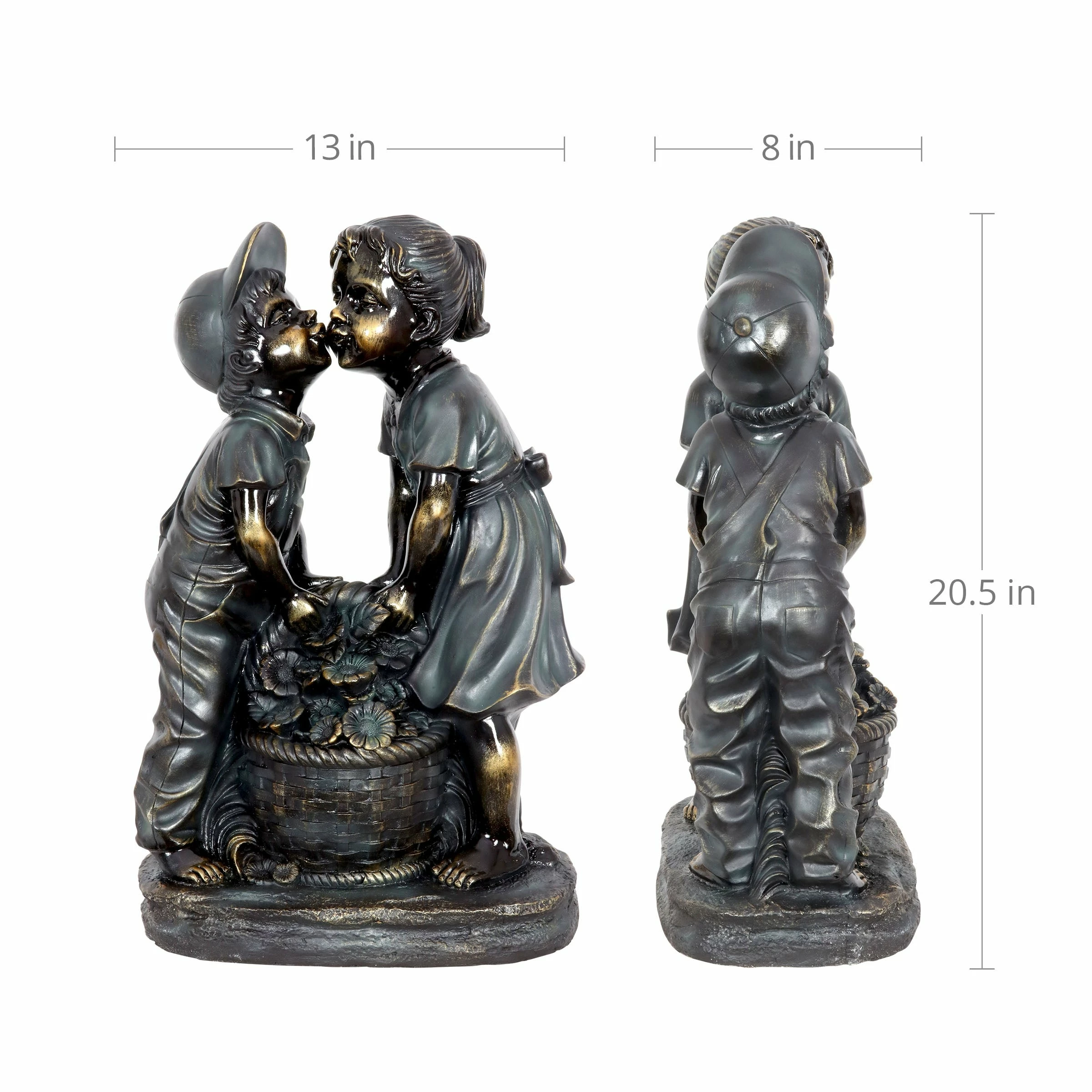 Capturing sweet love and innocence, this adorable garden statuary features a young boy stretching up to kiss a beautiful girl. This piece of art is elegantly designed and hand painted with a beautiful patina finish. Makes a charming and luxurious looking addition to your garden decor. Show some love for your green thumb friends and family by giving them fantastic gardening gifts. Exhart’s garden statues are sure to put a smile on everyone’s faces with their unique hand painted designs. Exhart’s faux bronze garden statues offer the look of expensive luxury made from the durability (and affordability) of resin. Resin is a rotationally molded composite blend that can mimic the look of stone and metal materials, but at a more affordable cost and a fraction of the weight. Resin products are strong, durable, non-porous and resist water damage, rust and discoloration. This garden statue is also finished off with a protective weather-proof coating, ensuring years of enjoyment. Every aspect of this endearing hand-crafted statue has been meticulously designed by the Exhart team.