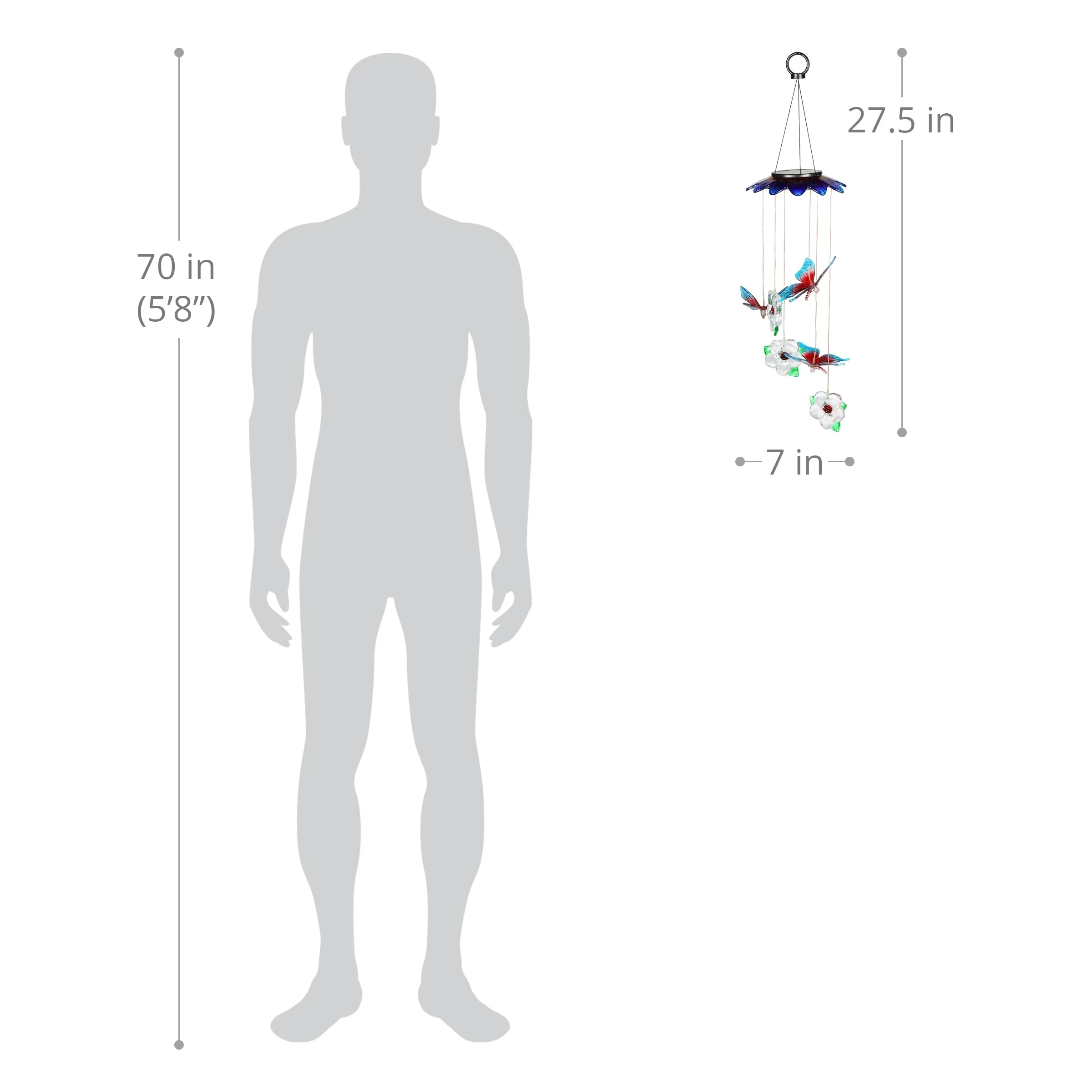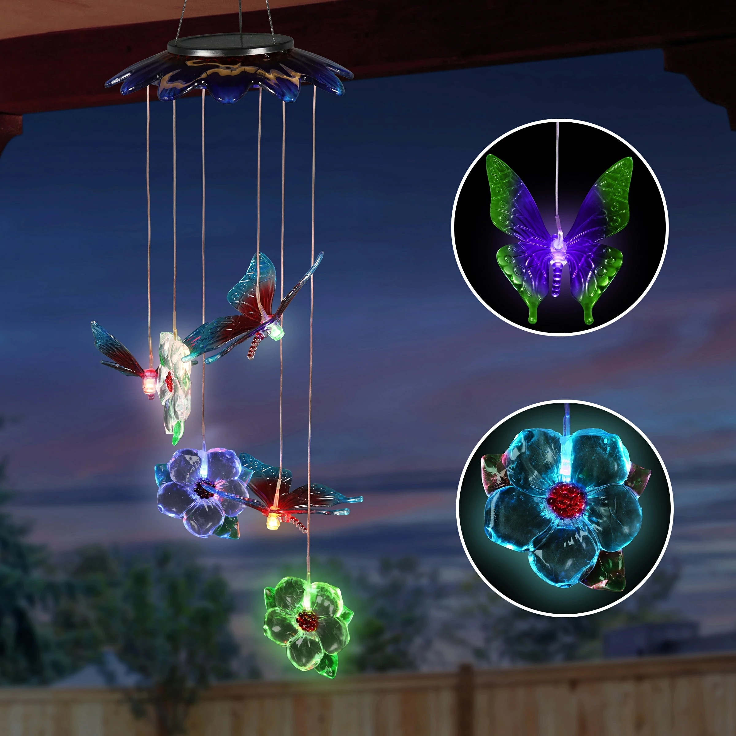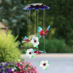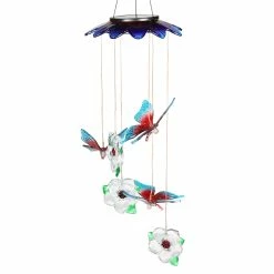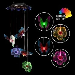 Beautiful butterflies birds and flowers are suspended in mid air with this hanging mobile dΓ©cor! Each charm has it’s own solar powered color changing LED light that will automatically glow within at dusk. This hanging piece of art makes a wonderful addition to any patio or garden and a beautiful gift for the nature enthusiast!