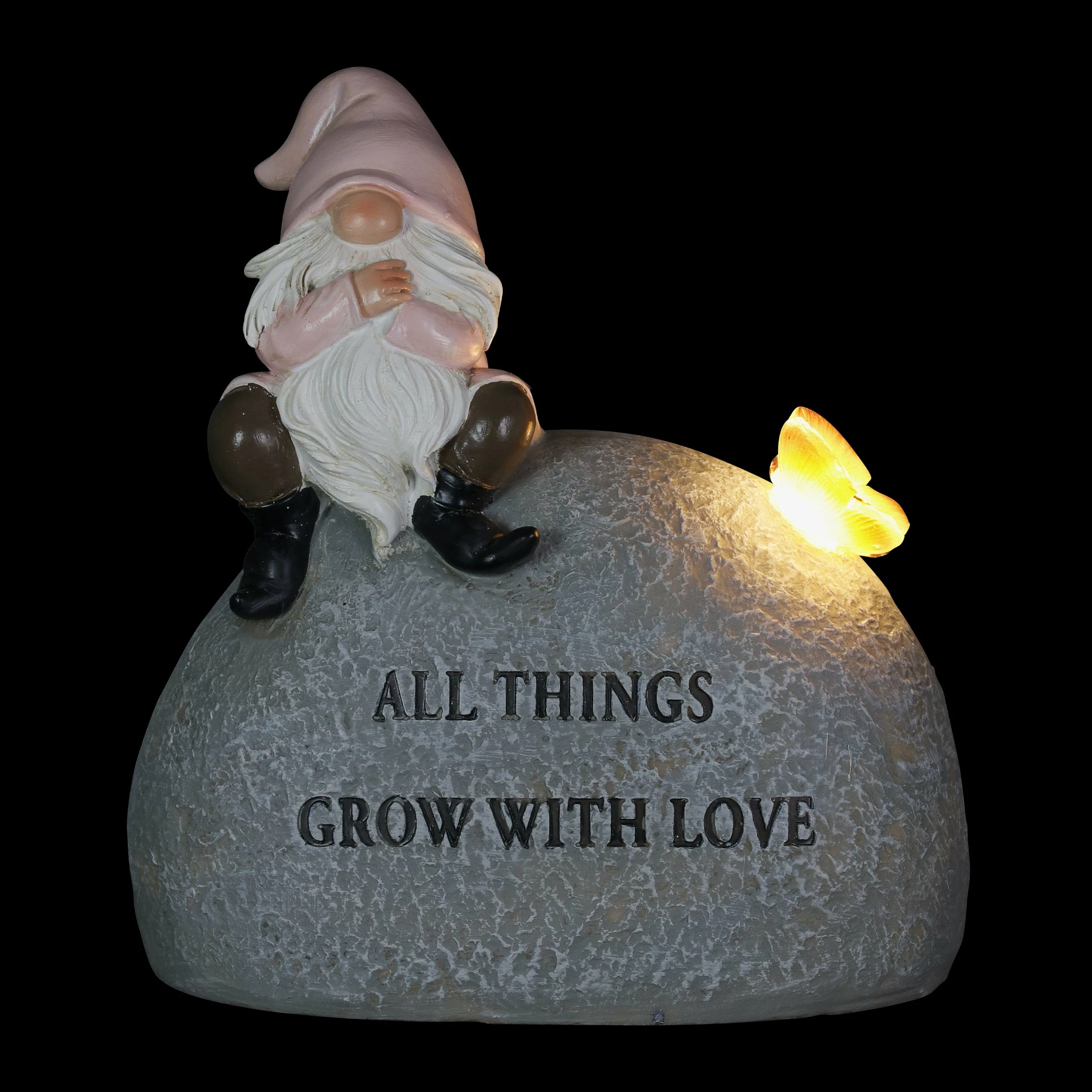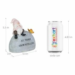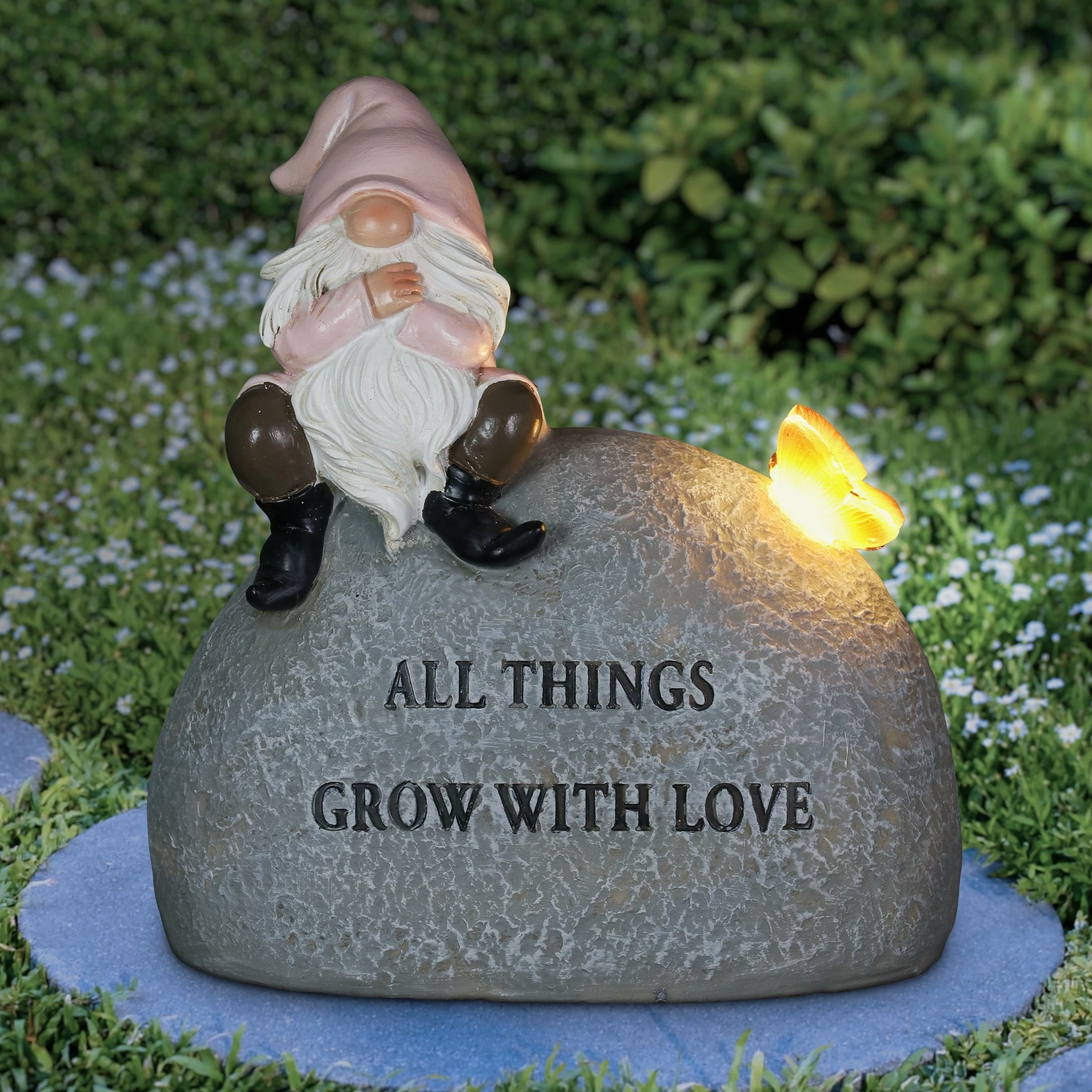 This charming little solar gnome garden stone has a deep and profound message! Inscribed with “All Things Grow With Love” this garden dΓ©cor is made to inspire. Solar powered LED light will charge during the day and automatically illuminate the dragonfly at dusk! Beautifully hand painted and constructed from durable resin, this piece of garden art will endure for years of enjoyment. Makes a heartwarming gift idea too!