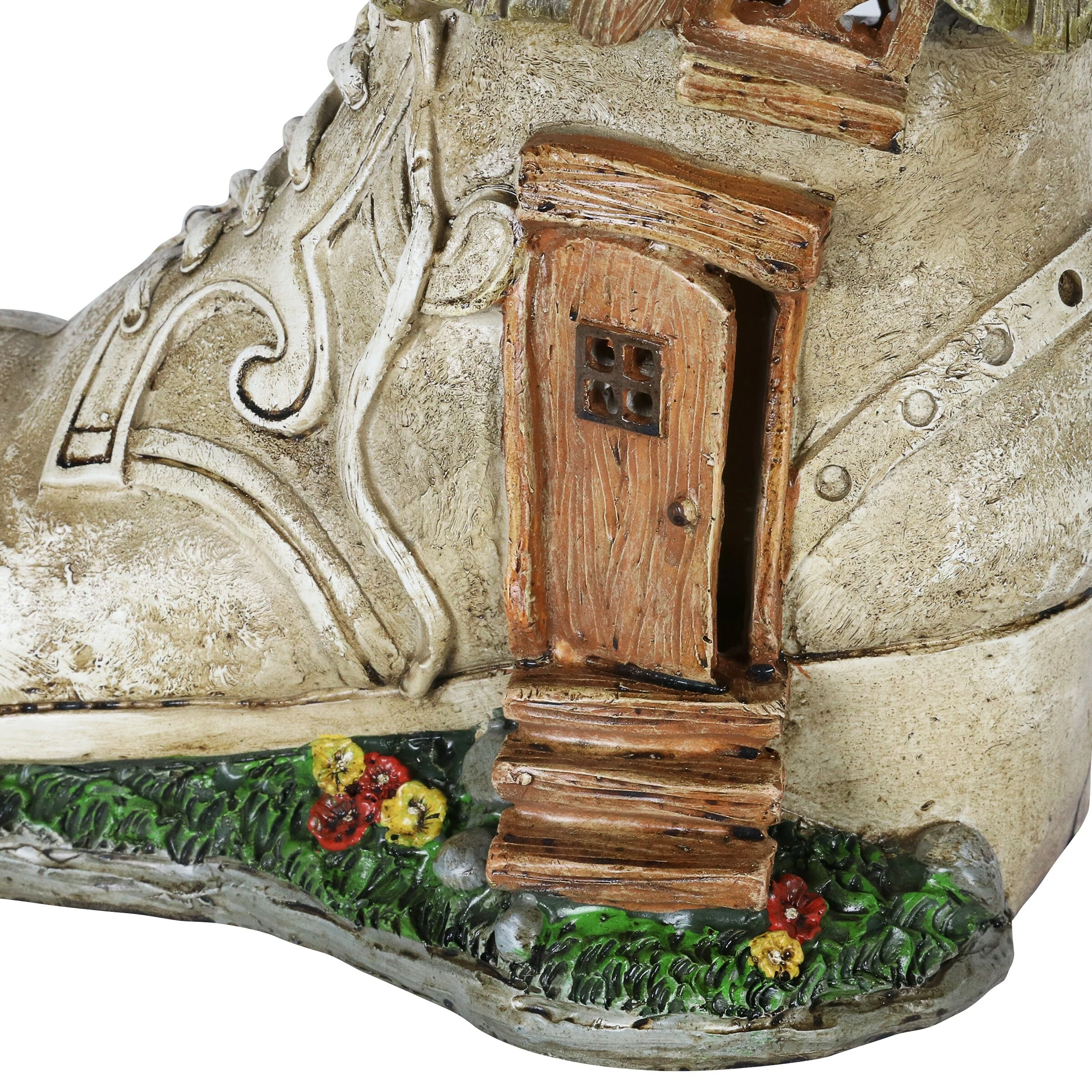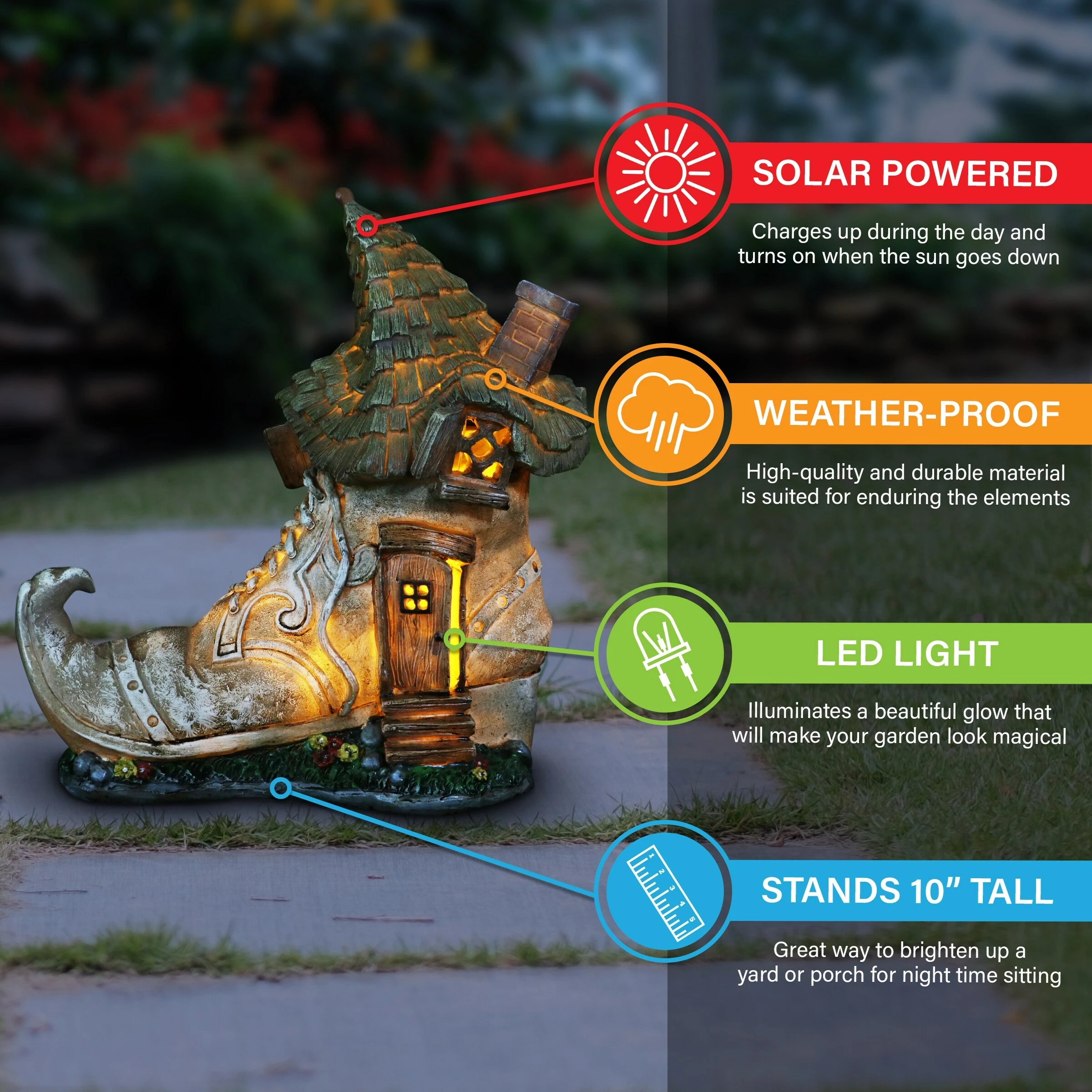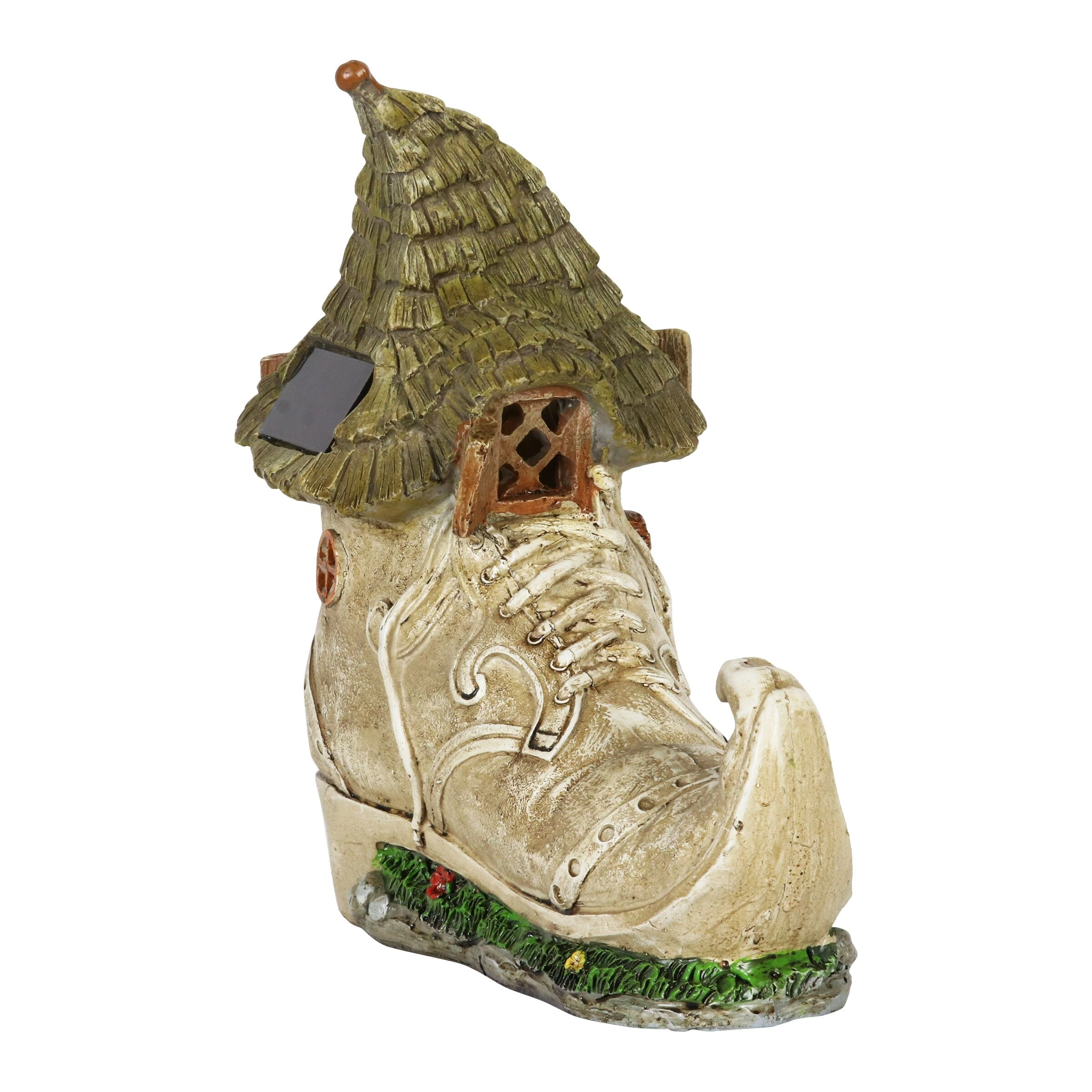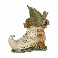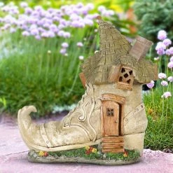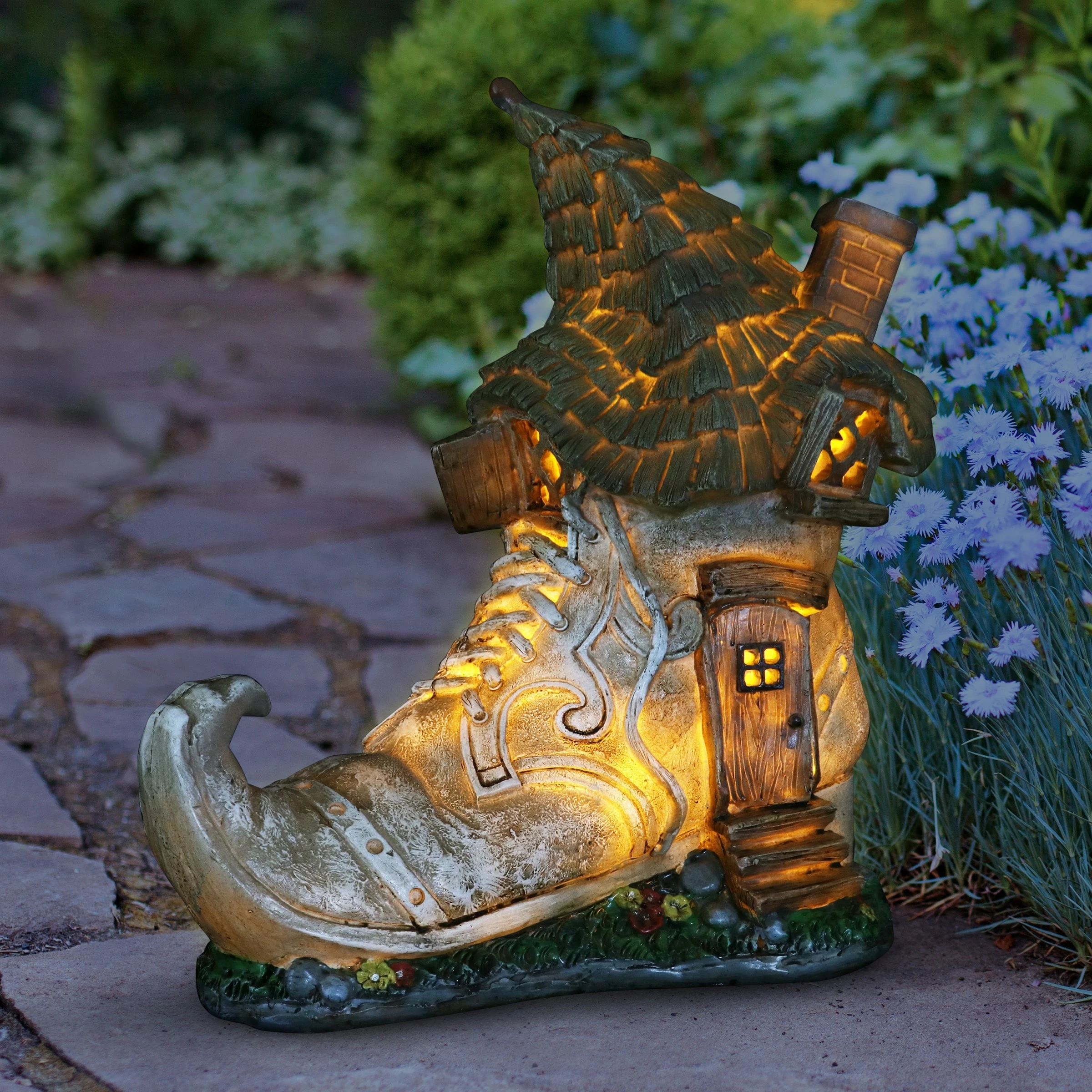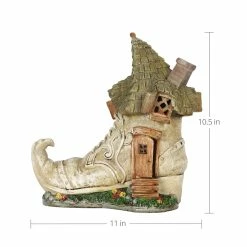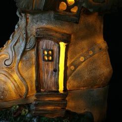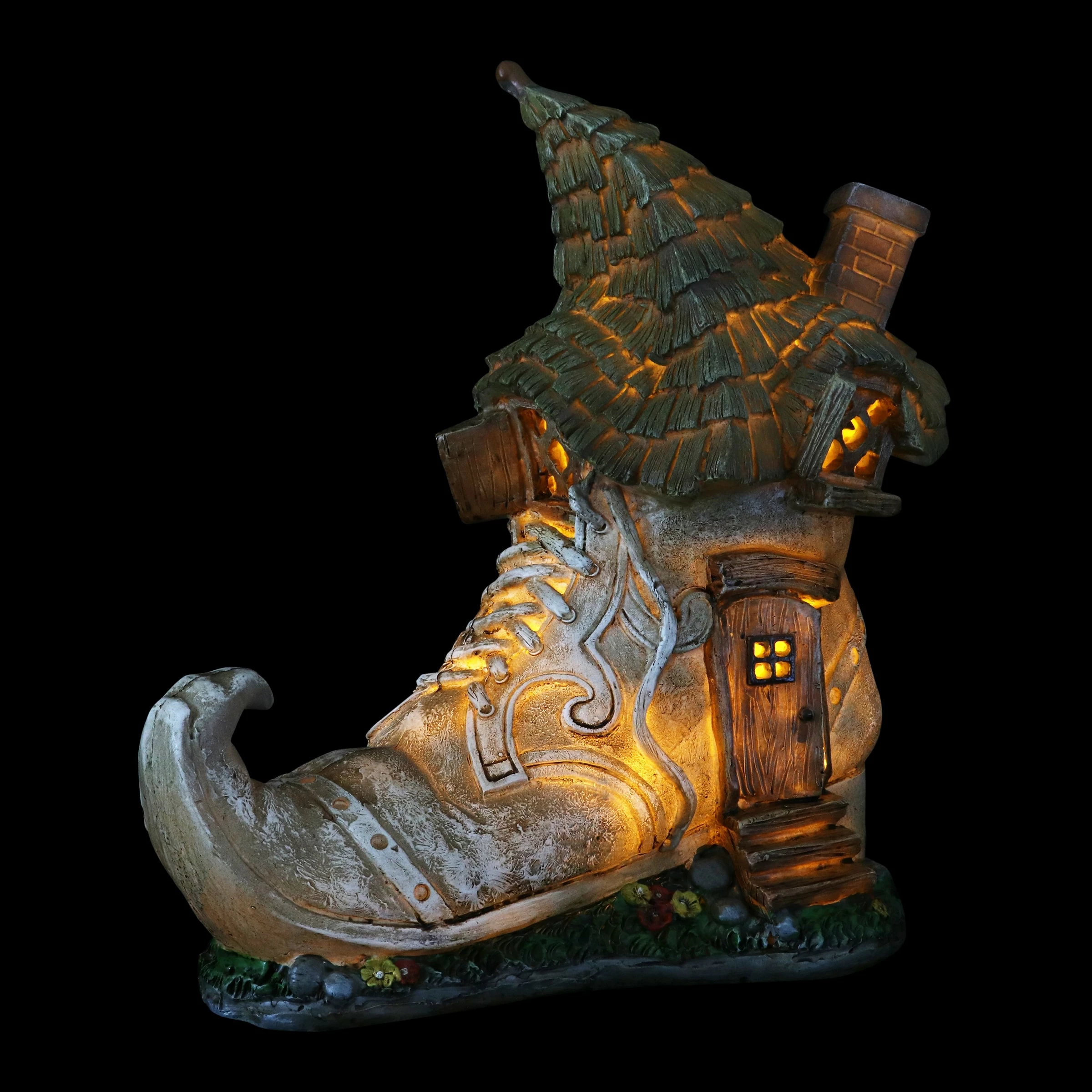 This charming Old Lady Shoe House lights up in your garden with a fairy tale like quality! Complete with a curved chimney and green leafy roof, this adorable garden dΓ©cor will add whimsy to any home. Makes a heartwarming gift!