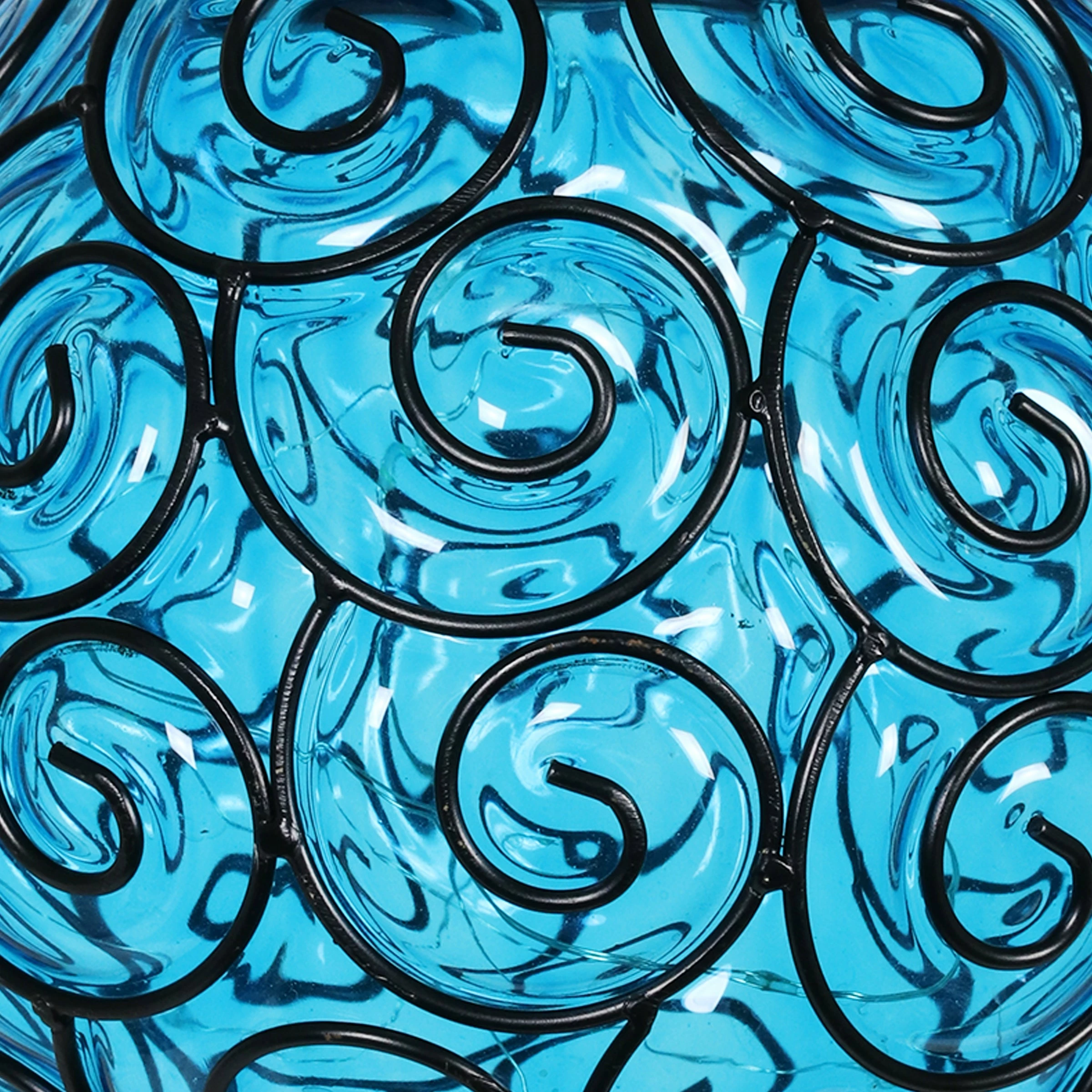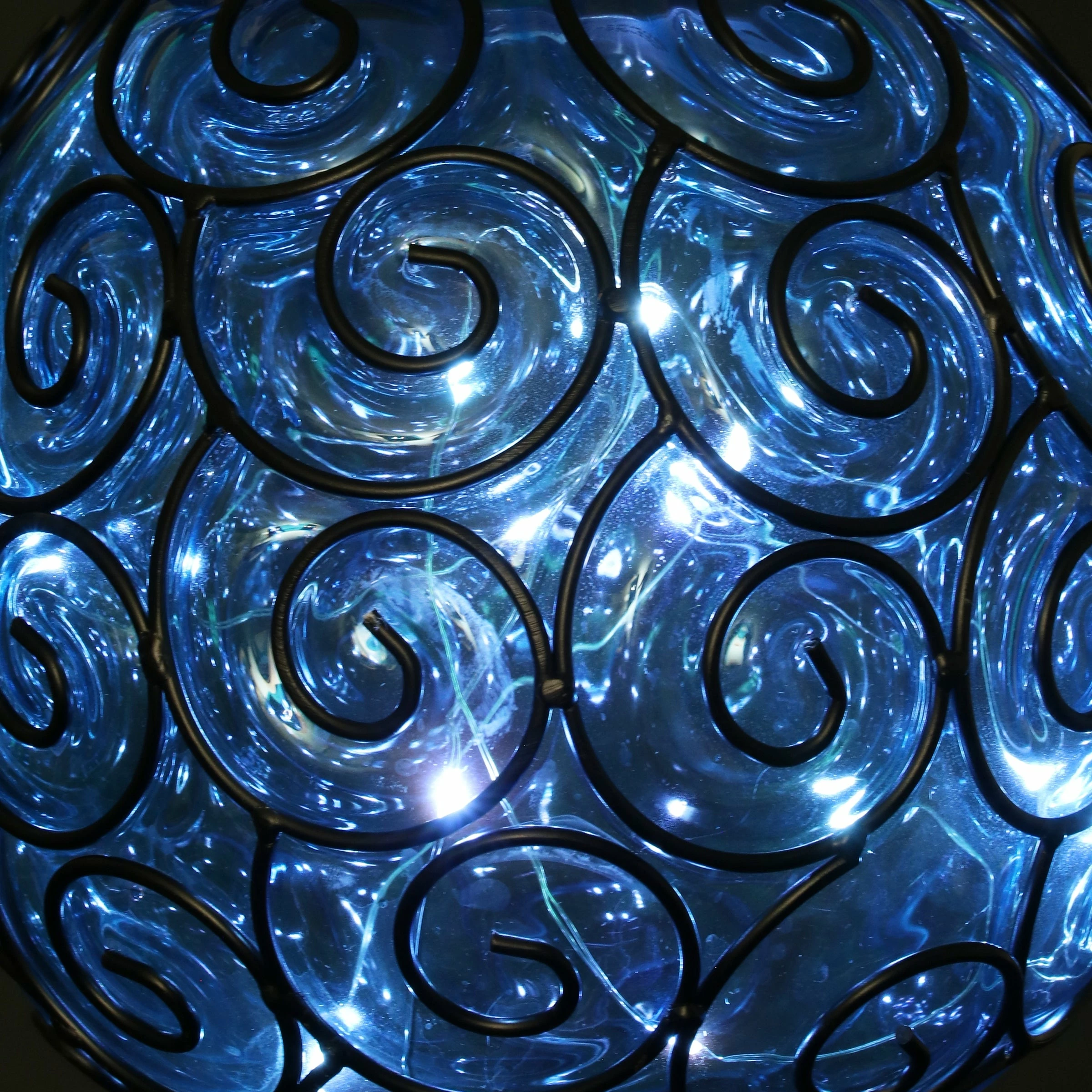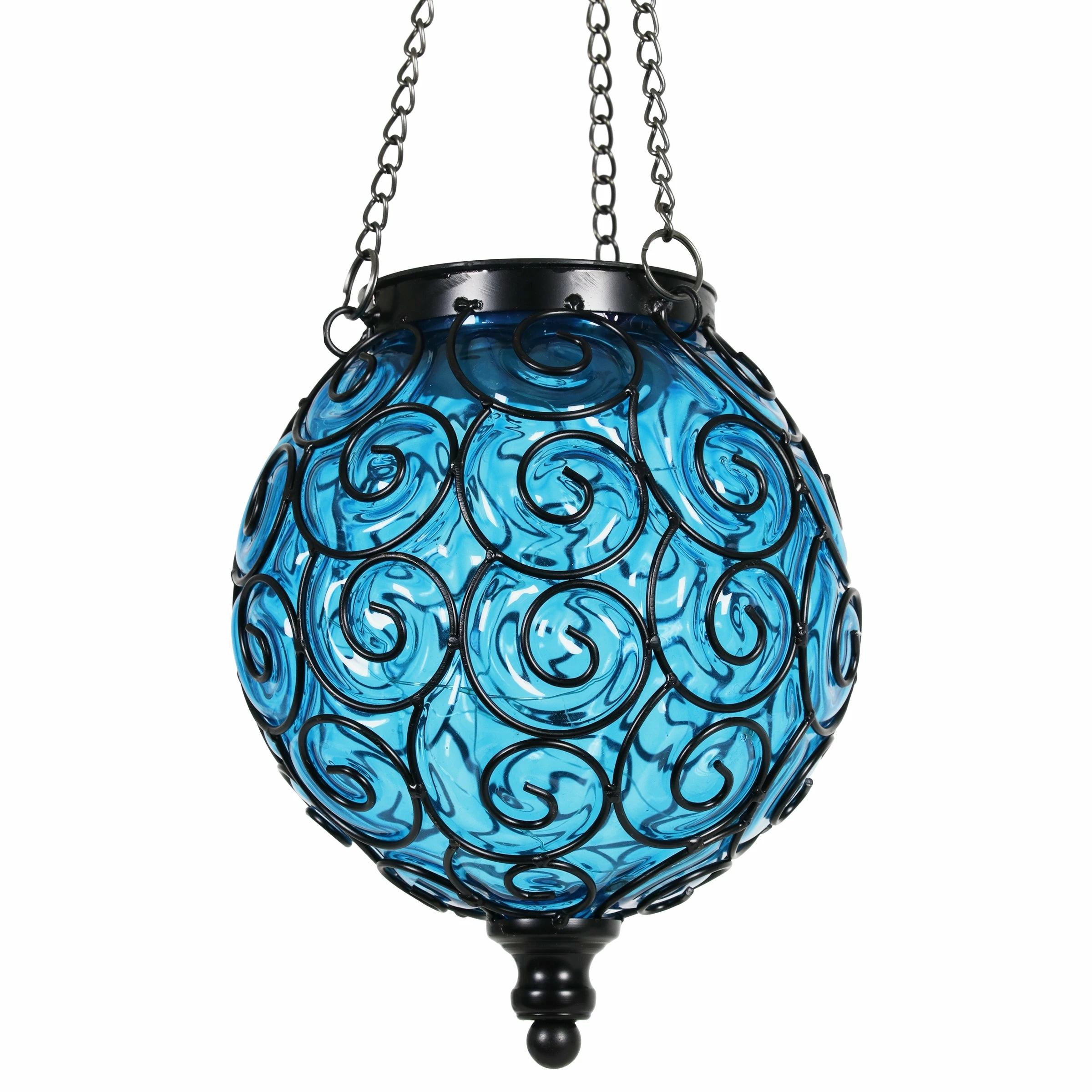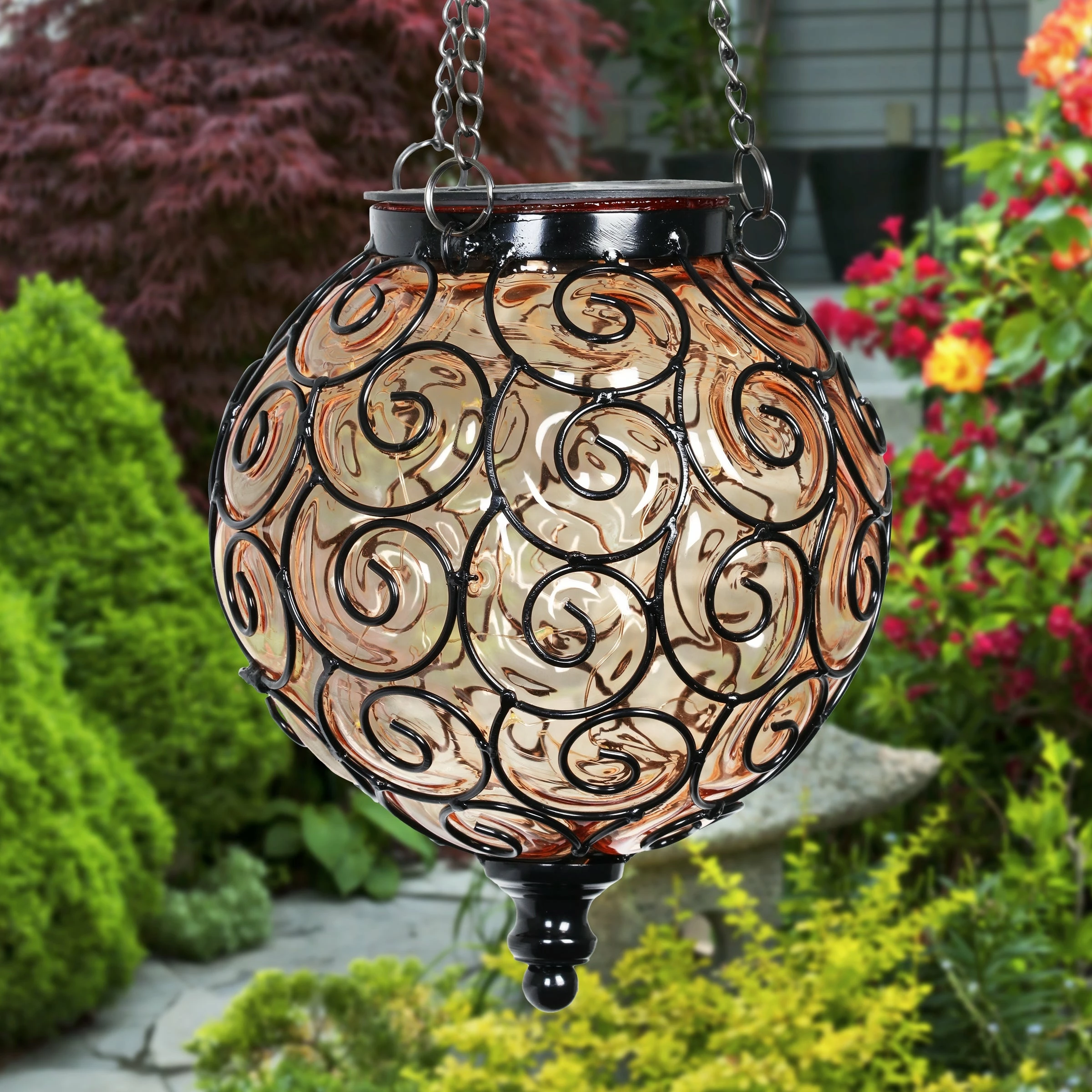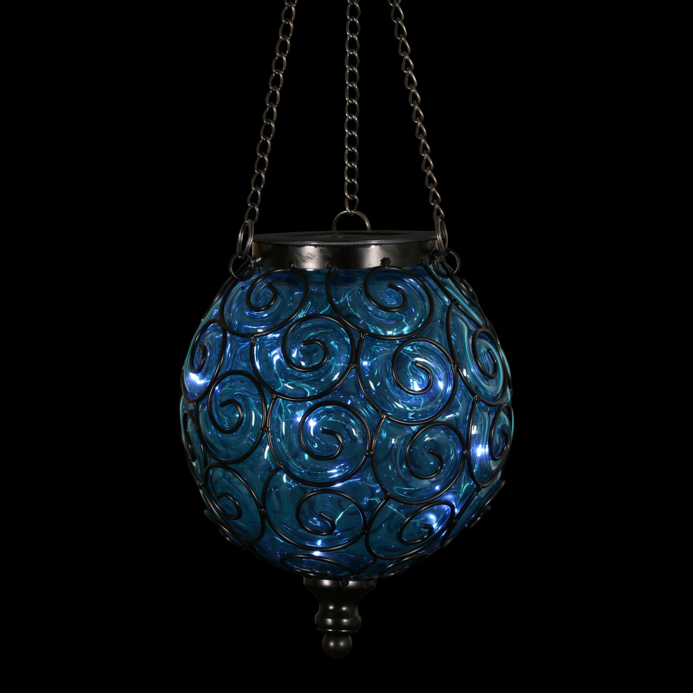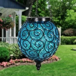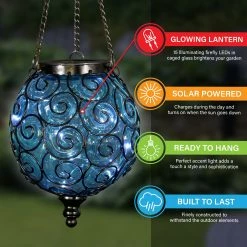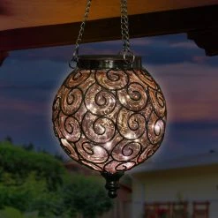 An elegant solar glass ball surrounded by a beautiful metal scroll design sets this gorgeous hanging lantern apart! A glow will automatically illuminate from within the ball at dusk with its string of 15 solar-powered LED firefly lights. Adds a dazzling touch to your garden!