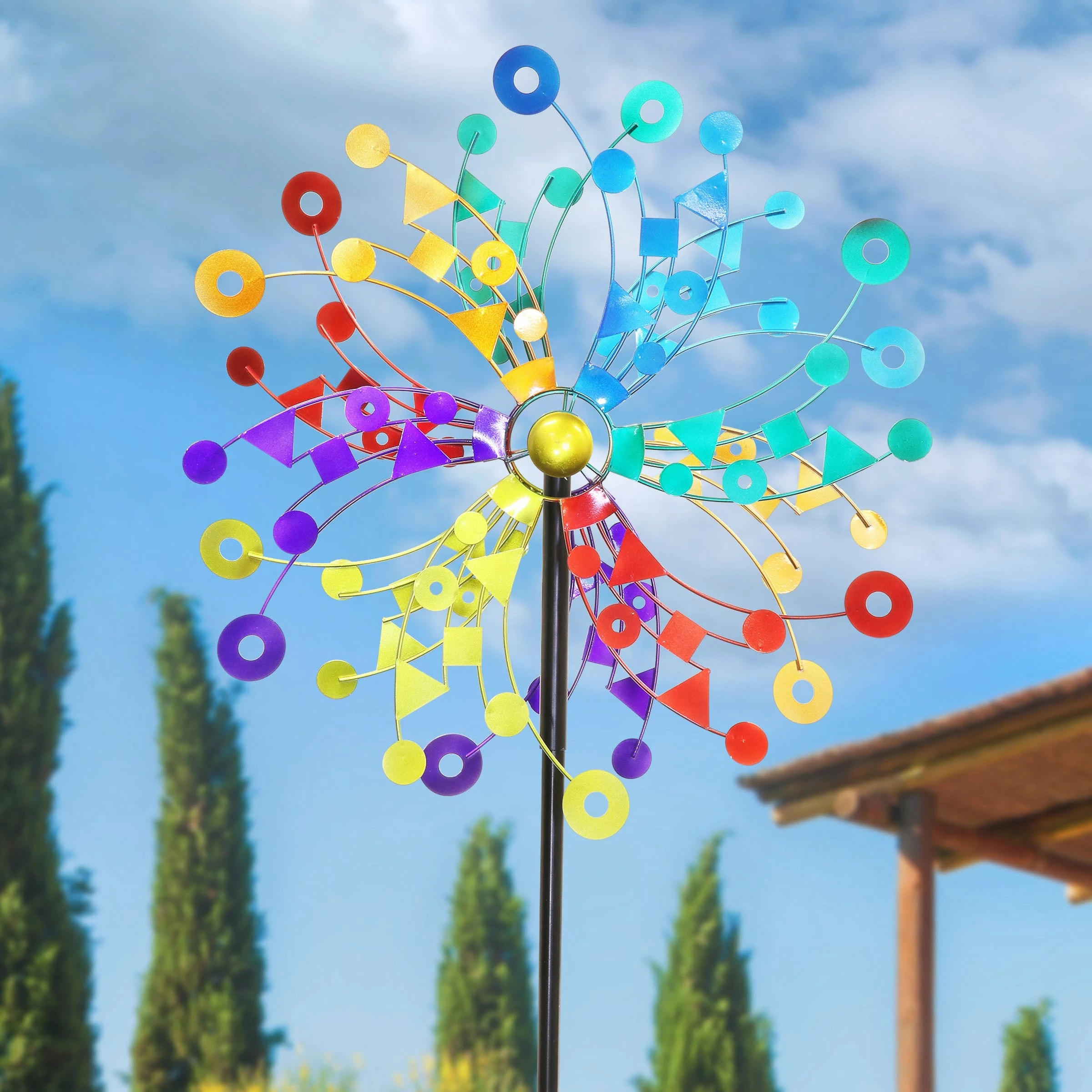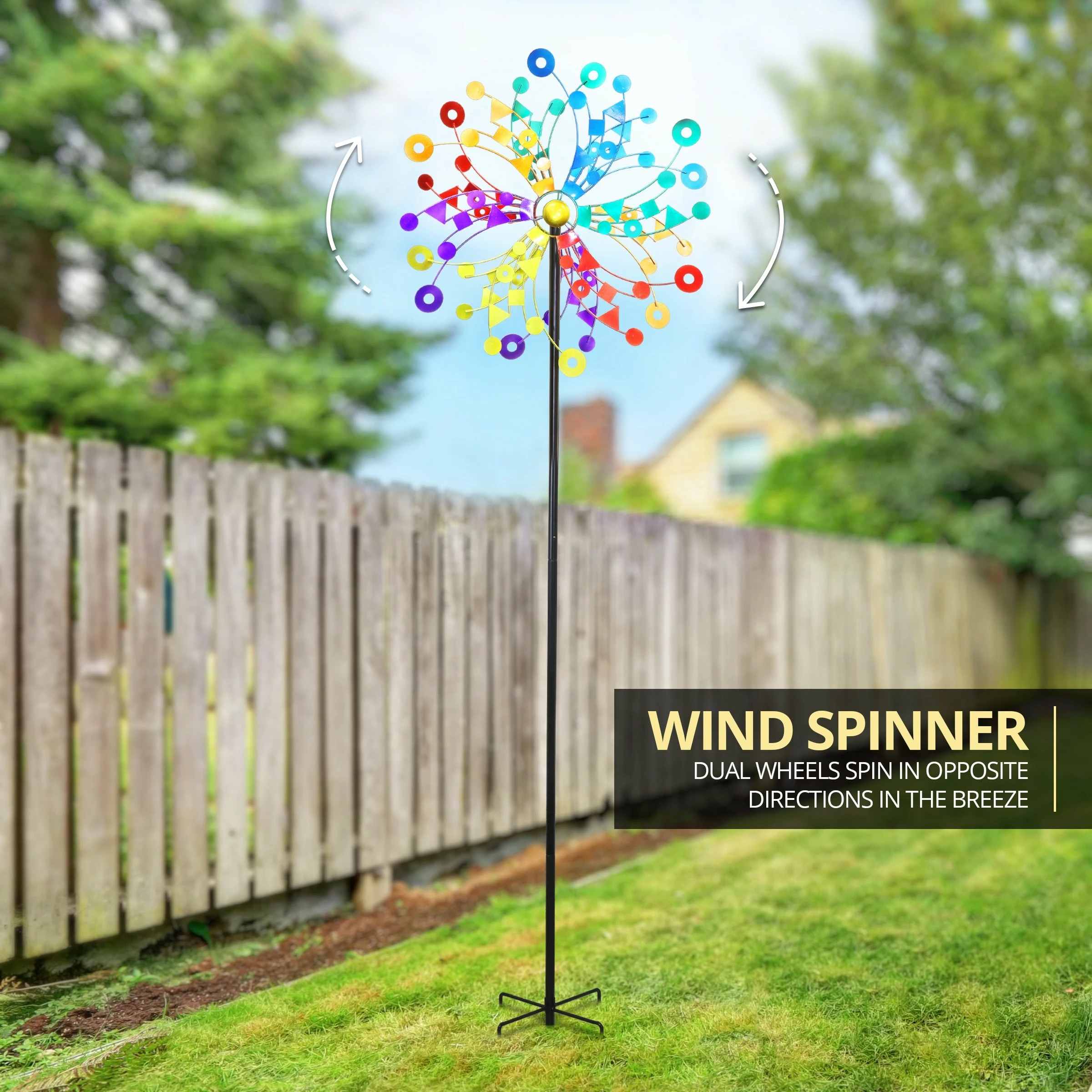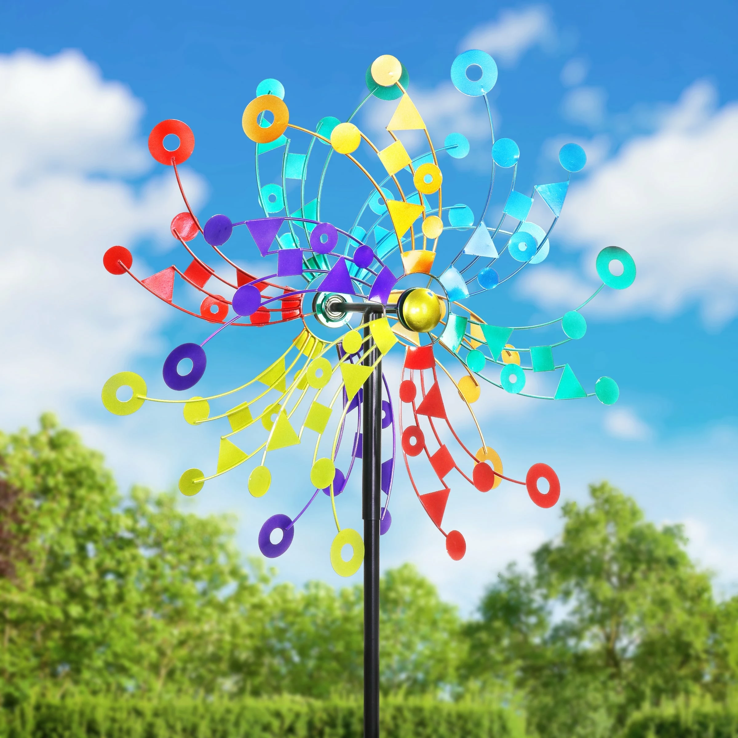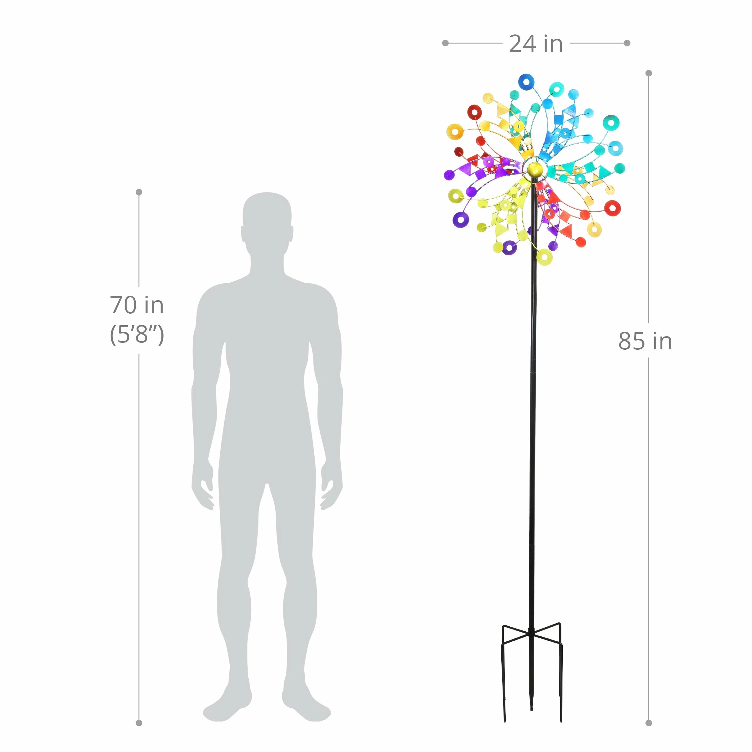 A kaleidoscope of colors bursts into your landscape as this giant kinetic garden stake spins delightfully in the breeze. The beautiful piece of moving art makes a perfect addition to any yard and an impressive gift for the garden enthusiast! This spinner stake is sure to become the center piece of your yard or garden.