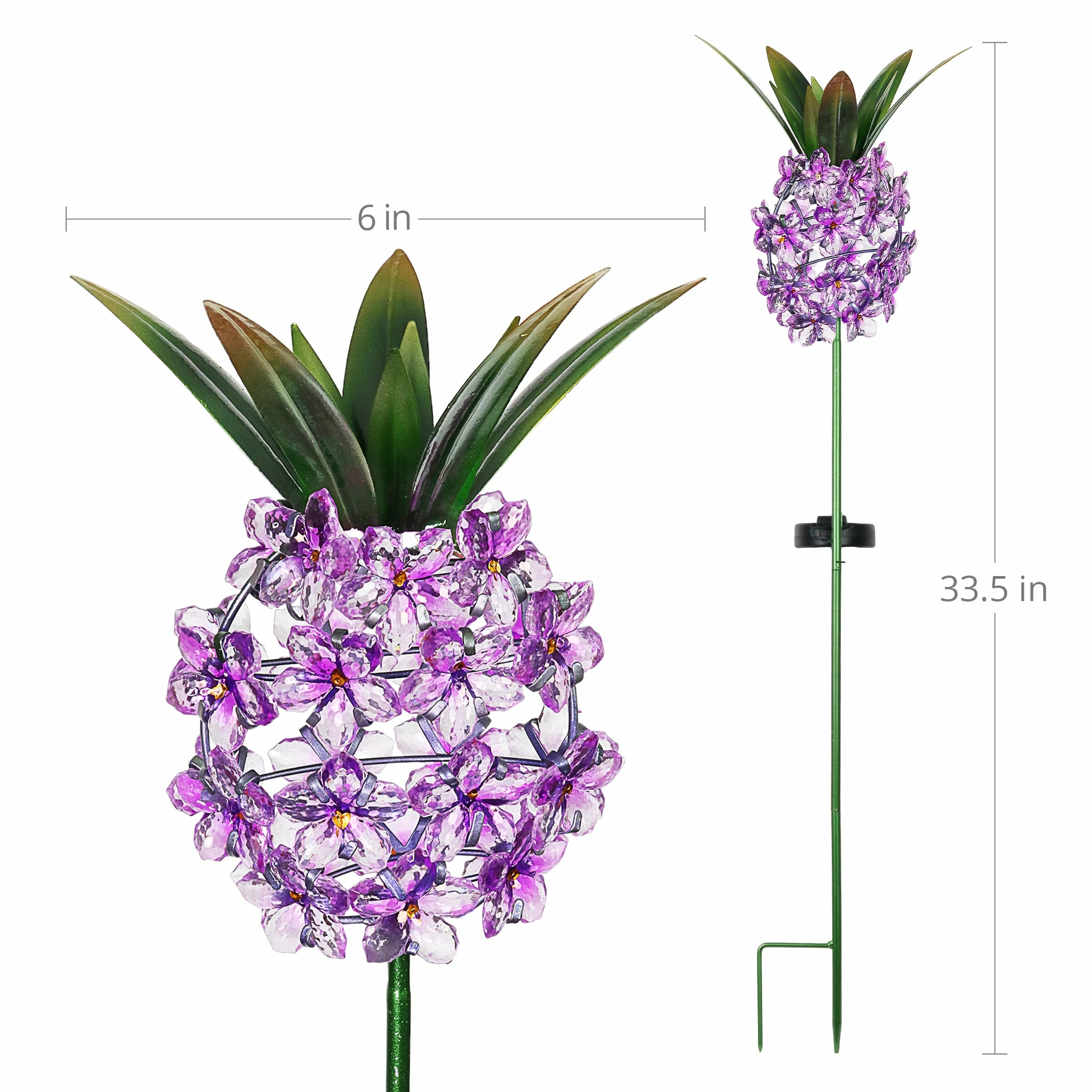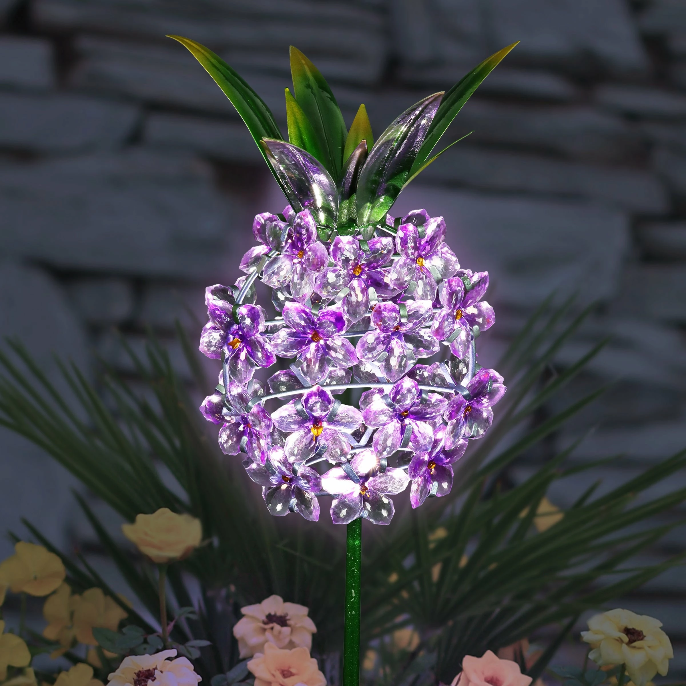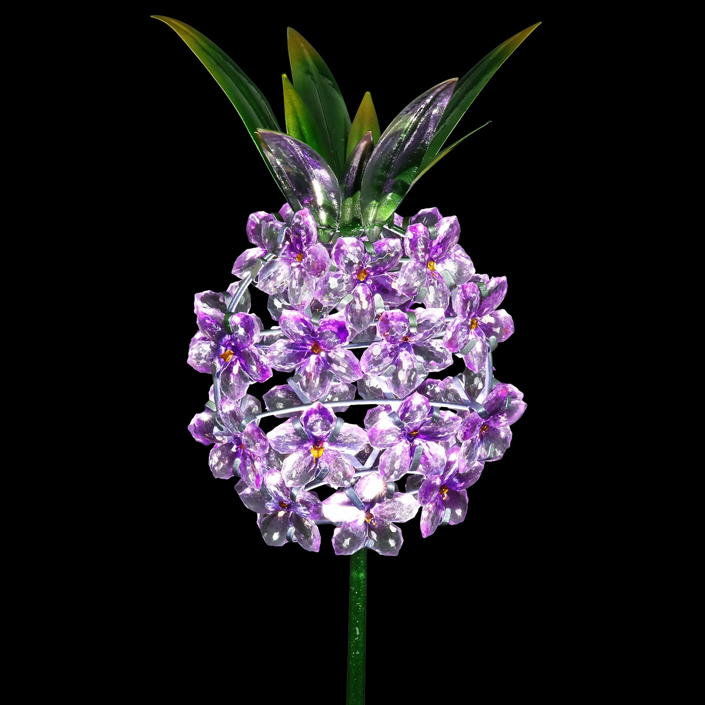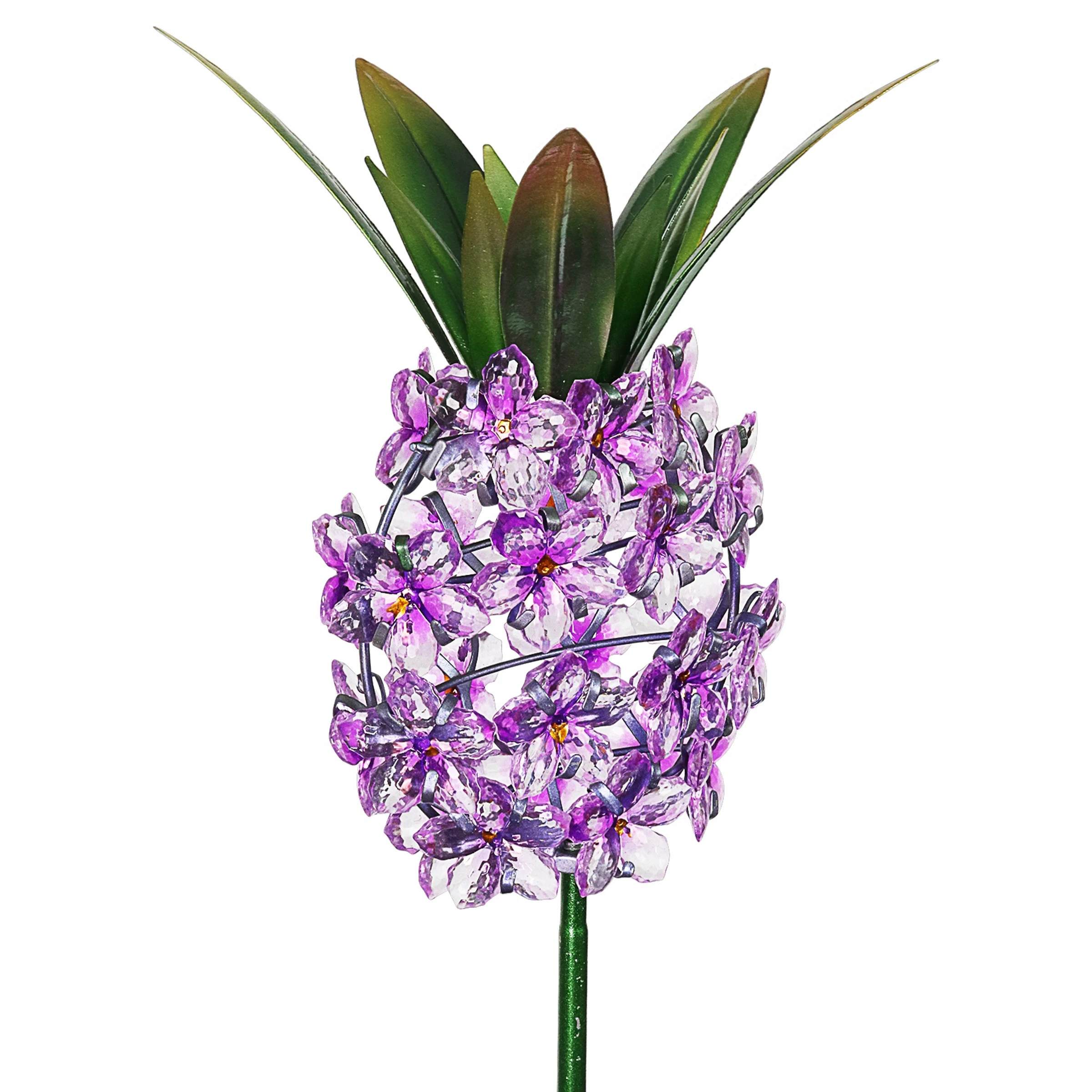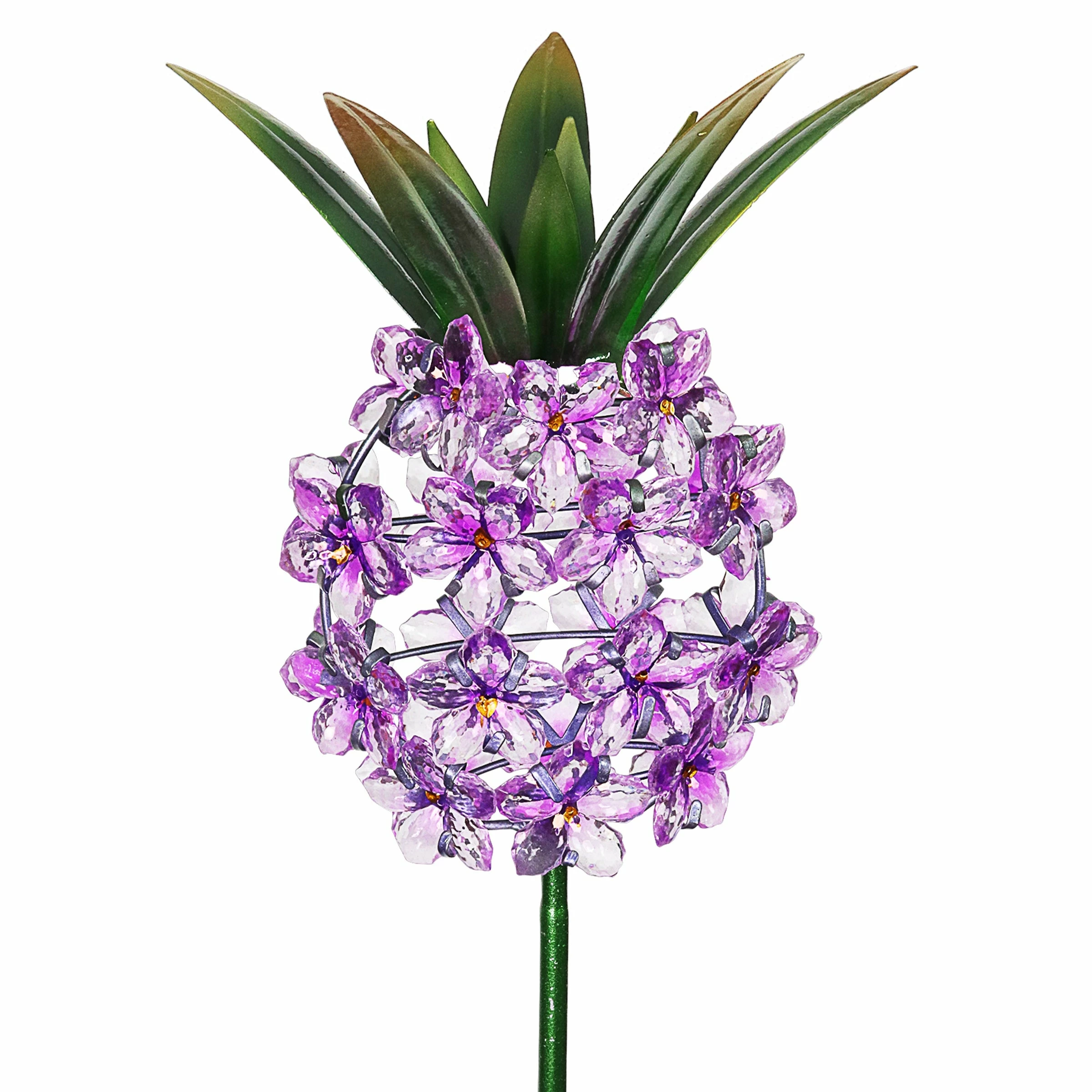 This charming Solar Pineapple Garden Stake adds a perfect glow to your garden! The beautiful acrylic flowers will illuminate with solar LED light while the painted metal leaf crown adds a decorative touch. The pineapple is a symbol of hospitality, making it a wonderful addition to your home and a great gift idea.