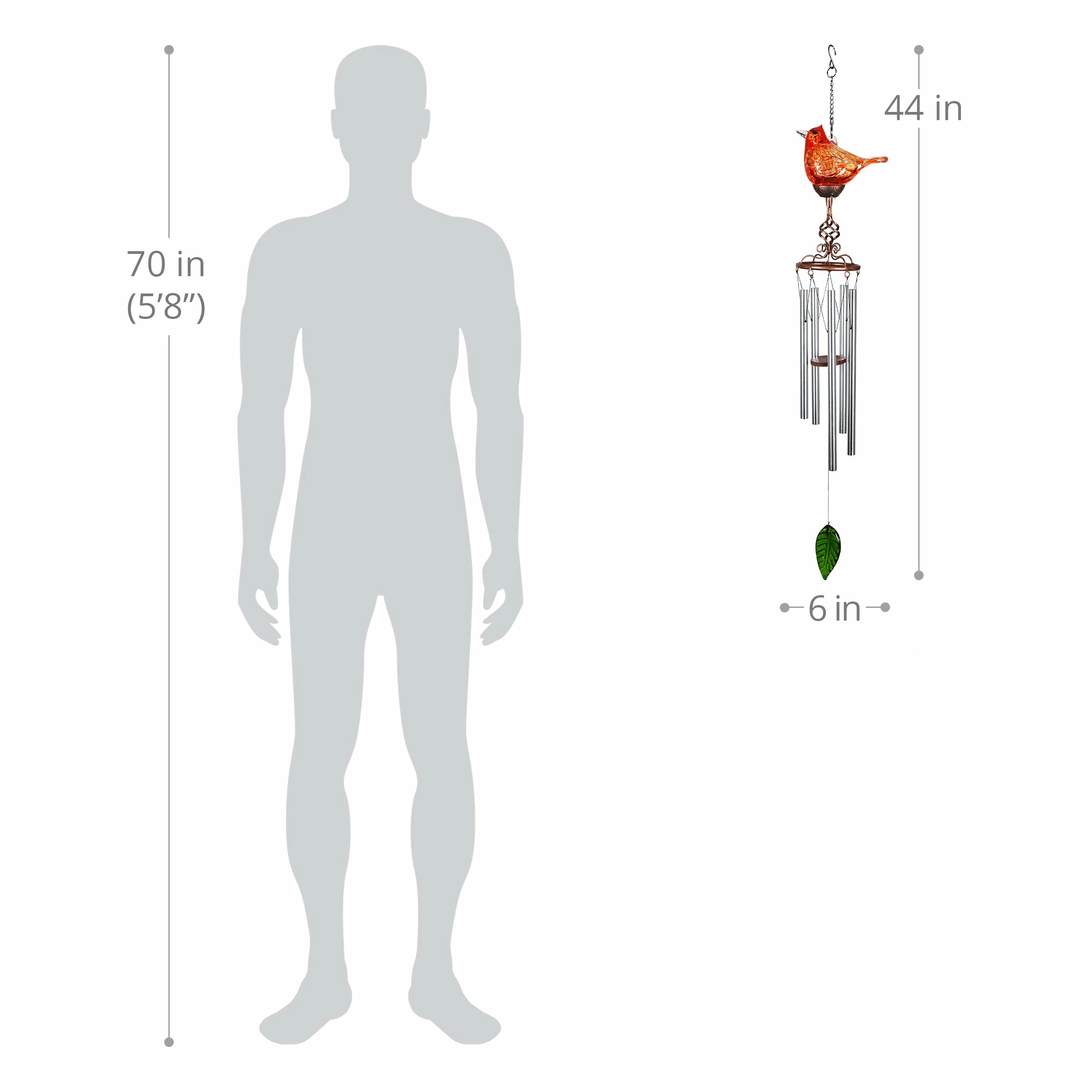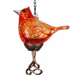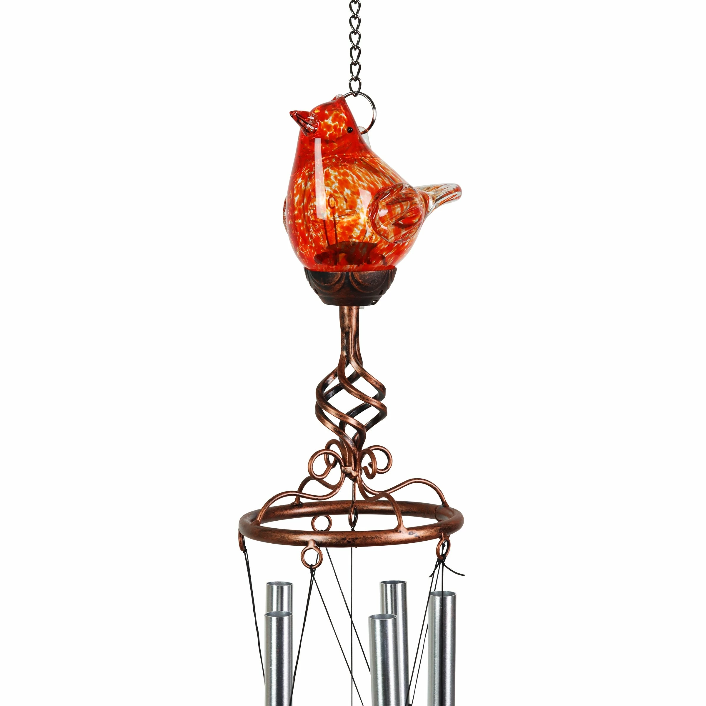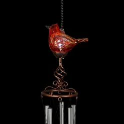 This exquisite Solar Red Cardinal Wind Chime adds gorgeous color, life and music to your garden day and night. As the sun sets and dusk settles in, the beautiful hand blown glass design will glow from within. Hand tuned metal chimes will sing in the breeze. The spiraling metal finial adds an extra touch of elegance to your landscape. Representing love and devotion, the red cardinal makes a thoughtful gift and a charming addition to any home.