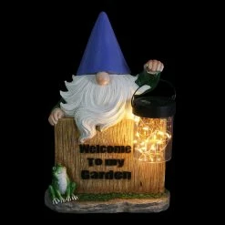This adorable gnome is peaking over a welcome fence with a jar full of illuminating fireflies! At dusk, the solar powered LED lights will magically illuminate in the jar, bringing this adorable garden art to life. Beautifully hand painted details make this garden statuary a charming addition to your home or garden and a great gift idea for the animal lover too!