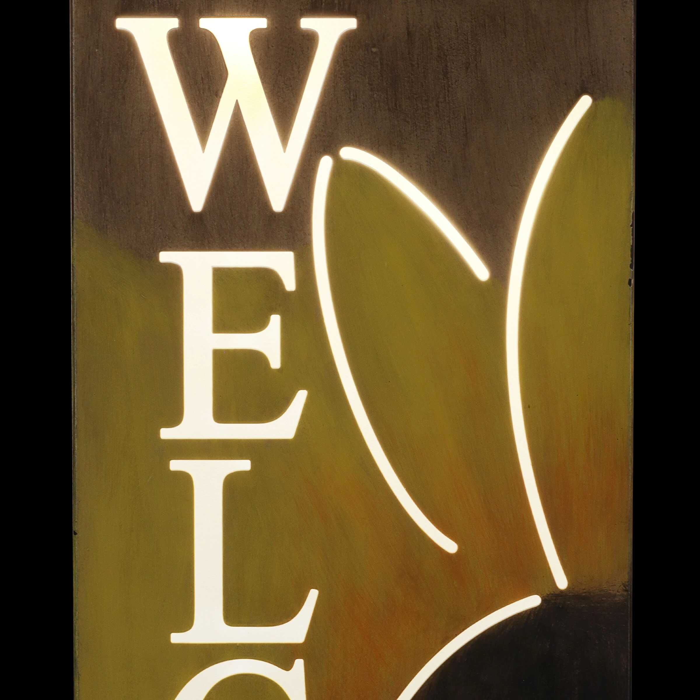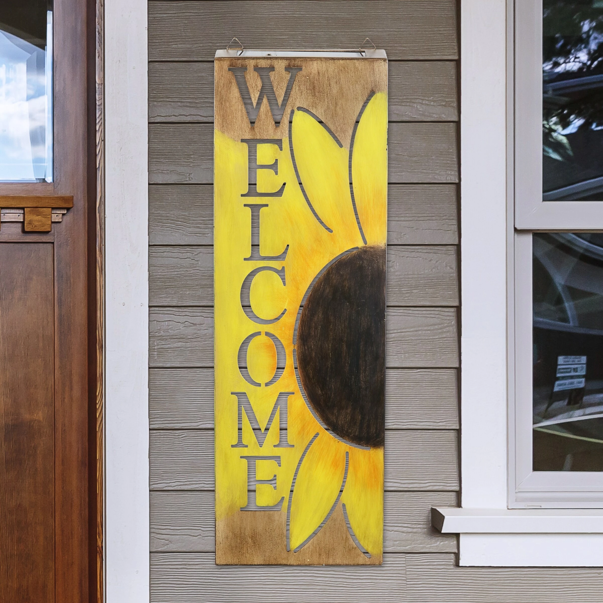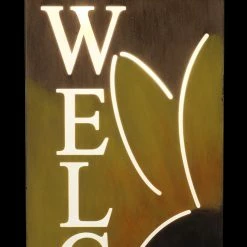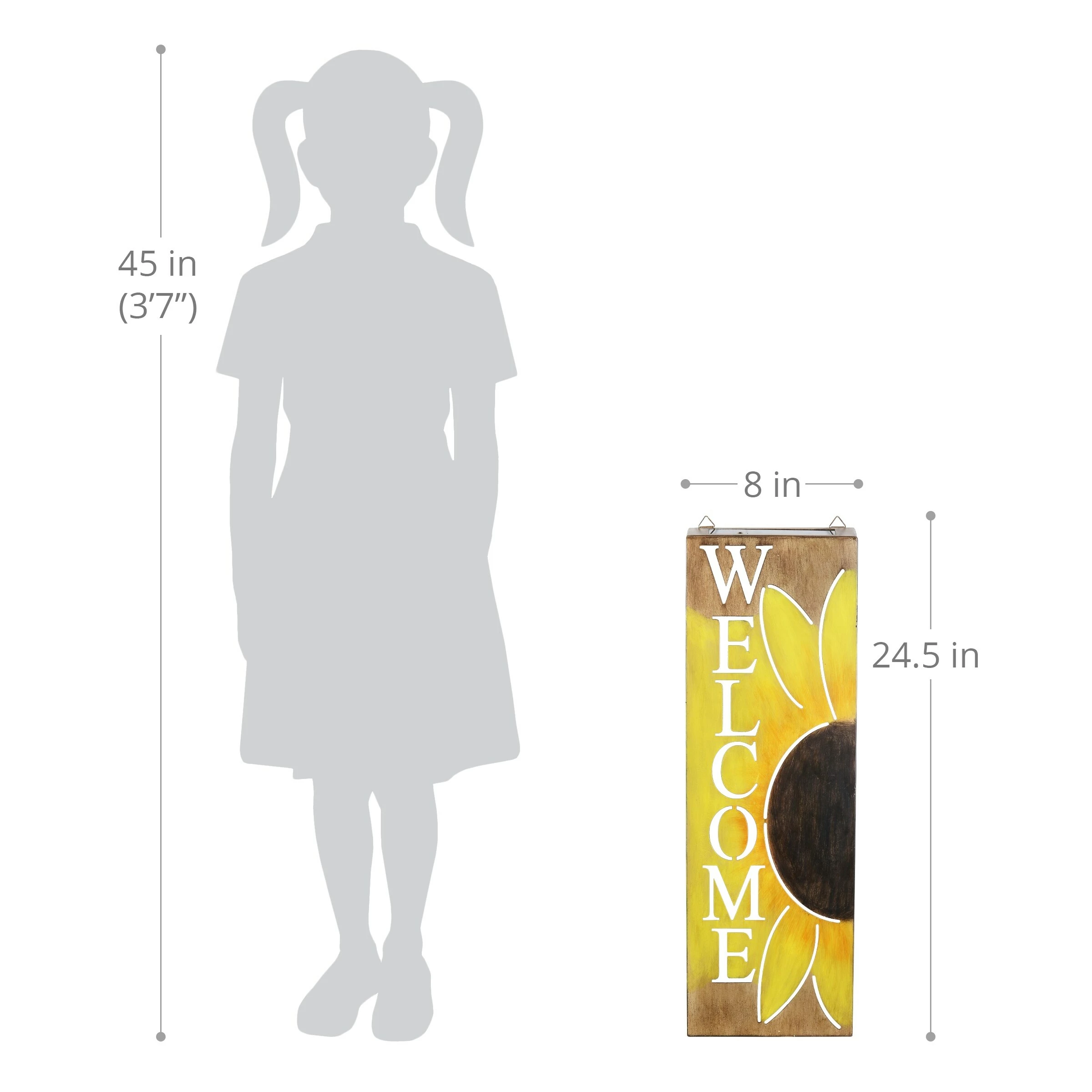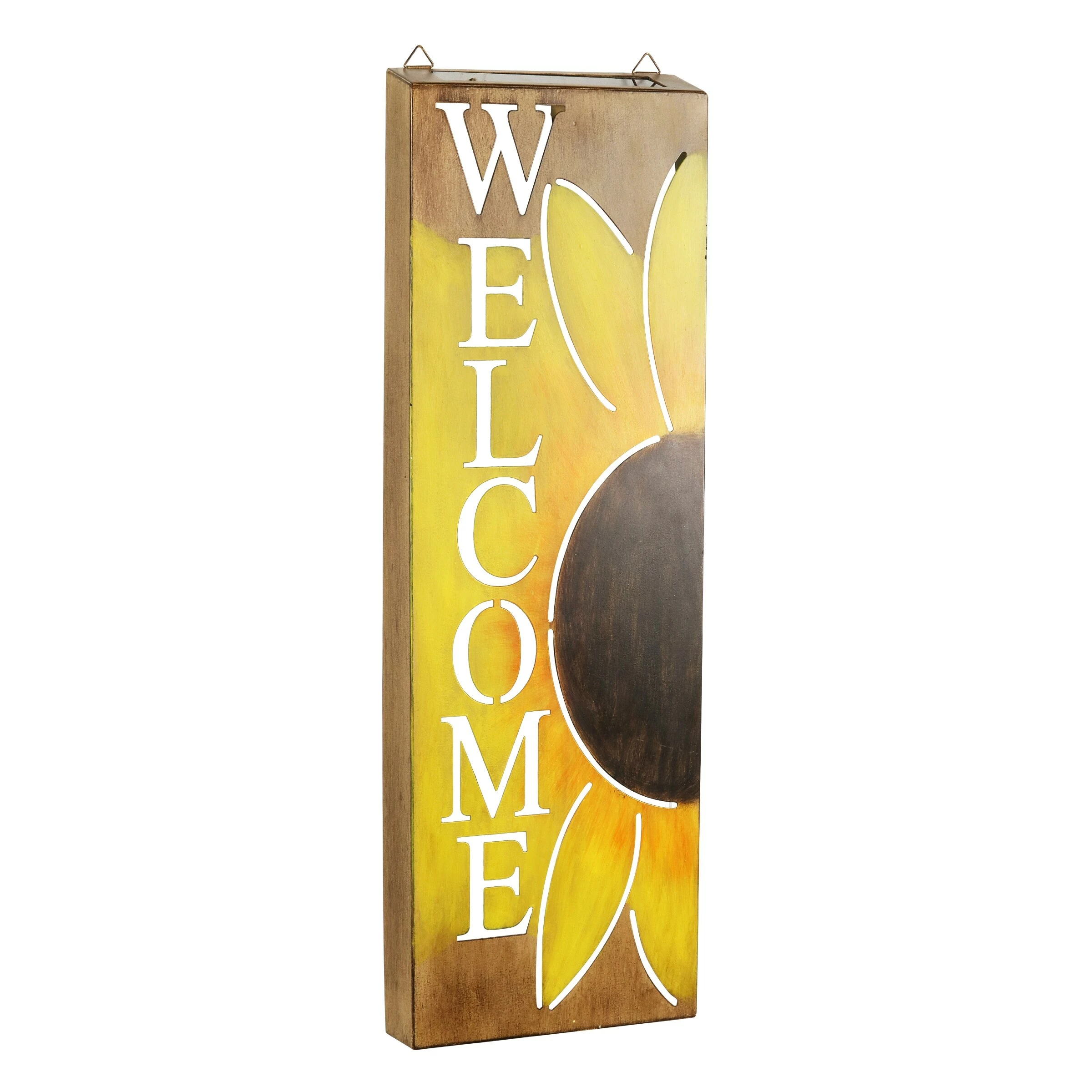 Hang this stunning Solar Sunflower Welcome Sign and be dazzled by the beautiful design. At dusk, the metal sign will automatically glow with solar powered LED light, welcoming visitors day or night! This charming art will look great on any wall or fence in your garden. Makes a heartwarming gift for the garden enthusiast in your life!