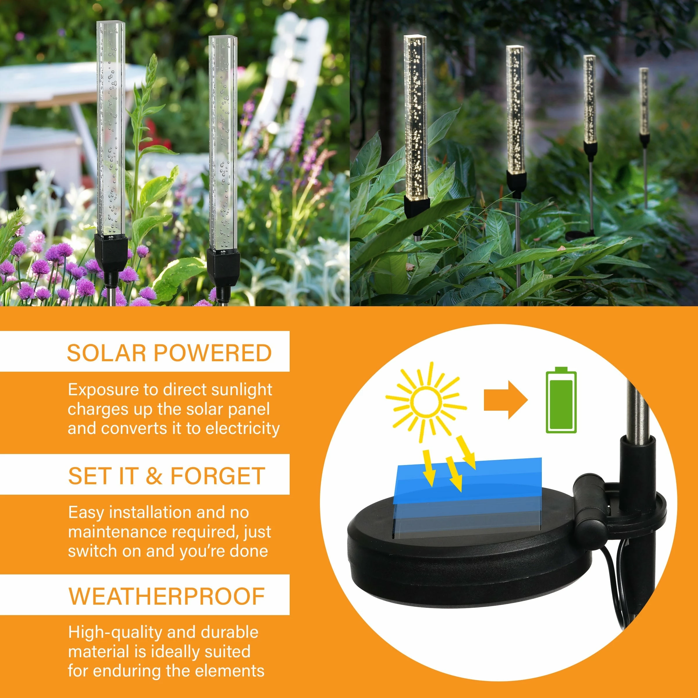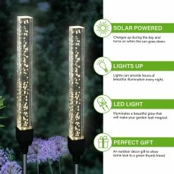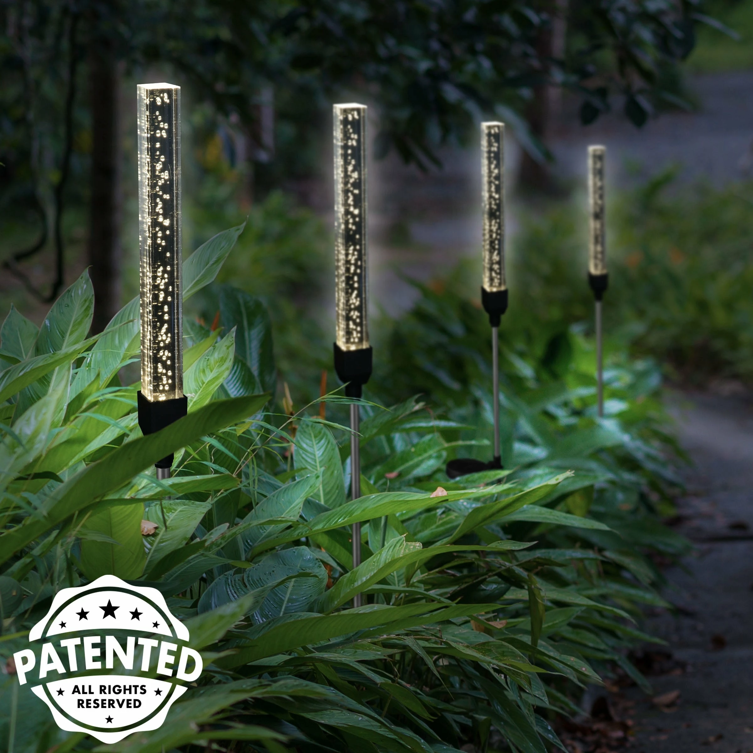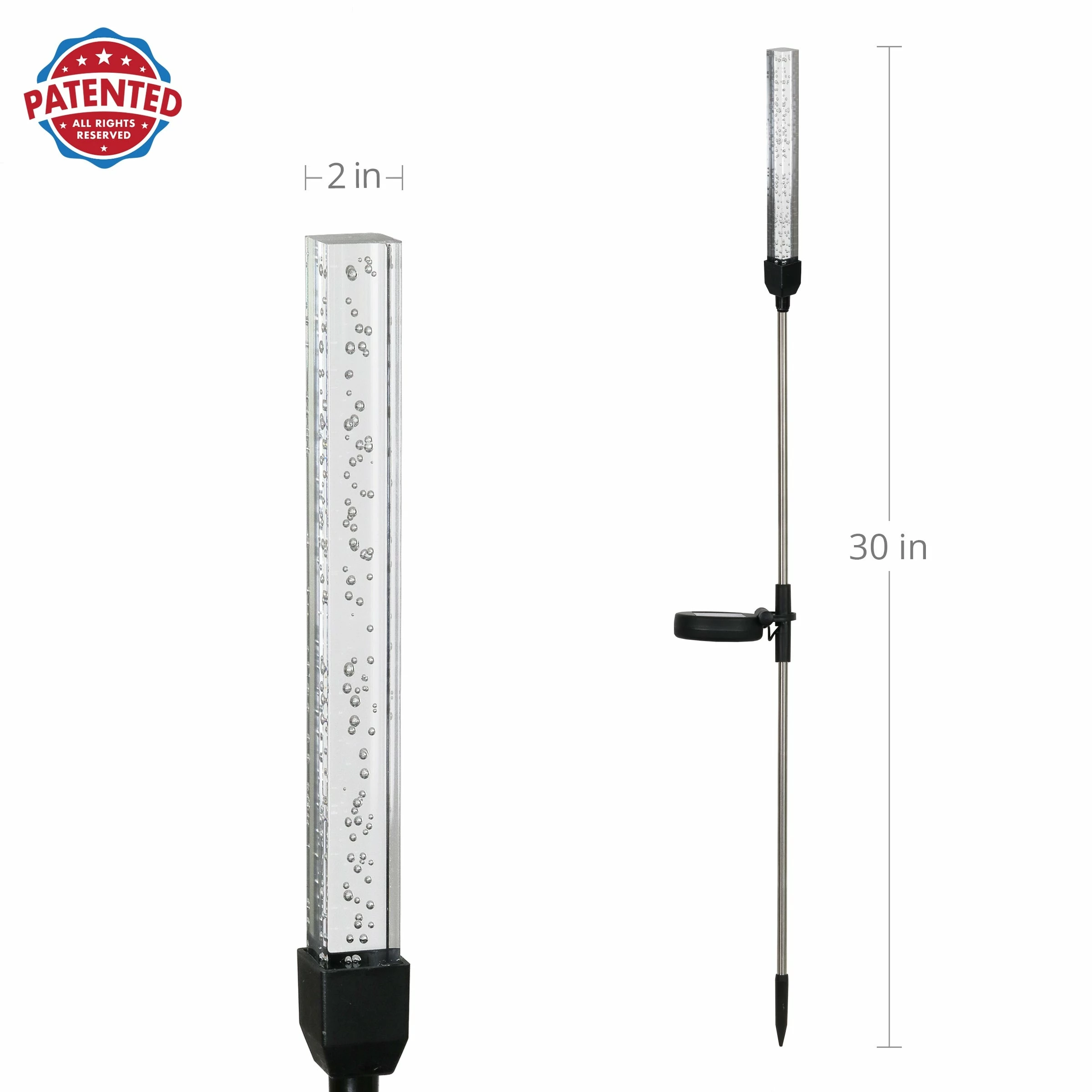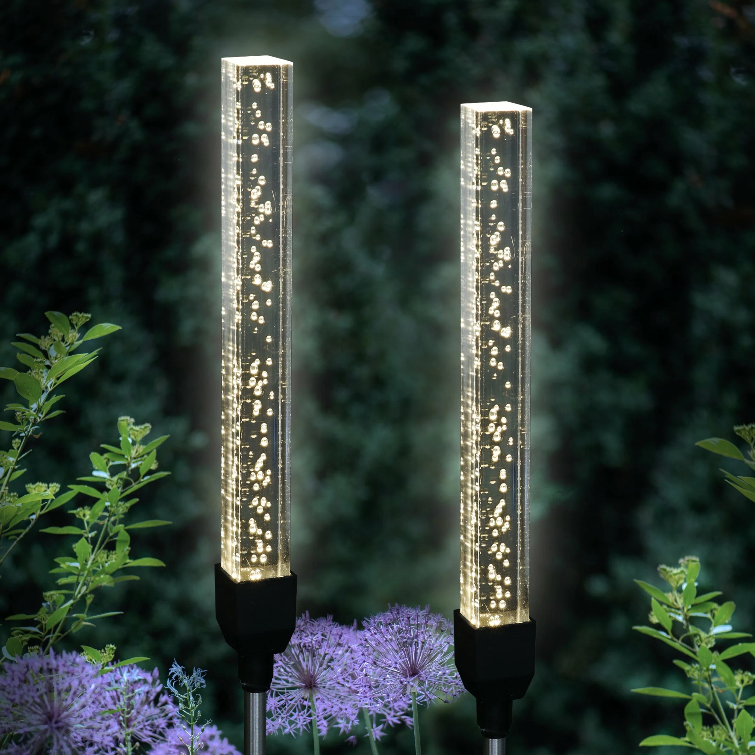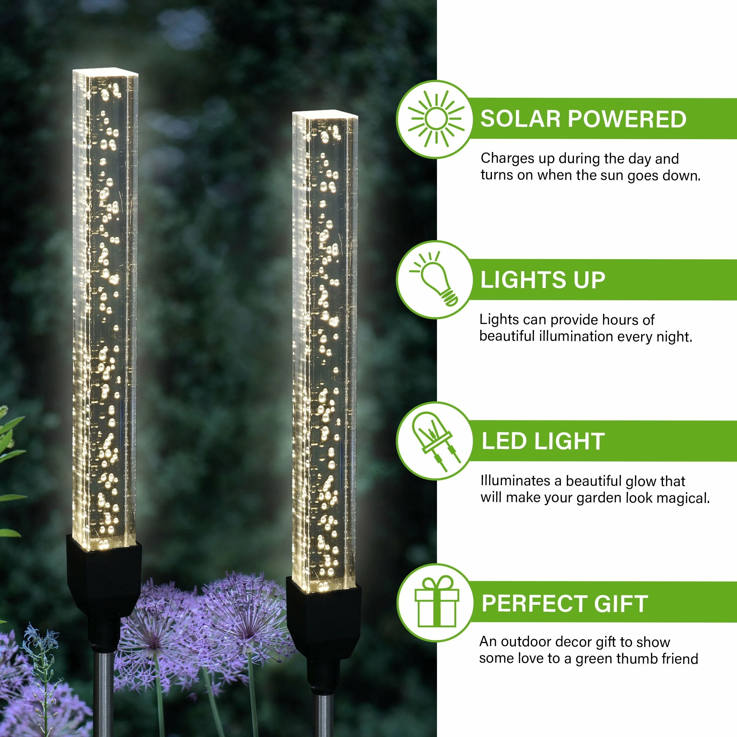 Experience the magic of these solar LED stationary bubble garden stakes! At dusk, the solar LED light automatically glows, highlighting the stationary bubbles that seem to float inside the stake. These beautifully designed square acrylic stakes will fill your garden with charming ambiance! Makes a wonderful and stylish addition to your garden.