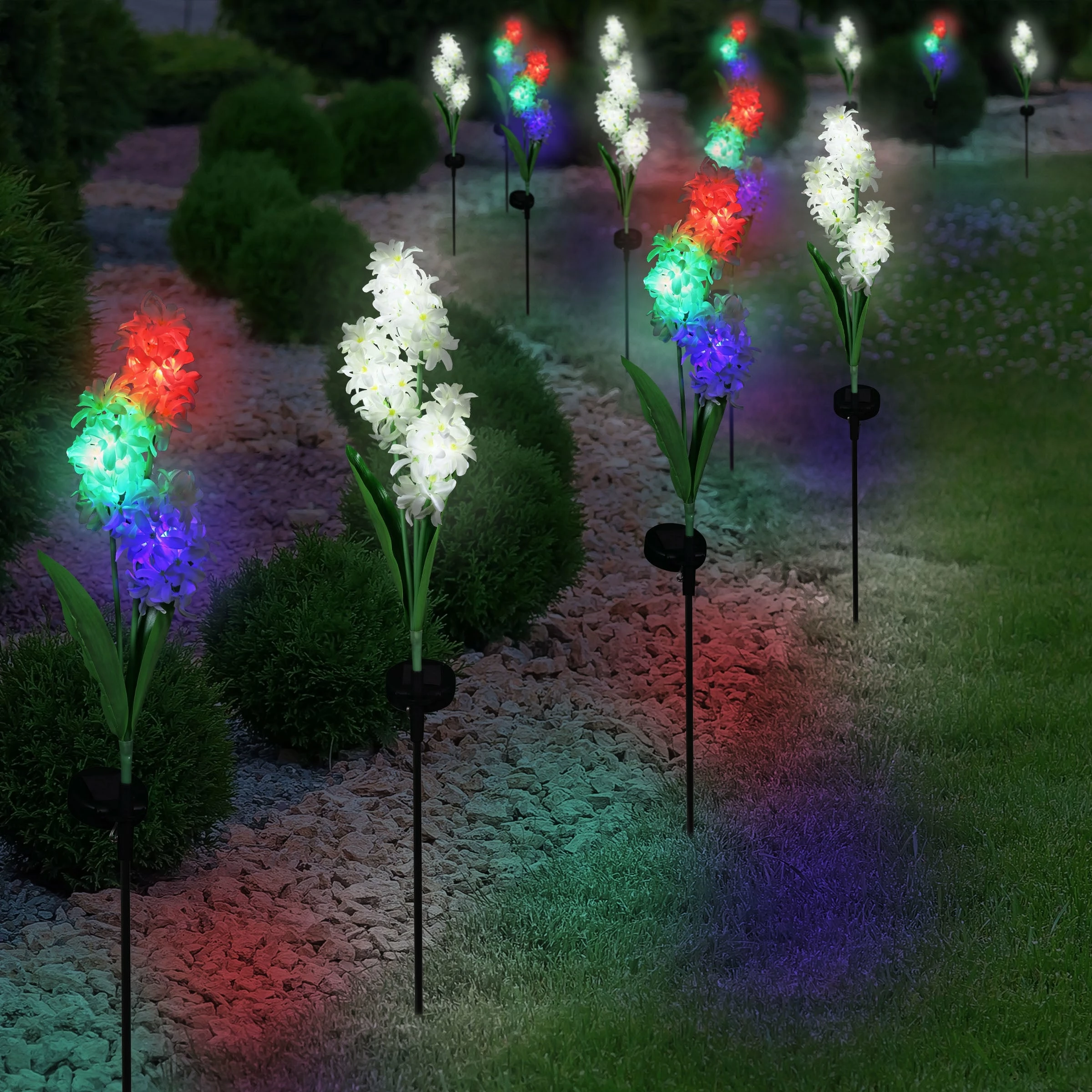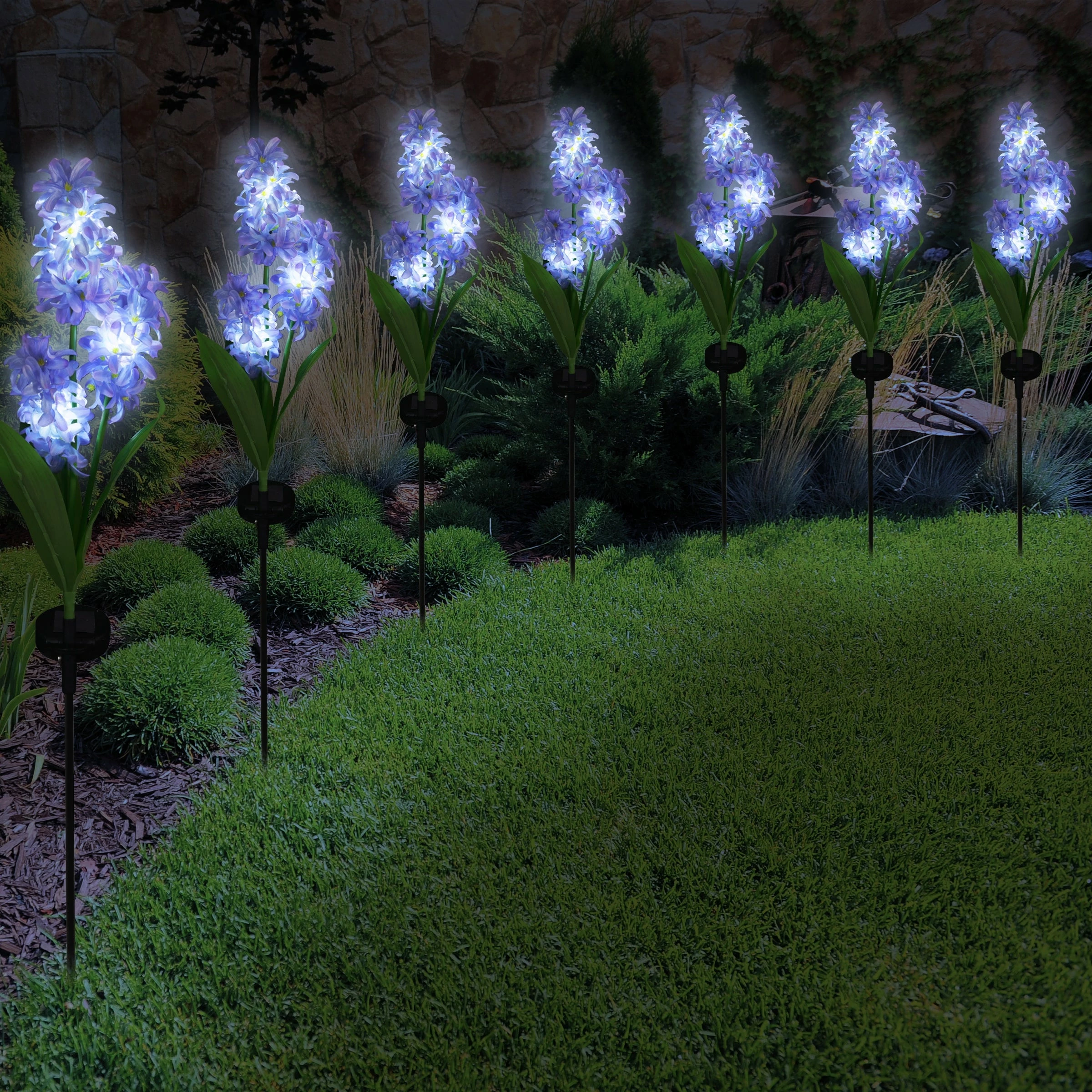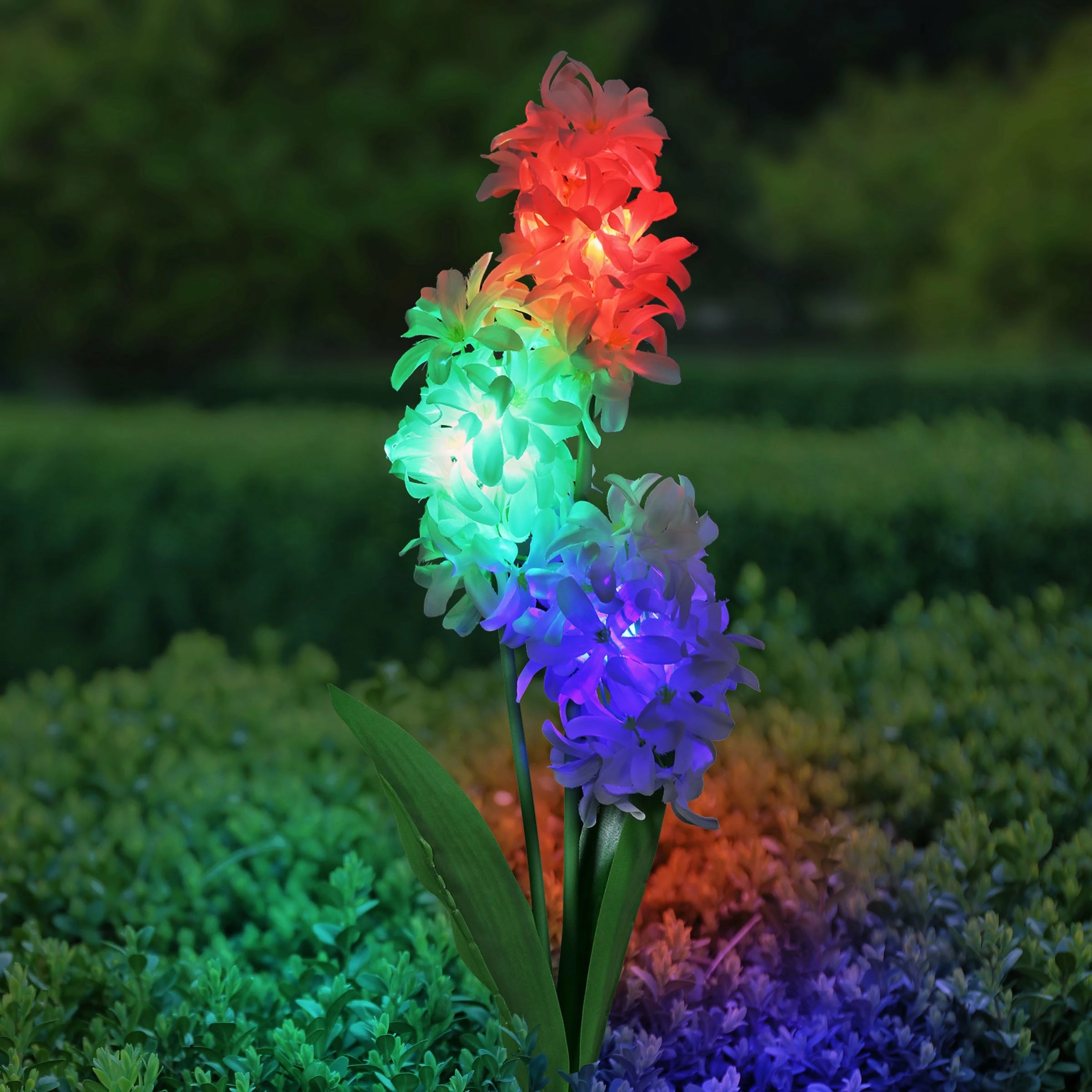 This beautifully crafted lilac flower stake will stay in bloom all year long! Each of the three fabric lilac clusters will illuminate with solar powered LED lights! This enchanting garden stake is sure to add joy to your garden. Makes a wonderful gift idea as well.