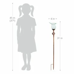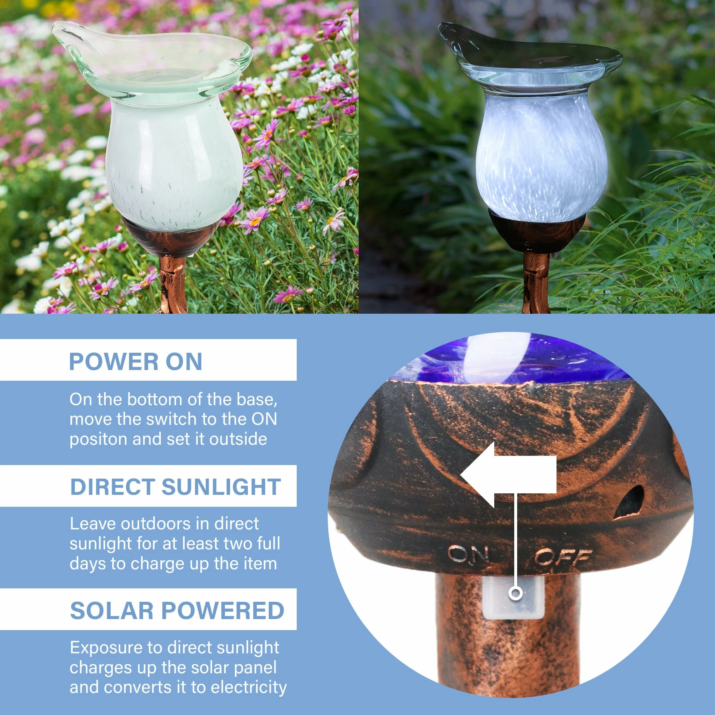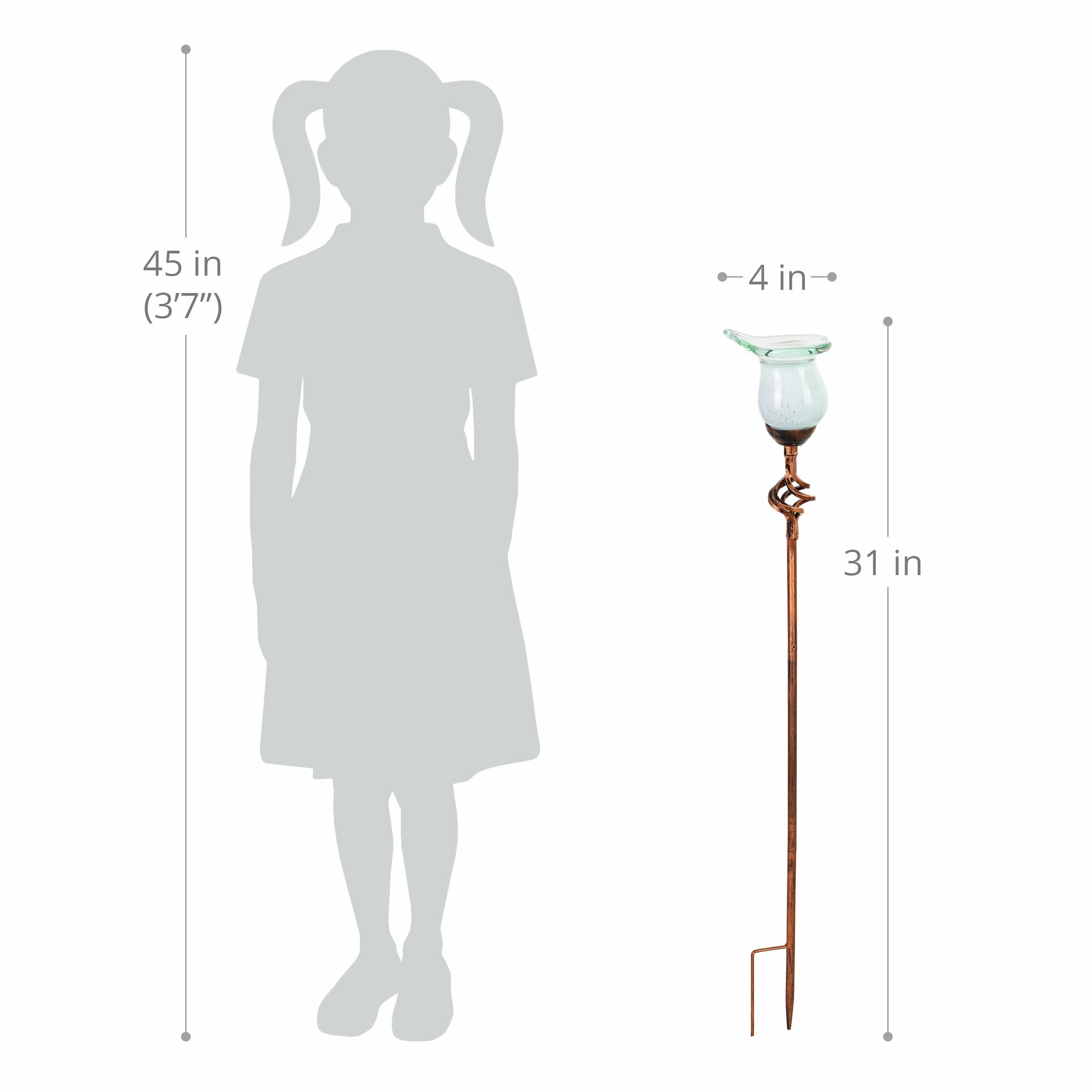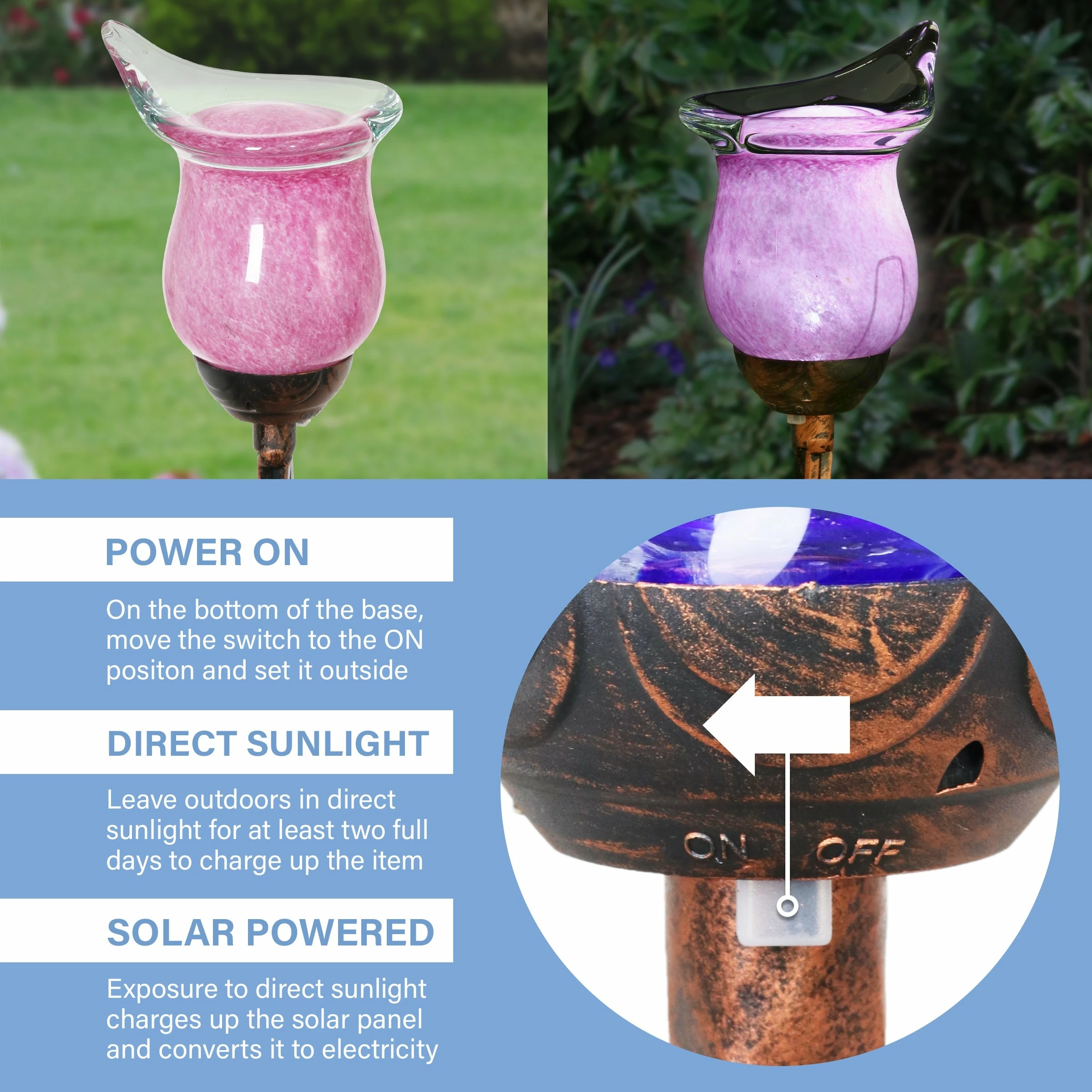 Create an elegant and colorful garden with glowing solar garden stakes! A glass calla lily stake adds a touch of beauty and romance to your garden day and night, all year long. This illuminating flower not only glows at night, but it is always in bloom, year round, no watering required. It is crafted in beautiful, hand-blown glass with a spiraling metal finial detail. With an energy efficient solar panel, this garden stake will charge in the sun during the day and automatically glow at dusk. It’s what we like to call, effortless elegance! Makes a wonderful addition to any home and a fabulous gift idea too.