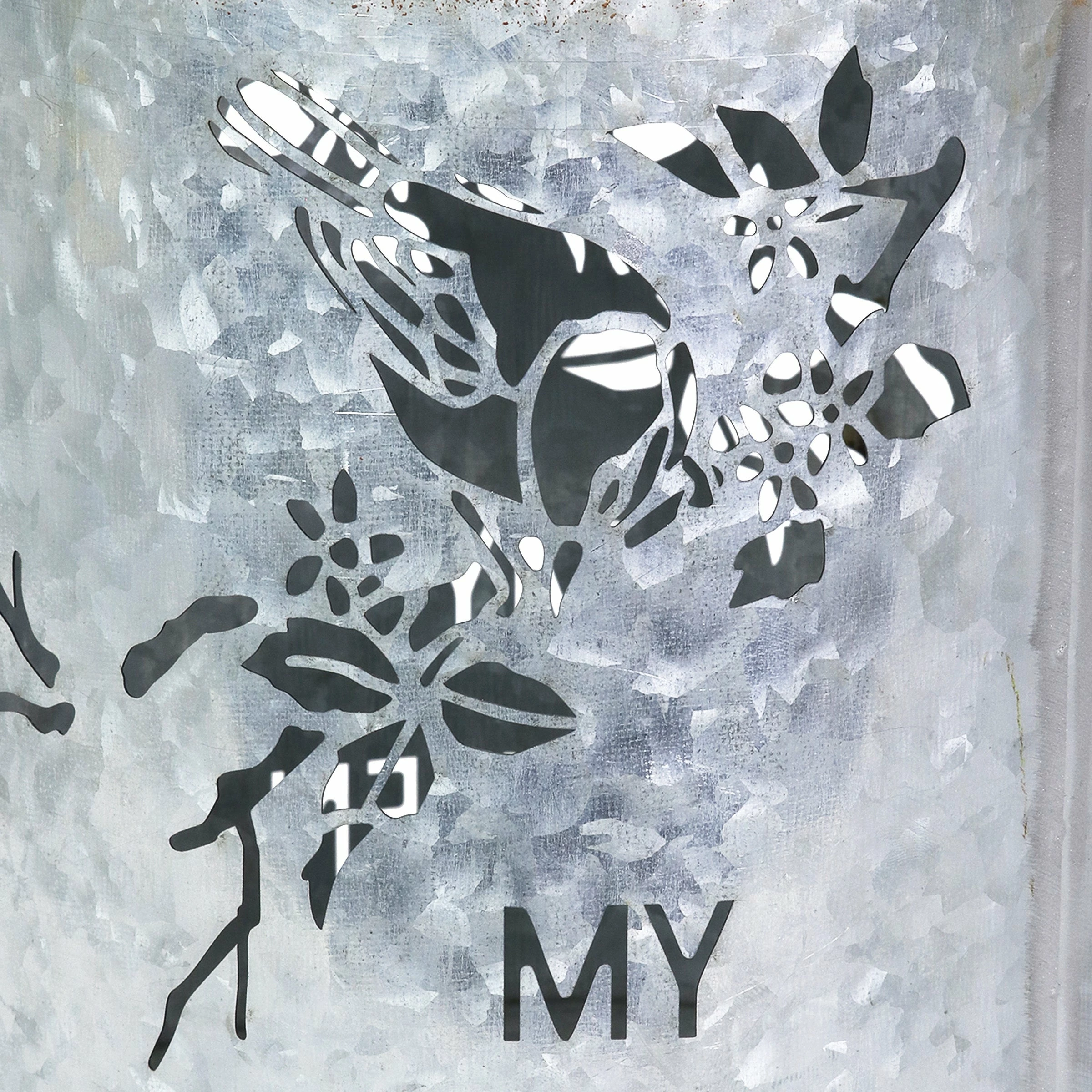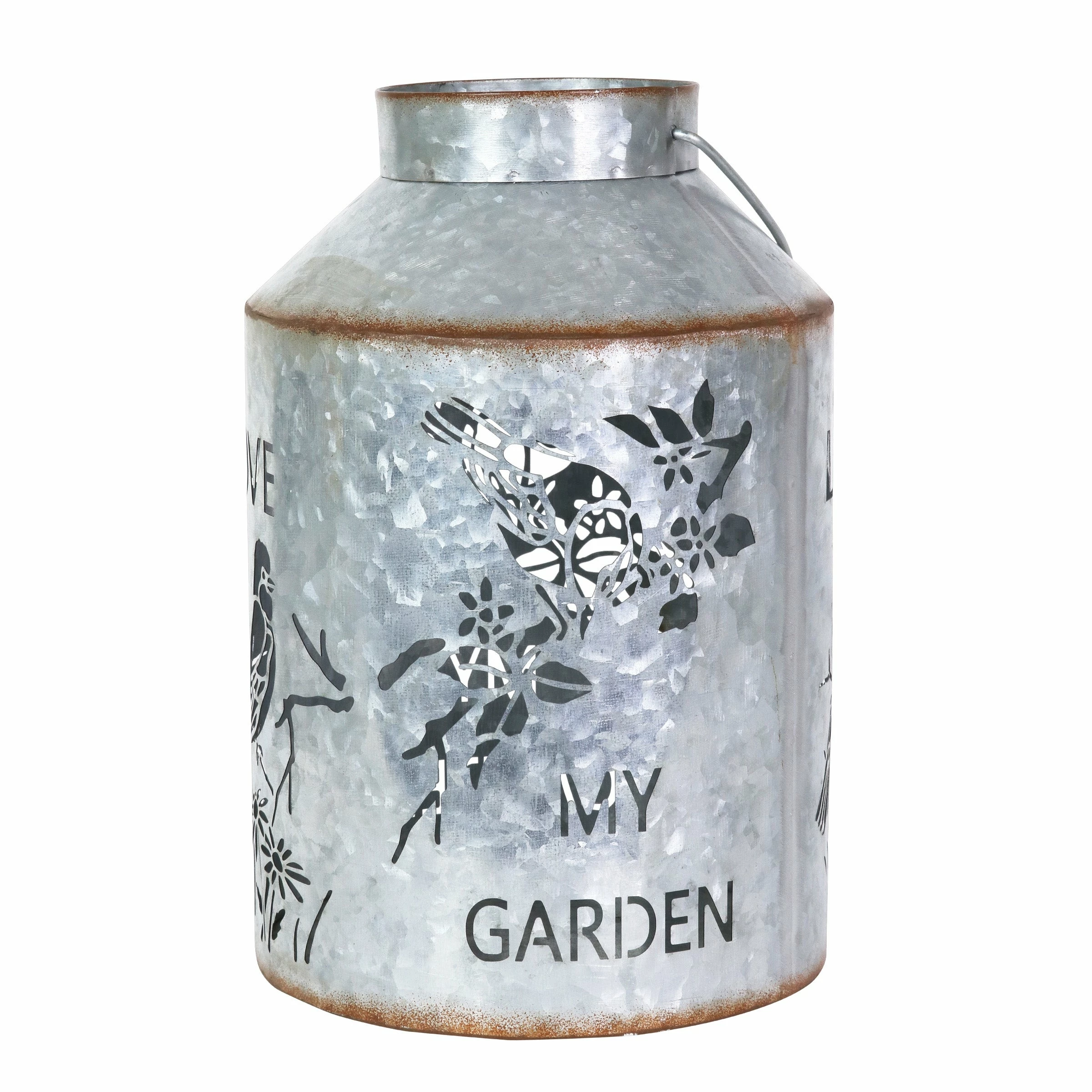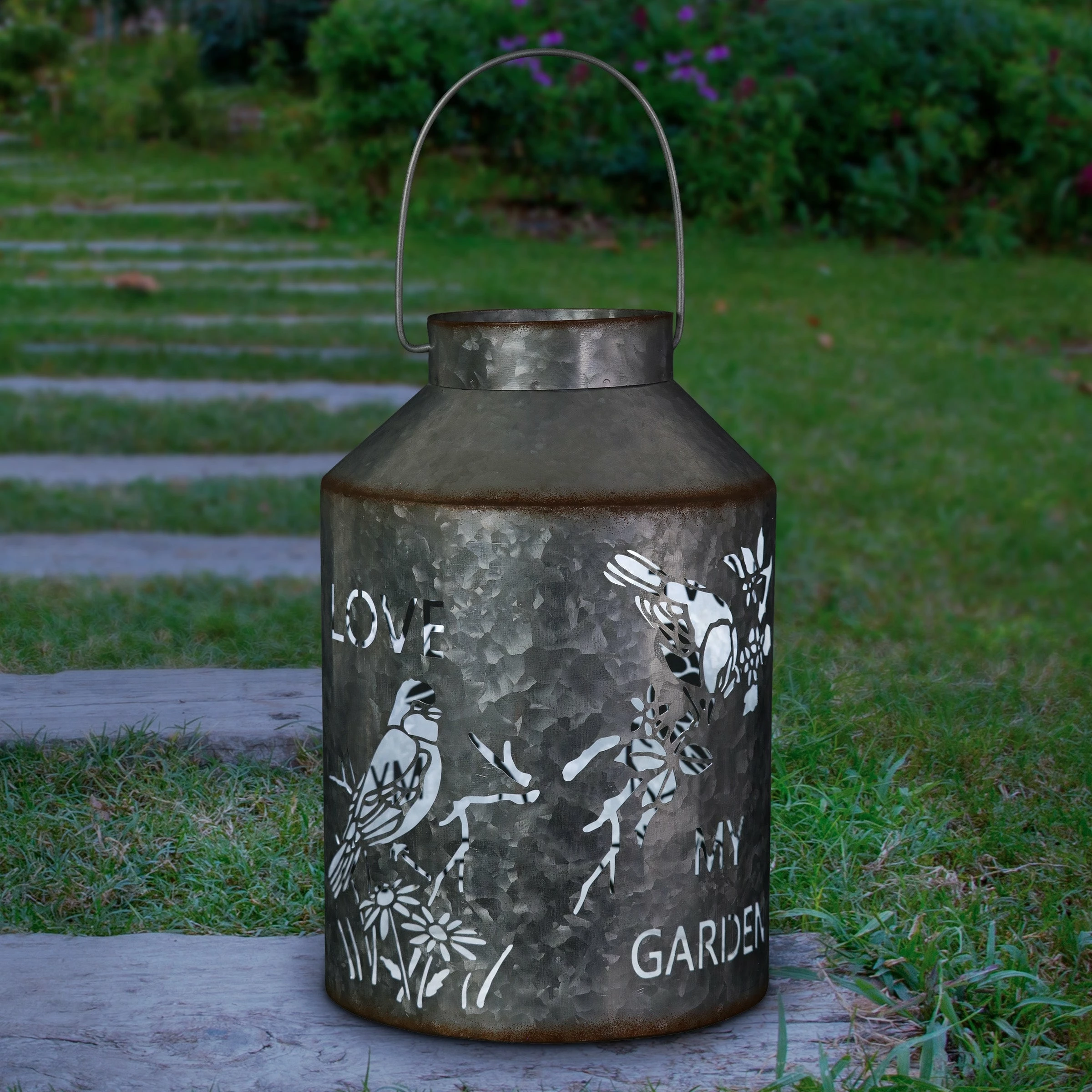 A beautiful stamped metal bird on a branch design will illuminate from within this decorative rustic lantern. As the LED light automatically glows at dusk, so will the message “MY GARDEN”! Makes a heartwarming addition to your garden and a wonderful gift idea too!